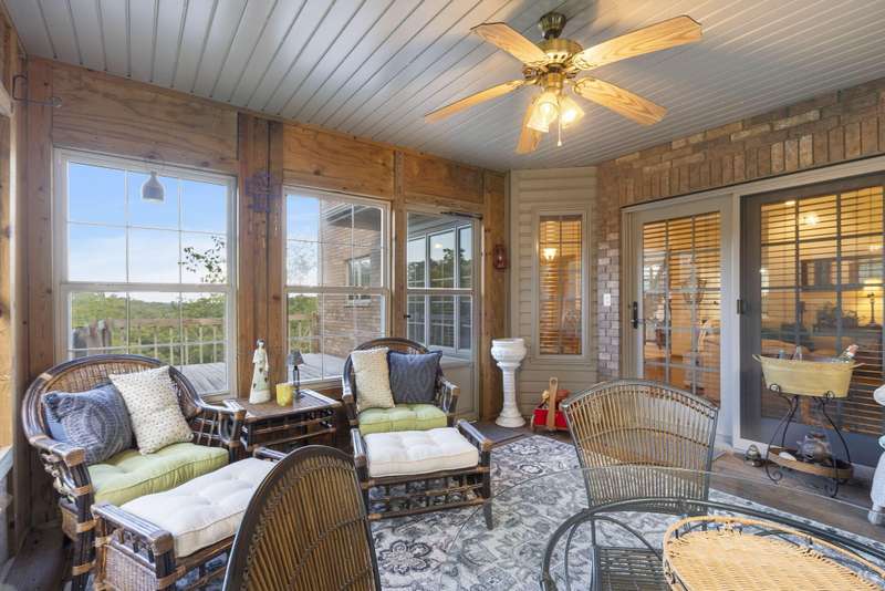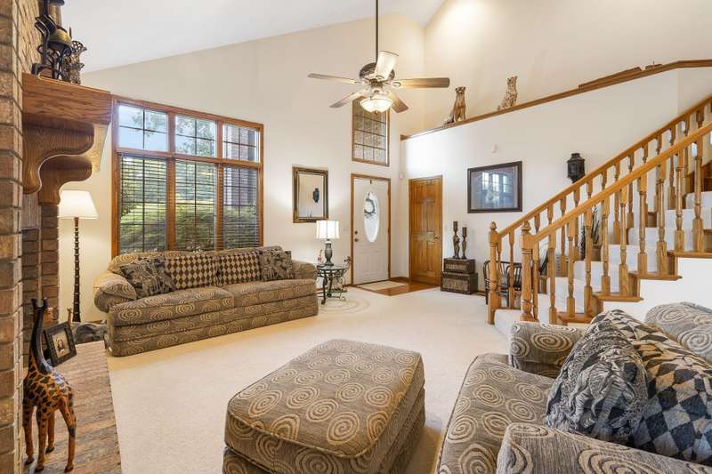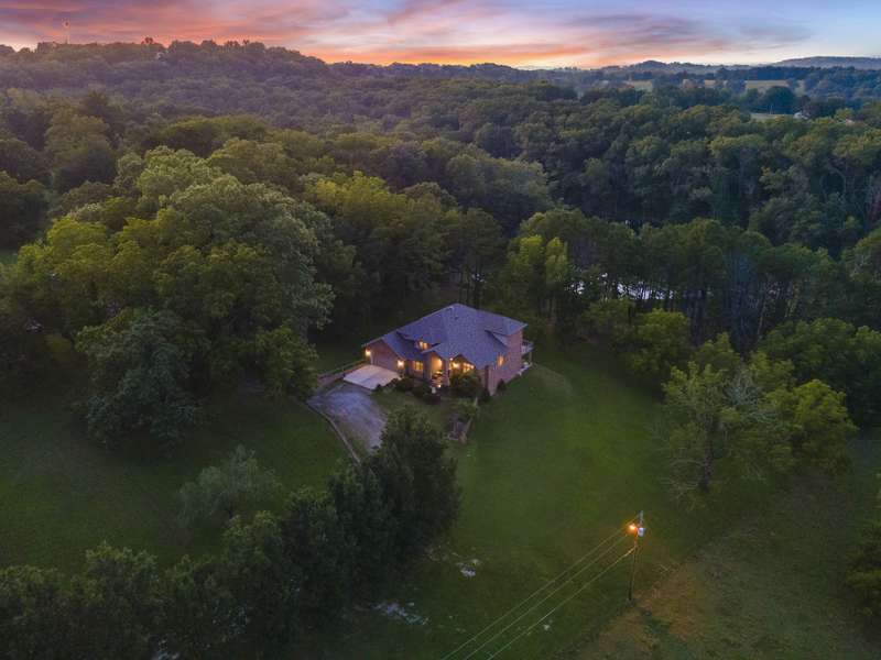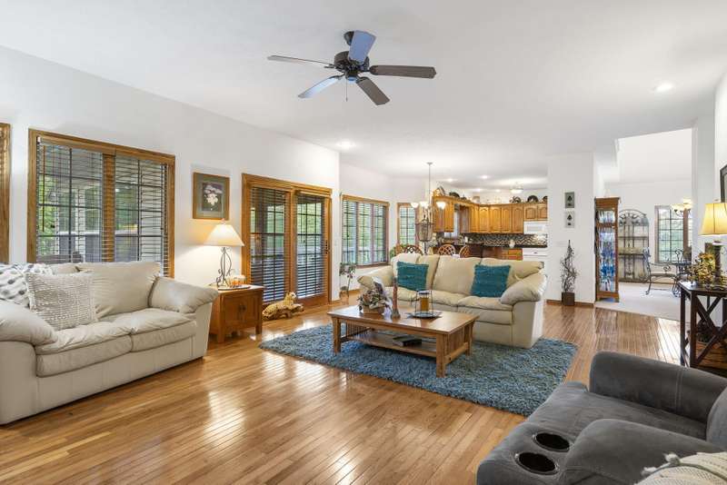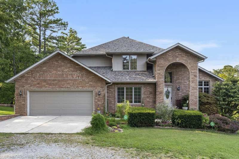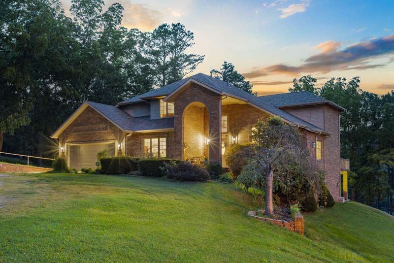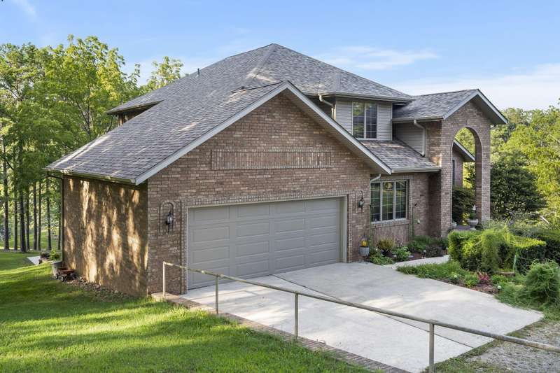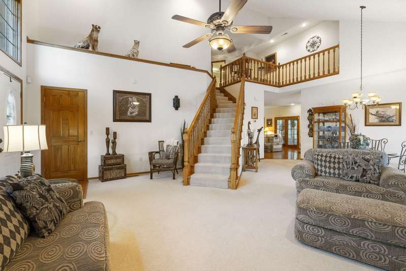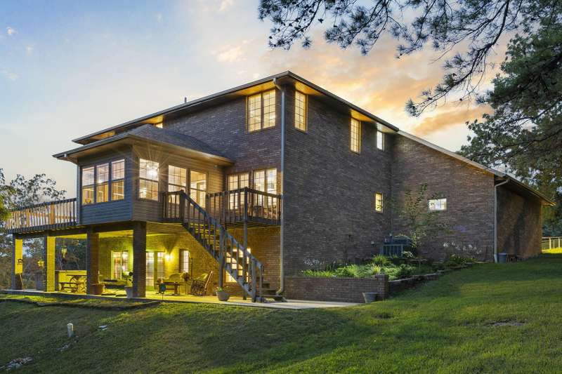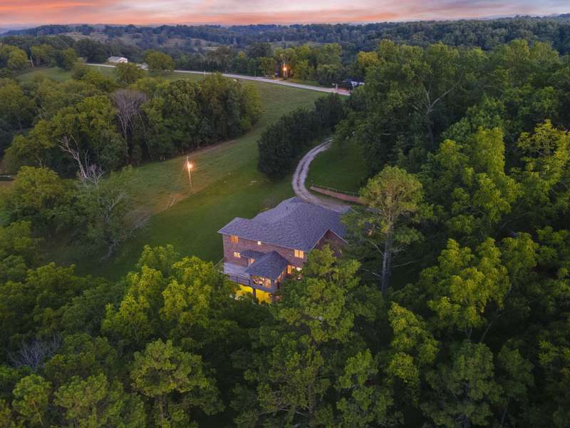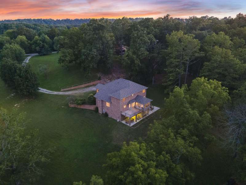 This magnificent 5-bedroom, 4-bath residence boasts a 2-car attached garage and a walk-out basement, nestled on an expansive 11-acre +- estate. Surrounded by breathtaking rolling hills, mature woods, and captivating water views, this home offers a private lake. The towering covered entry opens up to a grand living room, with soaring ceilings anchored by a floor-to-ceiling brick fireplace. Neutral tones and plush carpeting create a cozy ambiance with natural light from large windows. Ascend the grand staircase to the loft, overlooking the first floor. Here, you'll find a spacious master suite, offering panoramic views from surrounding windows, trayed ceilings with accent lights, and a private master bath with a double vanity, jetted tub, separate shower, and a generously sized walk-in closet. Adjacent to the loft is a charming second and third bedroom. On the main floor, an expansive kitchen awaits, featuring exquisite granite countertops, solid oak cabinets, and a built-in raised bar for convenient seating, all overlooking the dining area, framed by picturesque bay windows. High-end narrow plank hardwood floors flow seamlessly from the kitchen and dining area into the second living space, complete with recessed lighting, a wall flanked by windows, and French doors that open to an all-season enclosed porch with access to open-air decks on each side. Stairs lead to the lower deck, a covered patio with brick columns, a hot tub, and an entrance to the walk-out basement. The spacious basement boasts an oversized bedroom suite with trayed ceilings and a private bathroom. The shared basement bathroom offers a walk-in shower near a spacious fifth bedroom. The home also includes a versatile non-conforming room with ample storage space, a third open living area with a beautiful brick corner fireplace, and a large second full kitchen. With too many features to list, don't miss your chance to see this gorgeous esate!