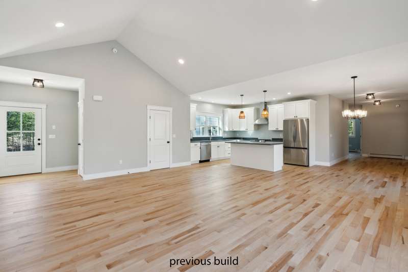 This modern executive ranch is set on a spacious, level lot and offers the perfect blend of style and comfort. Designed with an open-concept layout, the home showcases elevated custom finishes throughout. Step into the chef-inspired kitchen featuring quartz countertops, custom cabinetry, and white oak engineered hardwood floors. The main living area boasts soaring cathedral ceilings, creating an airy and inviting atmosphere that's ideal for both everyday living and entertaining.