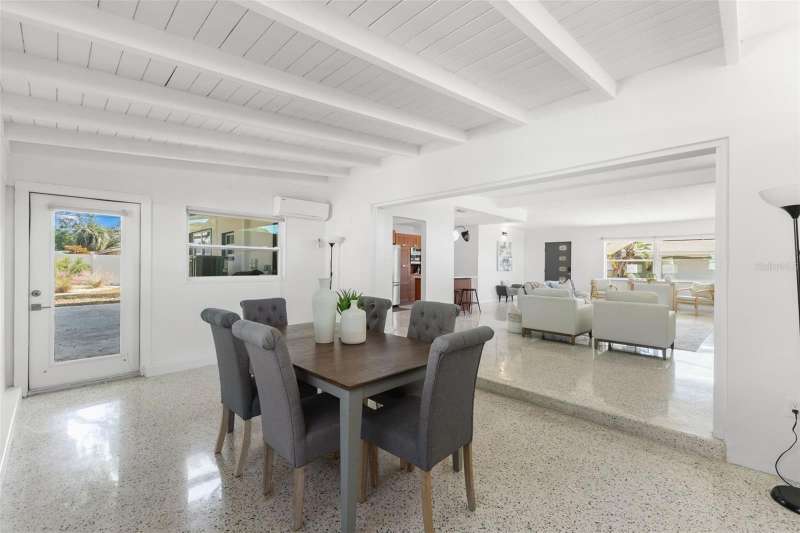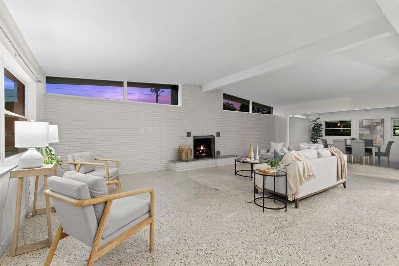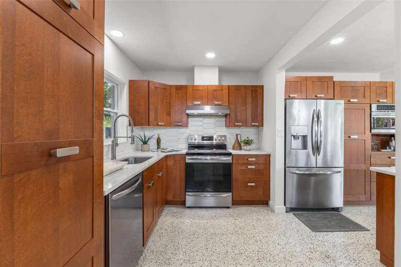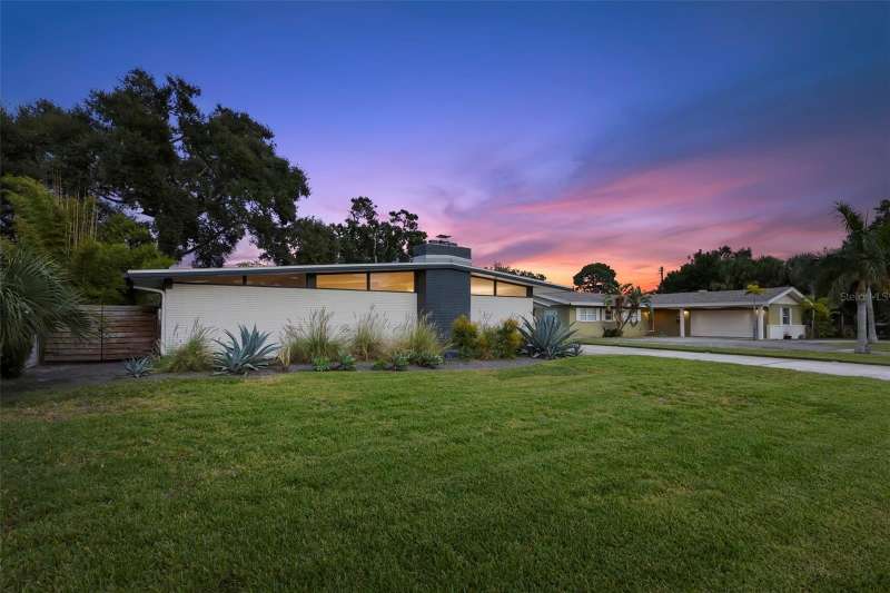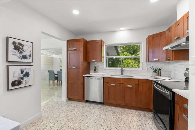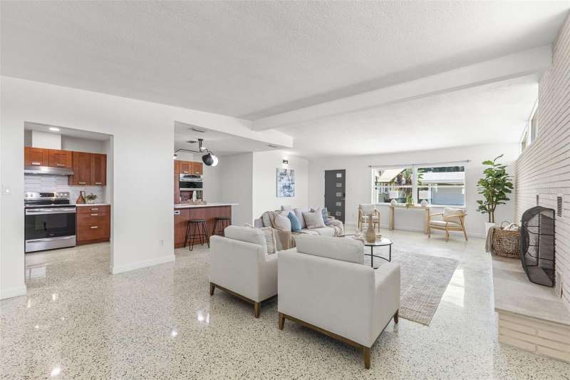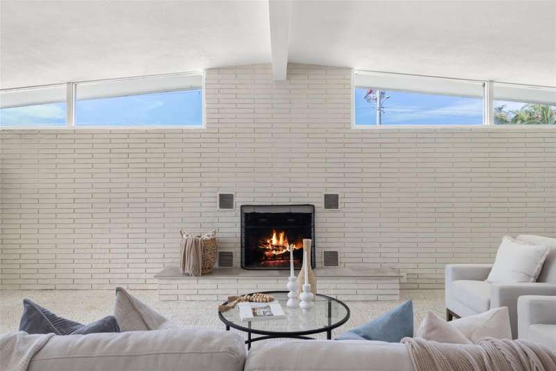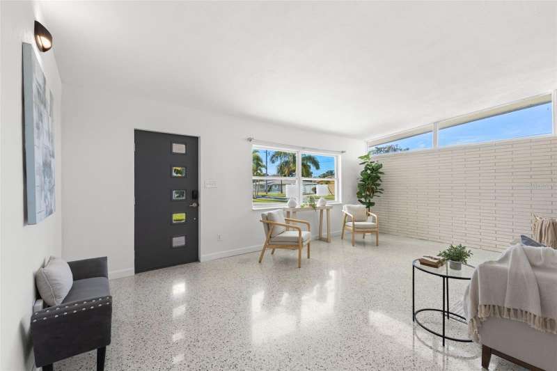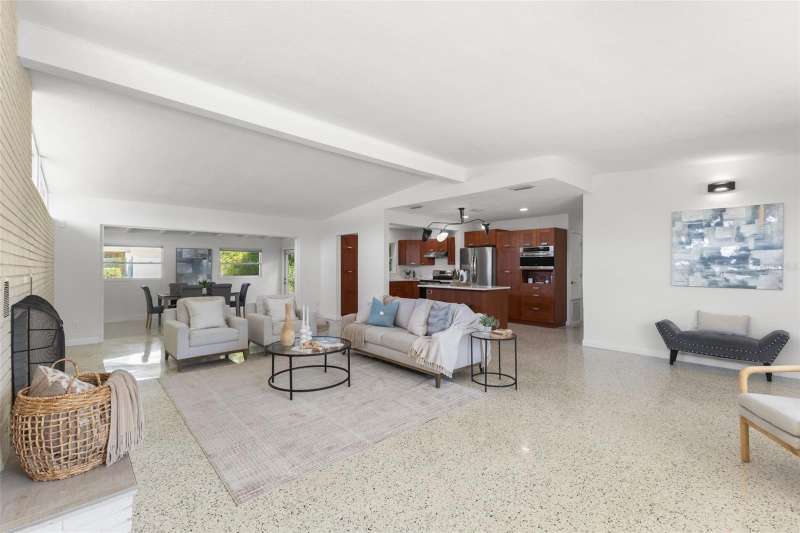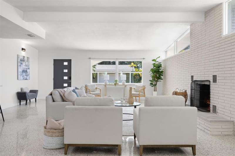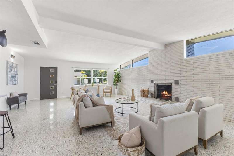 NO FLOOD ZONE. NO HOA. $5,000 SELLER CREDIT. This beautifully updated mid-century modern ranch blends timeless design with modern convenience. Set back from the street on a large, impeccably landscaped lot boasting a ultra-long extended driveway, expansive backyard, and an air-conditioned storage shed, this home offers exceptional privacy and presence. Inside, classic terrazzo floors flow through a bright, open layout that highlights the home’s authentic mid-century architecture. The designer kitchen features custom cabinetry with roll-out shelves, Lazy Susan, a prep island, high-end finishes, stainless steel appliances, and a striking statement light fixture that anchors the space with modern luxury. The expansive great room centers around a wood-burning hearth set against a full brick wall, offering generous space to merge a full dining area, a conversation corner, or a stunning entry vignette. A spacious, sunken flex room opens off the great room and can easily serve as a den, office, playroom, or formal dining room. This flexible space includes door leading to the side patio, ideal for grilling or dining al fresco. Hurricane-impact windows and doors throughout provide year-round peace of mind, while newly installed vinyl fencing adds polish and privacy to the backyard. The two largest bedrooms are generously sized to accommodate king beds and feature sliding glass doors that pour in natural light and offer direct access to the backyard. Updated bathrooms showcase tub-to-ceiling tile and sleek, modern vanities. Perfectly located in Pinellas Point, near the beaches and Maximo Park. This cozy neighborhood sits just a few exits from downtown St. Pete action and activities. Experience style, comfort, and privacy in this rare mid-century modern gem, perfectly suited for refined Florida living. Video and Matterport virtual tour available.