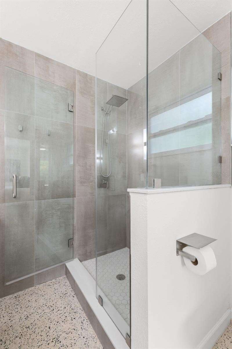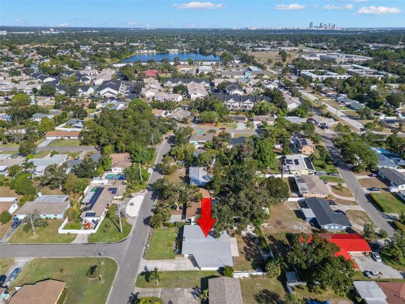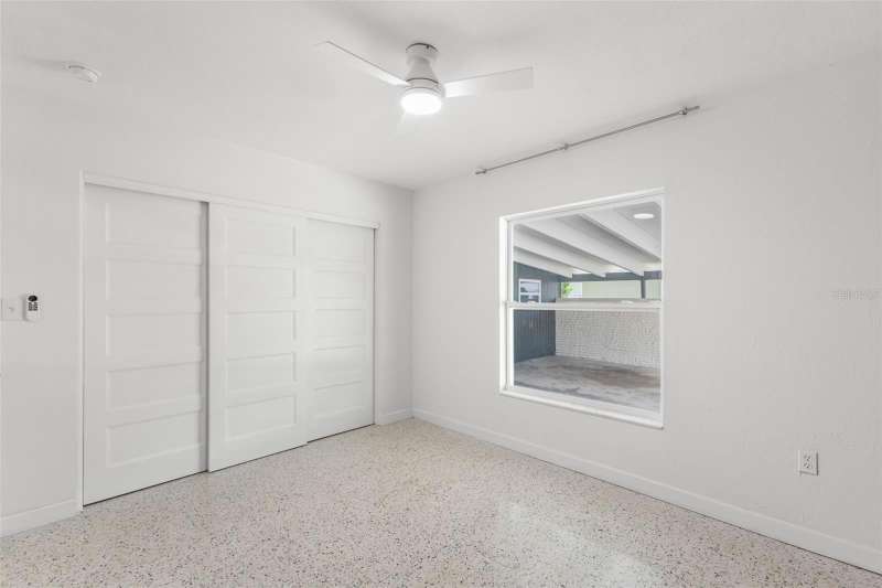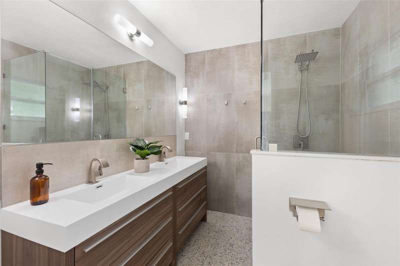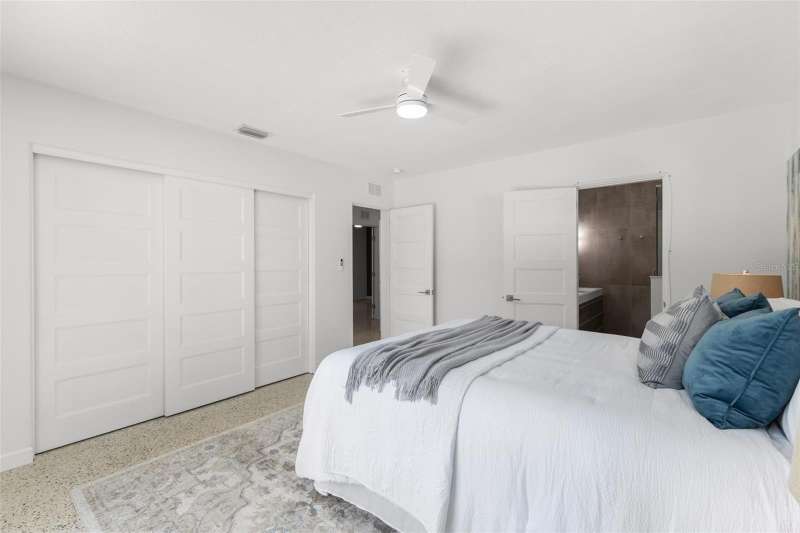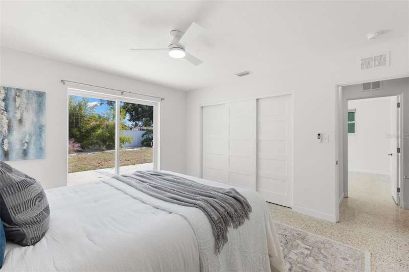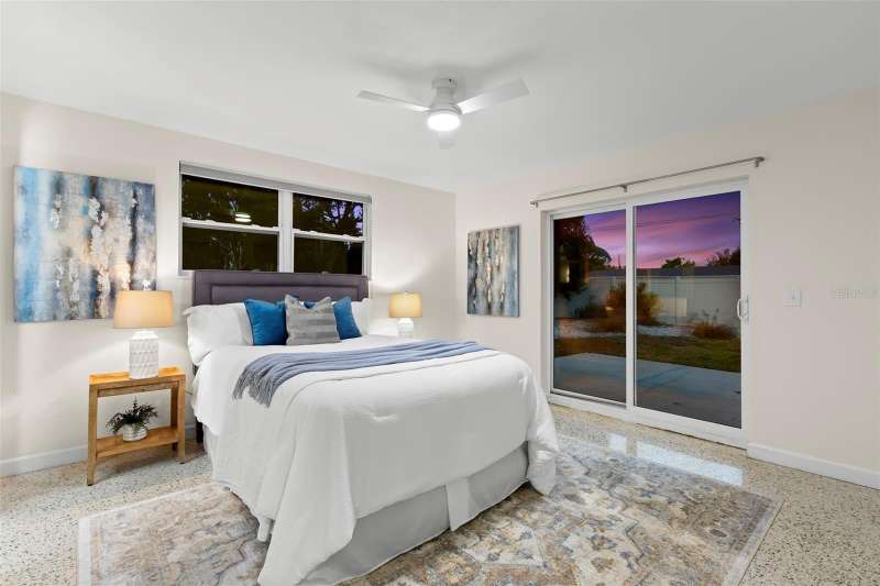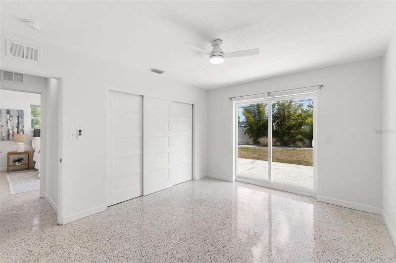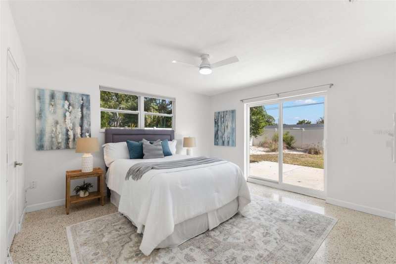 NO FLOOD ZONE. NO HOA. $5,000 SELLER CREDIT. This beautifully updated mid-century modern ranch blends timeless design with modern convenience. Set back from the street on a large, impeccably landscaped lot boasting a ultra-long extended driveway, expansive backyard, and an air-conditioned storage shed, this home offers exceptional privacy and presence. Inside, classic terrazzo floors flow through a bright, open layout that highlights the home’s authentic mid-century architecture. The designer kitchen features custom cabinetry with roll-out shelves, Lazy Susan, a prep island, high-end finishes, stainless steel appliances, and a striking statement light fixture that anchors the space with modern luxury. The expansive great room centers around a wood-burning hearth set against a full brick wall, offering generous space to merge a full dining area, a conversation corner, or a stunning entry vignette. A spacious, sunken flex room opens off the great room and can easily serve as a den, office, playroom, or formal dining room. This flexible space includes door leading to the side patio, ideal for grilling or dining al fresco. Hurricane-impact windows and doors throughout provide year-round peace of mind, while newly installed vinyl fencing adds polish and privacy to the backyard. The two largest bedrooms are generously sized to accommodate king beds and feature sliding glass doors that pour in natural light and offer direct access to the backyard. Updated bathrooms showcase tub-to-ceiling tile and sleek, modern vanities. Perfectly located in Pinellas Point, near the beaches and Maximo Park. This cozy neighborhood sits just a few exits from downtown St. Pete action and activities. Experience style, comfort, and privacy in this rare mid-century modern gem, perfectly suited for refined Florida living. Video and Matterport virtual tour available.