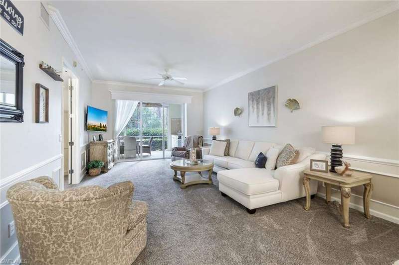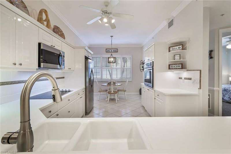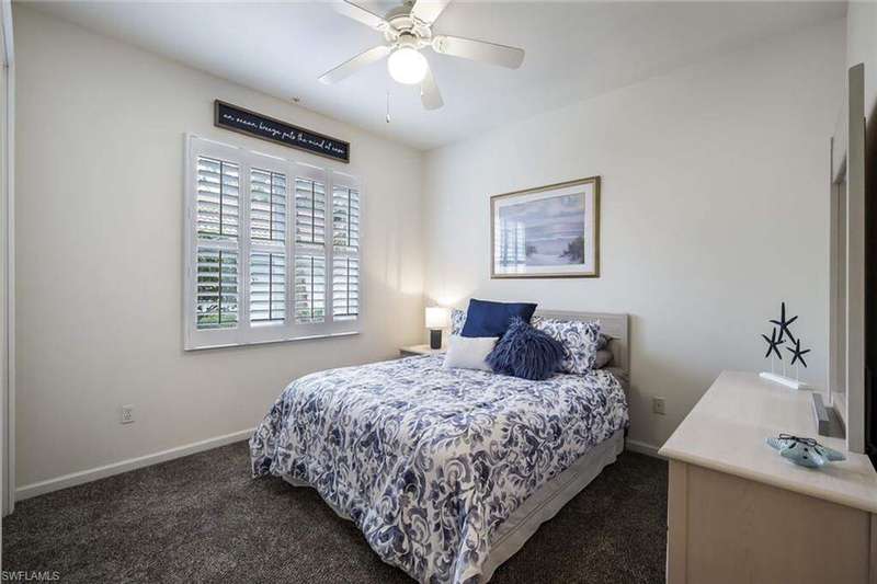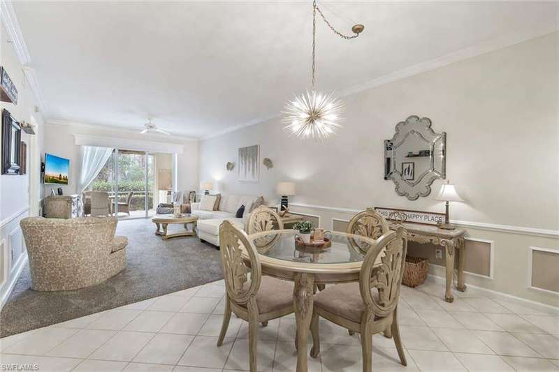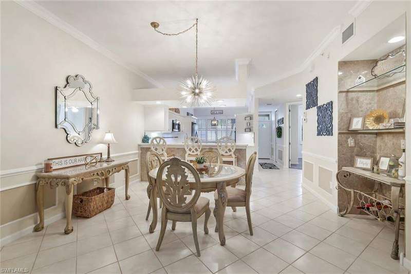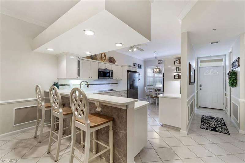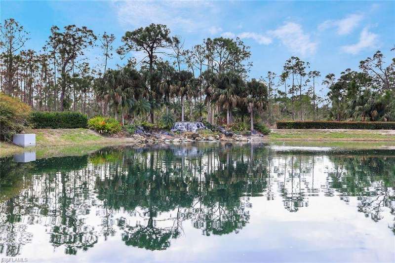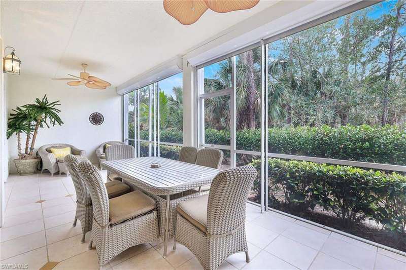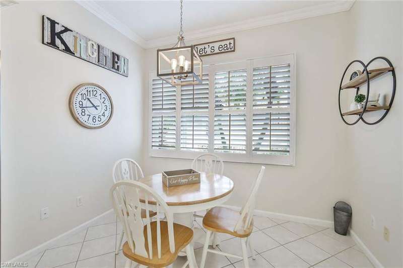 This beautifully appointed ground-floor unit includes a detached garage and is being sold fully furnished-ready for immediate move-in! Spanning over 1,500 square feet, this 2-bedroom, 2-bathroom home offers a spacious and functional layout. The open-concept kitchen is equipped with stainless steel appliances, a breakfast nook, and countertop seating, seamlessly flowing into the formal dining area, which features a custom built-in bar. The generous living space extends to a oversized screened lanai, complete with an outdoor wet bar and beverage fridge-perfect for entertaining. Enjoy serene views of the lush nature preserve, tranquil lake, and soothing waterfall from the comfort of your lanai. The primary suite boasts a walk-in closet, dual vanities, a soaking tub, a tiled walk-in shower, and a private water closet. A split-bedroom floor plan ensures privacy for guests, who will appreciate their own en-suite bath. Additional highlights include a full-sized laundry room with a soaking tub and custom cabinetry, plantation shutters, electric roll-down shutters on the lanai, extra storage, and a designer lighting package. Located in the gated community of Falling Waters North Preserve in North Naples, you'll be just minutes from Mercato, Waterside Shops, and Naples' renowned beaches. Don't miss your opportunity to own a piece of paradise!