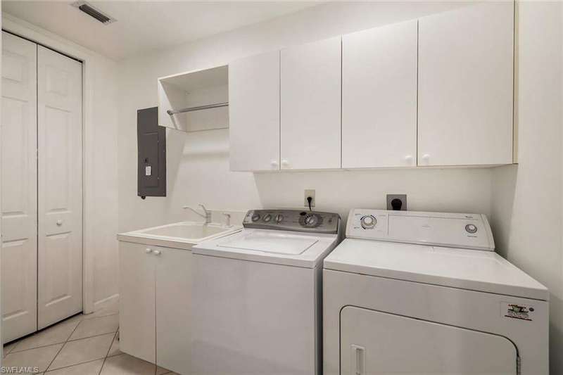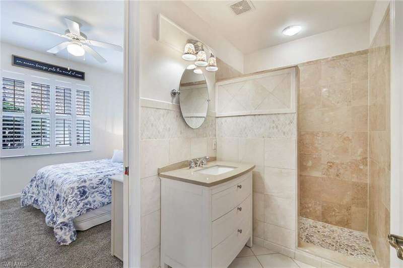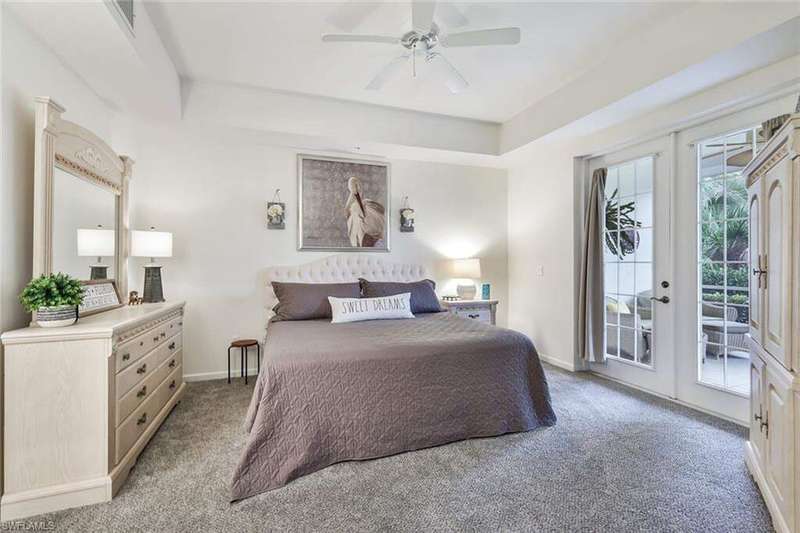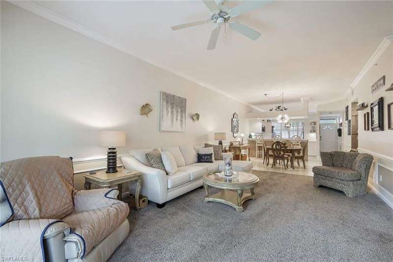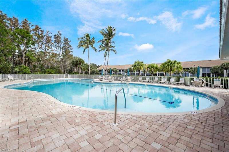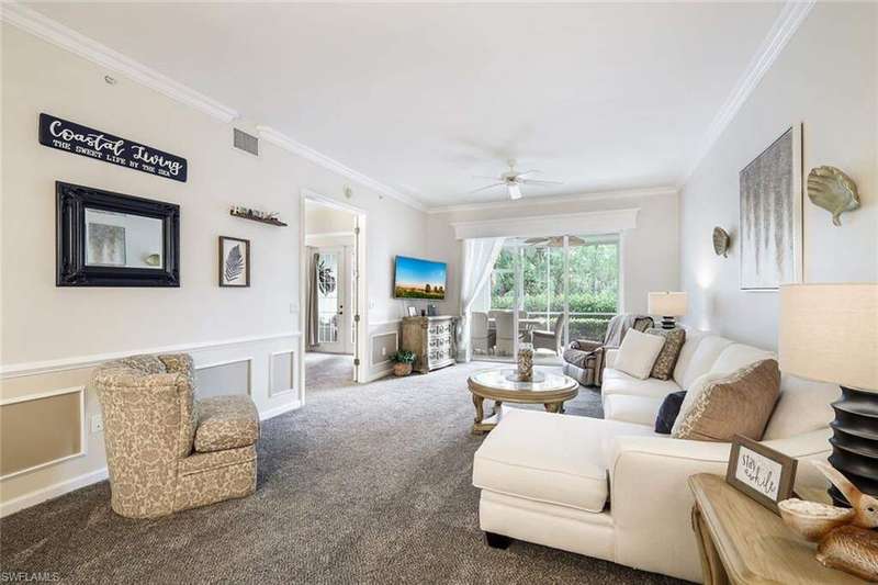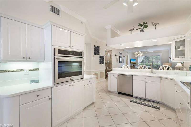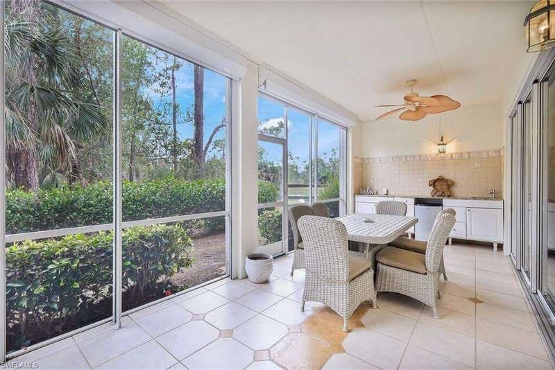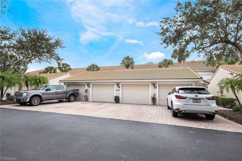 This beautifully appointed ground-floor unit includes a detached garage and is being sold fully furnished-ready for immediate move-in! Spanning over 1,500 square feet, this 2-bedroom, 2-bathroom home offers a spacious and functional layout. The open-concept kitchen is equipped with stainless steel appliances, a breakfast nook, and countertop seating, seamlessly flowing into the formal dining area, which features a custom built-in bar. The generous living space extends to a oversized screened lanai, complete with an outdoor wet bar and beverage fridge-perfect for entertaining. Enjoy serene views of the lush nature preserve, tranquil lake, and soothing waterfall from the comfort of your lanai. The primary suite boasts a walk-in closet, dual vanities, a soaking tub, a tiled walk-in shower, and a private water closet. A split-bedroom floor plan ensures privacy for guests, who will appreciate their own en-suite bath. Additional highlights include a full-sized laundry room with a soaking tub and custom cabinetry, plantation shutters, electric roll-down shutters on the lanai, extra storage, and a designer lighting package. Located in the gated community of Falling Waters North Preserve in North Naples, you'll be just minutes from Mercato, Waterside Shops, and Naples' renowned beaches. Don't miss your opportunity to own a piece of paradise!