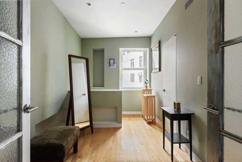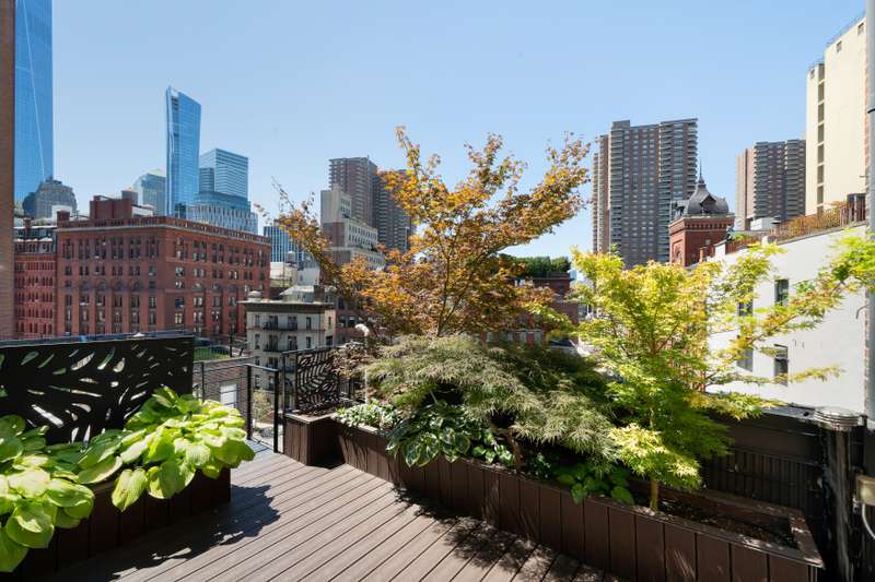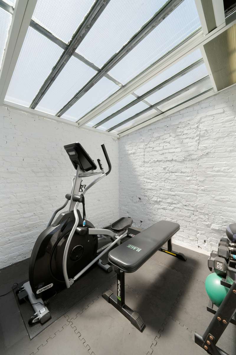 A retractable staircase in the living room leads to a landscaped private outdoor space with additional access to the building's furnished common roof deck. As an added bonus, the original mechanical room for the building's freight elevator shaft has been reconstructed into a flexible space unlike any other in NYC. ; With its own heating/cooling system, this space is ideal as a gym, home office, studio, or anything you could imagine, and is currently configured as an exercise room.