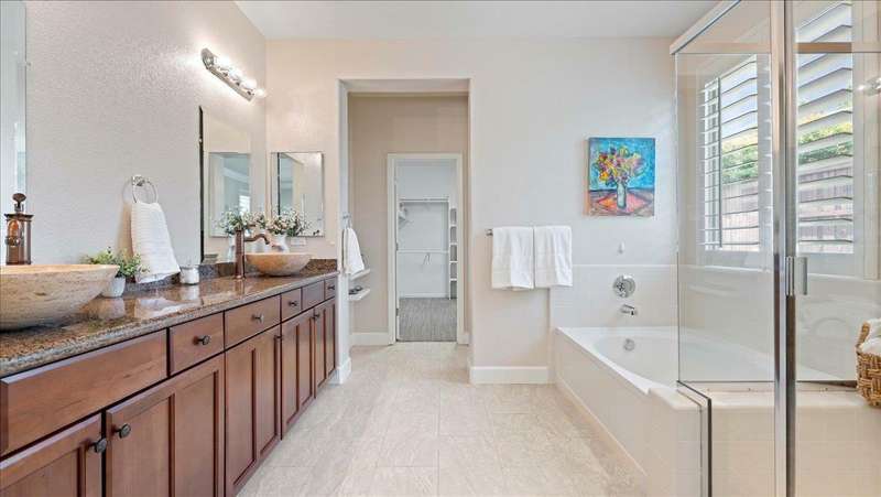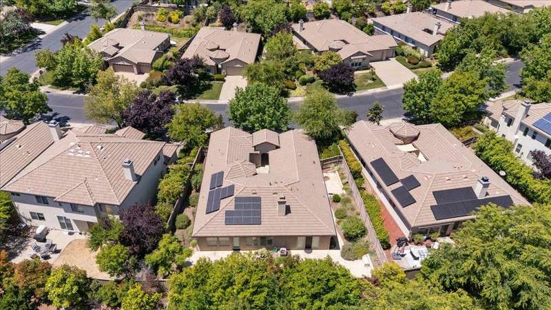 Welcome to 6012 Brogan Way, a beautifully maintained SINGLE STORY home located in Serrano, one of El Dorado Hills most prestigious communities. An inviting front courtyard welcomes you, leading you into a spacious open-concept floor plan with a light and bright great room at its heart! The kitchen is both attractive and functional, featuring granite countertops, stainless steel appliances, and custom roll-out shelving in the lower cabinets. A kitchen island and a sizable dining room make entertaining a breeze. The private primary suite offers direct access to the serene, garden-style backyard with a stamped concrete patio & lush landscaping - perfect for peaceful mornings or relaxed evenings. Plantation shutters add a classic touch throughout the home while beautiful engineered composite flooring adds a modern feel. Enjoy the energy efficiency of OWNED SOLAR and the practicality of a three-car tandem garage. This is an ideal floor plan for a multigenerational family home! It also works well for caregivers by having living quarters in the front of the house, or even for a tenant! Plus, this home is in an unbeatable location near top-rated schools, El Dorado Hills' Town Center, shopping, dining, Folsom Lake, scenic trails, and the wonderful neighborhood park, Bella Terra Park!