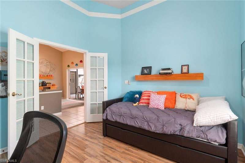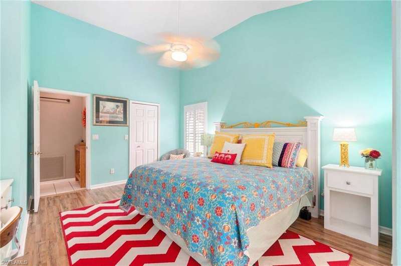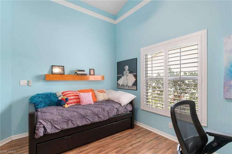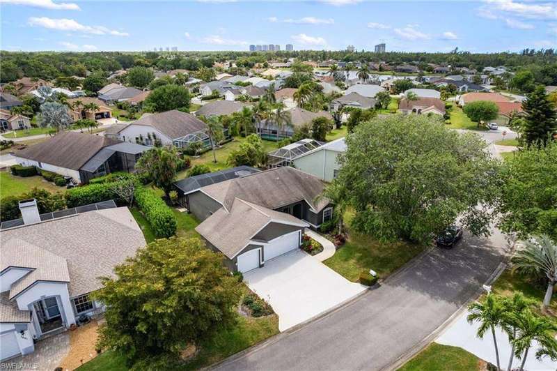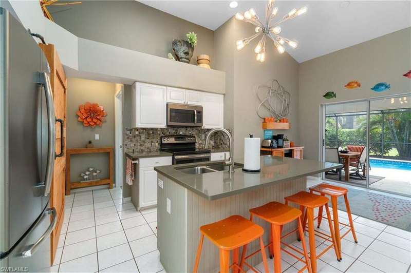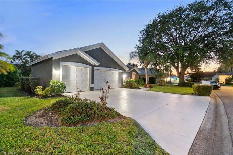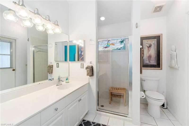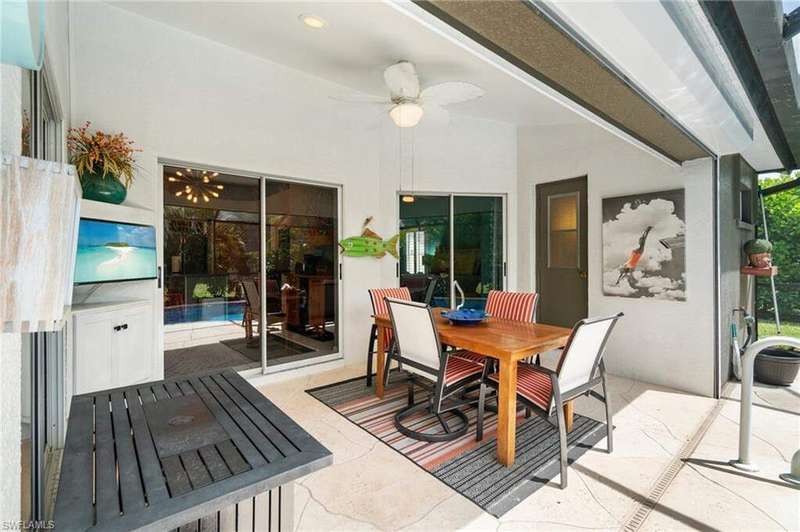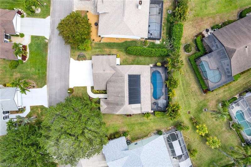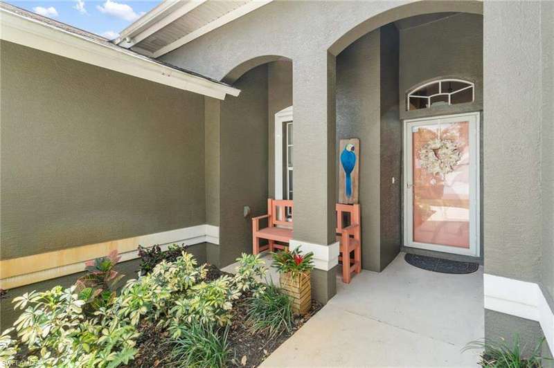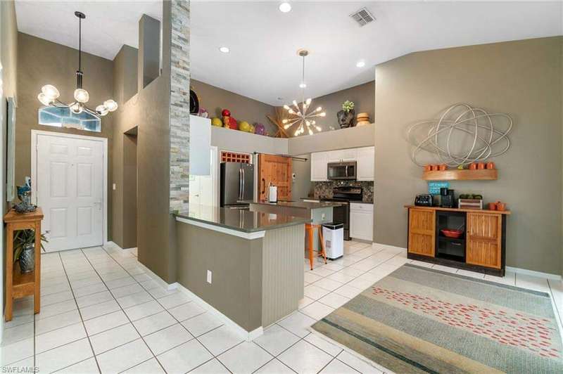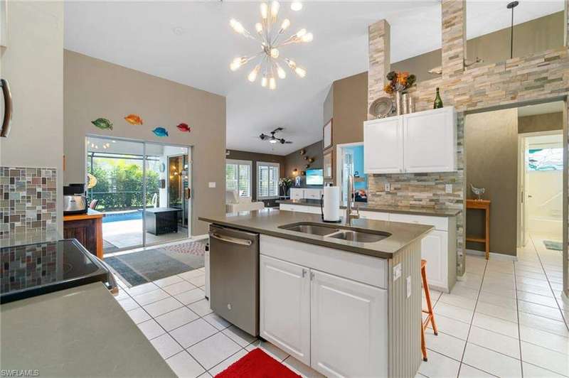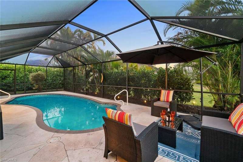 Resort-Style Living in Fountain Lakes - Turnkey, Updated, and Minutes from Shops, Dining & Gulf Beaches! Great Rental Investment! This beautifully updated southern exposure pool home with a 3-car garage is nestled in the gated golf community of Fountain Lakes, just west of US-41. Offering impressive upgrades and resort-style amenities, this home checks all the boxes. Notable enhancements include a new roof in 2023 with new solar panels for efficient pool heating, a freshly painted pool cage with new screens and doors, and lush tropical landscaping. Additional improvements include a new HVAC system, hot water heater, and updated plumbing throughout. The interior boasts high ceilings, abundant natural light, and designer touches that create a luxurious atmosphere. The remodeled kitchen features quartz countertops and a custom-built barn door leading to the pantry. Plantation shutters add elegance and allow for effortless control of natural light, setting the perfect ambiance in every room. The screened lanai, with its new custom-stamped concrete, serves as a seamless extension of the interior living space, offering comfortable seating and a sparkling, resurfaced pool with a brand new pump, all heated by solar panels. For added peace of mind, the lanai is equipped with an electric roll-down storm shutter. Fountain Lakes offers an array of amenities with low HOA fees, including a 9-hole executive golf course, pickleball and tennis courts, and a community pool. Located just minutes from Coconut Point Mall's vibrant dining and shopping scene and only a short 20-minute drive to Southwest Florida's renowned Gulf beaches, this home is also conveniently close to SW International Airport. Don't miss this opportunity to own a top-notch residence in an unbeatable location!