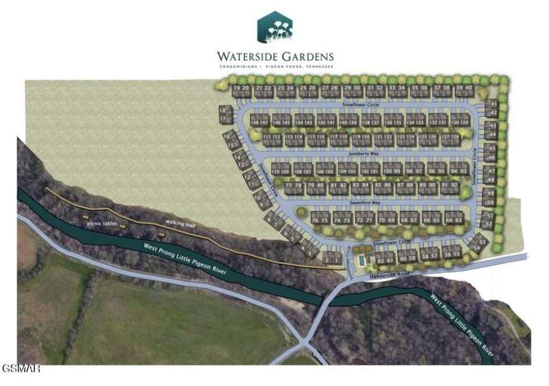 Welcome to Waterside Gardens Condominiums! This new construction, zero maintenance, 3-bedroom home is almost complete and just waiting for you to customize the interior from a wide selection of granite kitchen tops, soft-close cabinets, LVP flooring, and any paint color you choose. Waterside is located in the heart of Pigeon Forge on 47 beautiful acres along the Little Pigeon River, and minutes from the wonders Dollywood, Gatlinburg and the Smoky Mountains. This roomy beauty includes a stunning stone fireplace, large kitchen island, living room and bedroom ceiling fans, stainless appliances, cathedral ceilings, elevated toilets, and wide 36'' doors, big front porch and back patio with covered option. Waterside Gardens features a community pool and 20 acres of green space with a walking trail and picnic tables for residents and their pets to enjoy. Waterside Gardens is being developed and constructed by the same team that built Riverbend Gardens and Creekside Gardens in Sevierville.