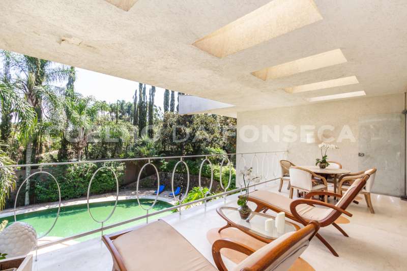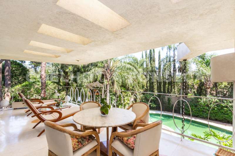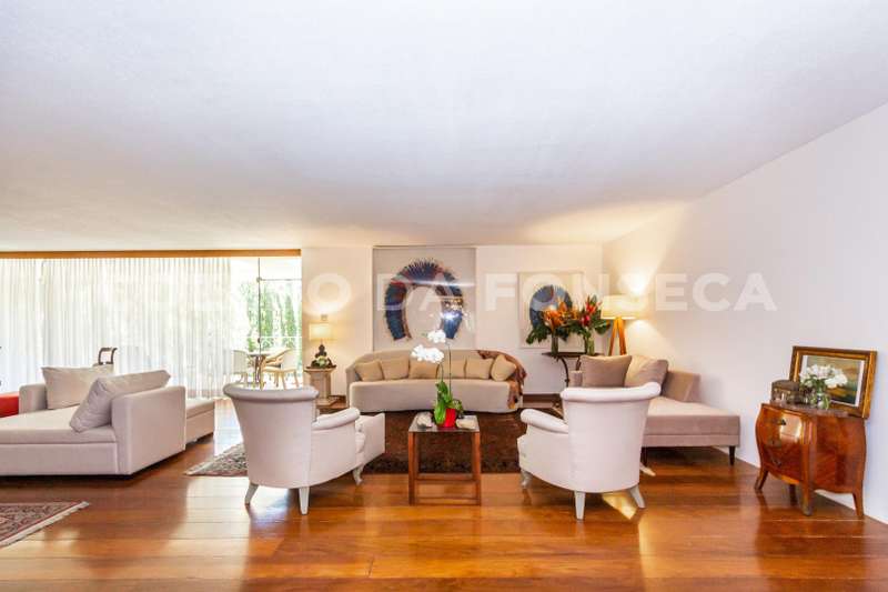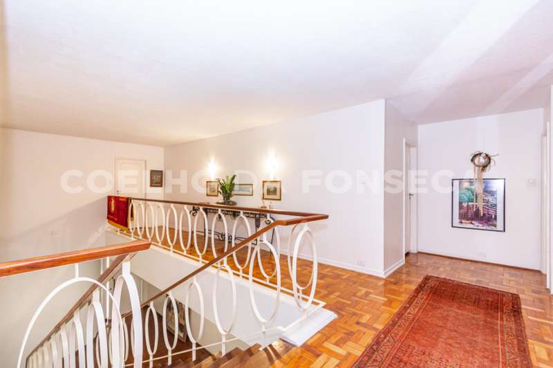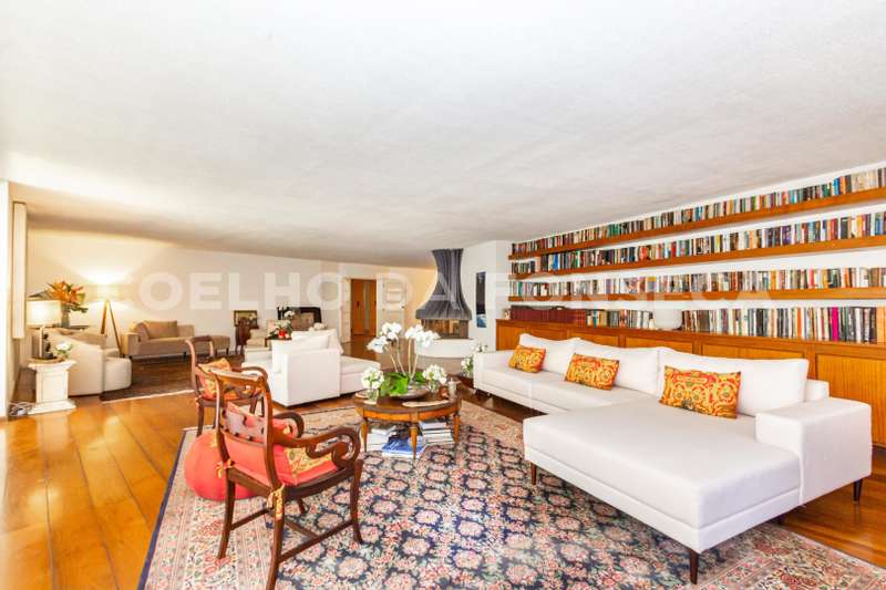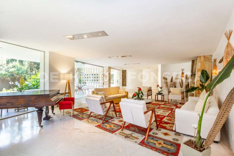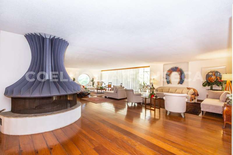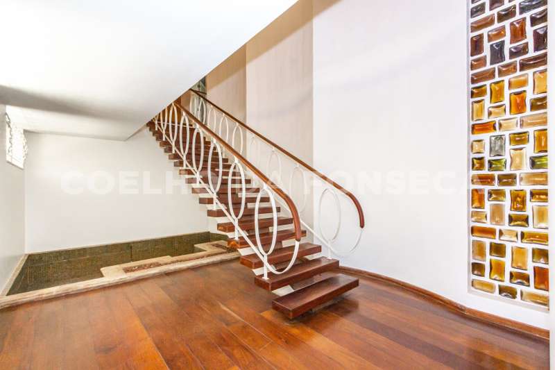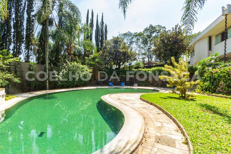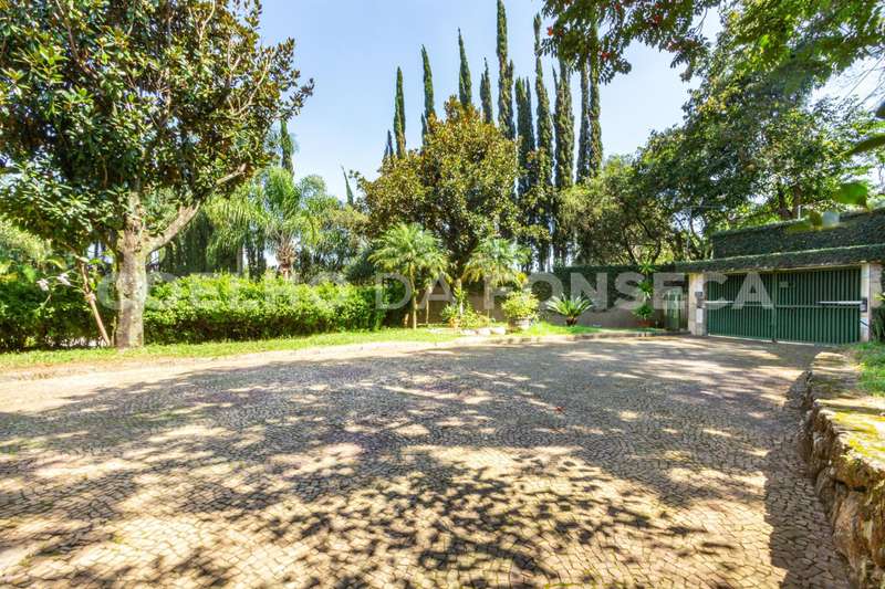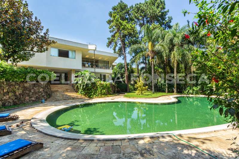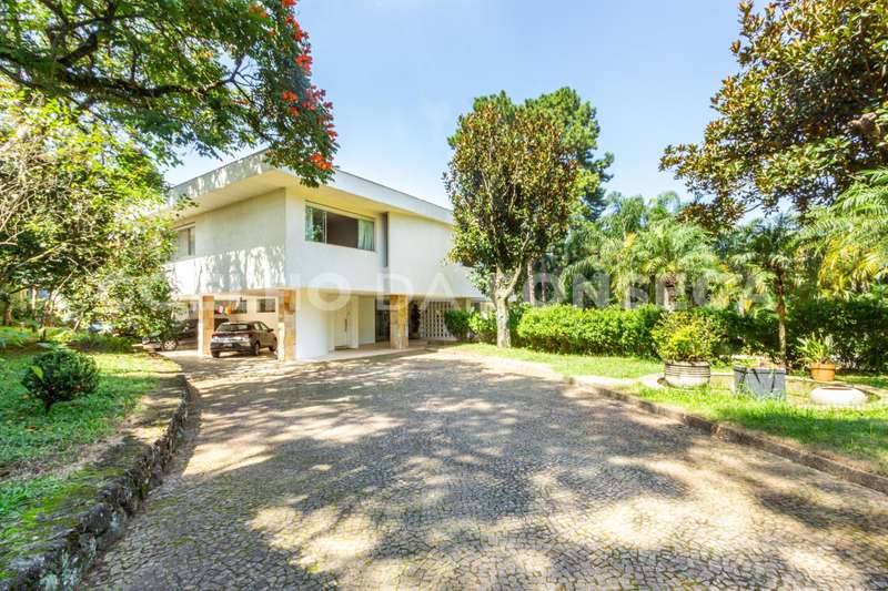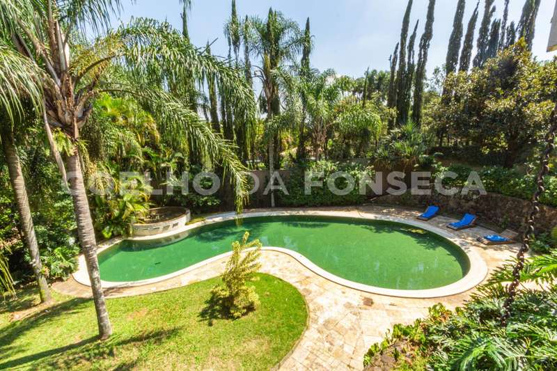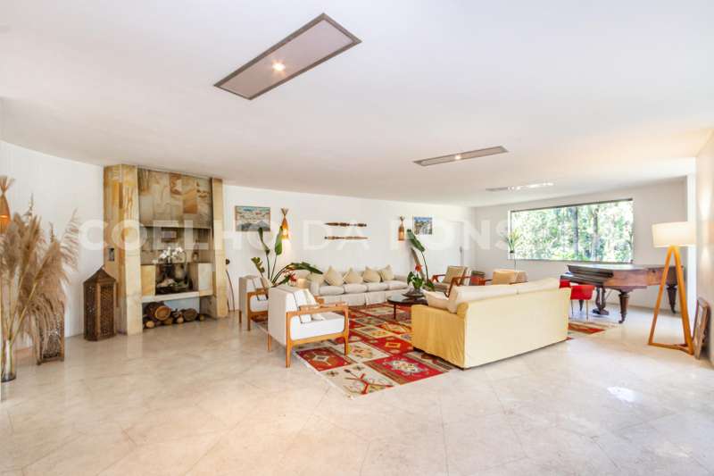 Casa com cinco suítes, dois salões, sala de jantar, área de SPA, área de empregados, sauna, jacuzzi, três fontes, 983m² área útil e 2.000m² área de terreno. Jardim, salão de festas integrado à piscina, armários nas suítes, banheiros reformados, rua tranquila, vista para o jardim e piscina. Sala ampla com piso em tábuas largas integrado a um amplo terraço com vista para o verde do jardim. Mármore no piso do salão de festa. Casa em um só piso.