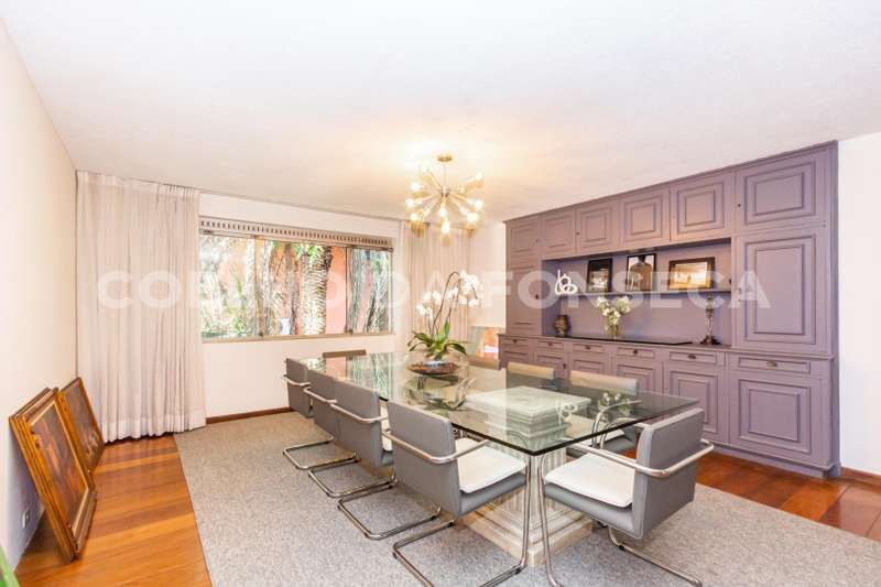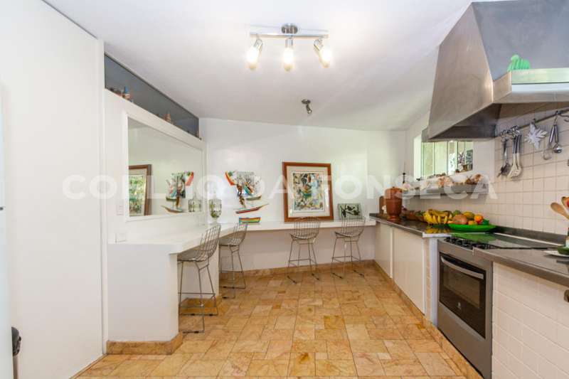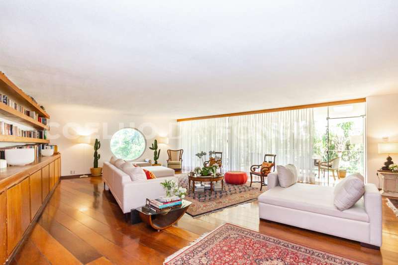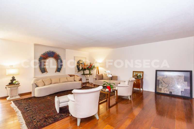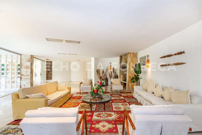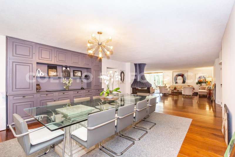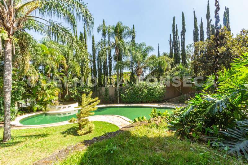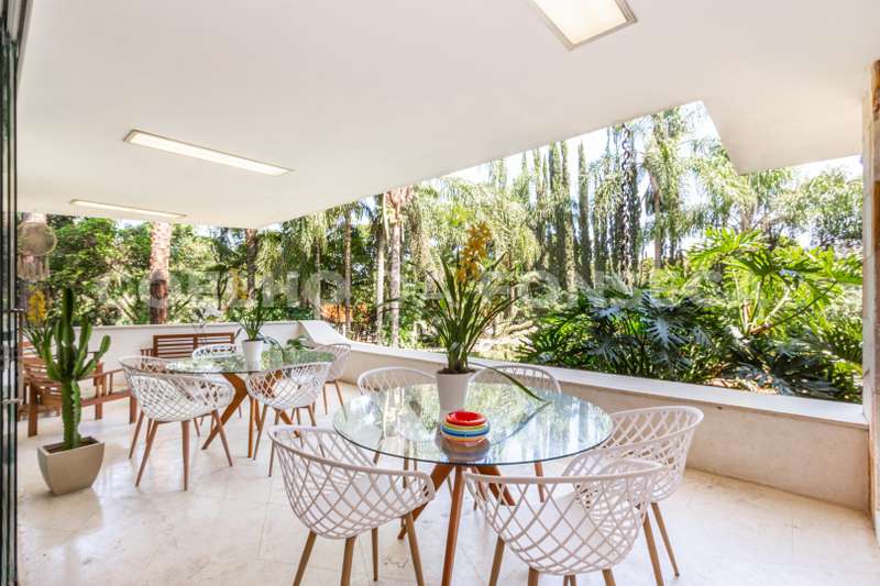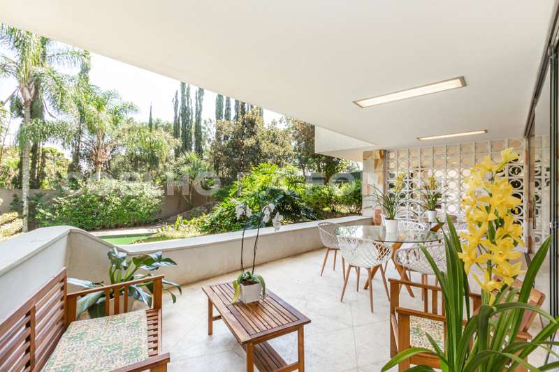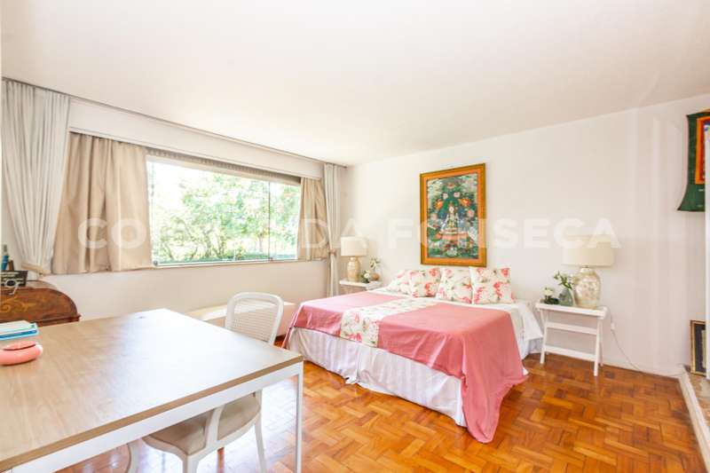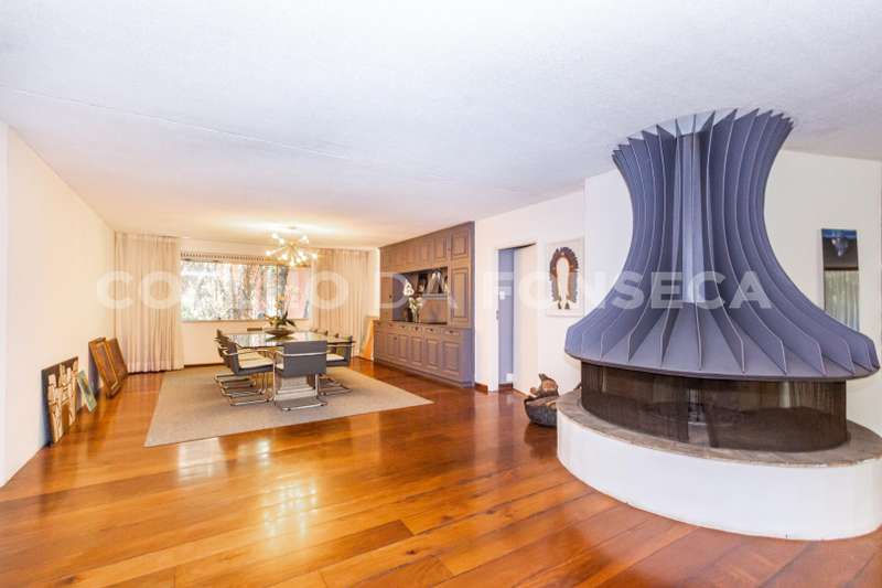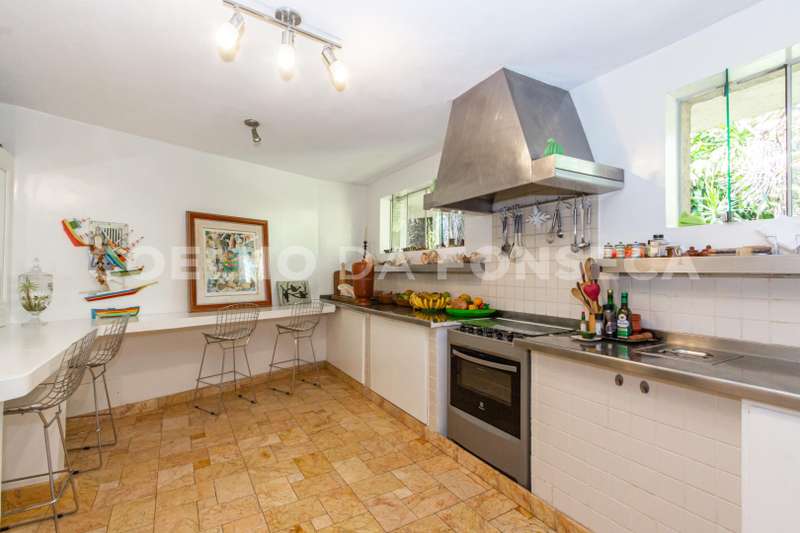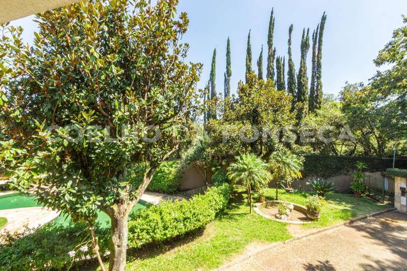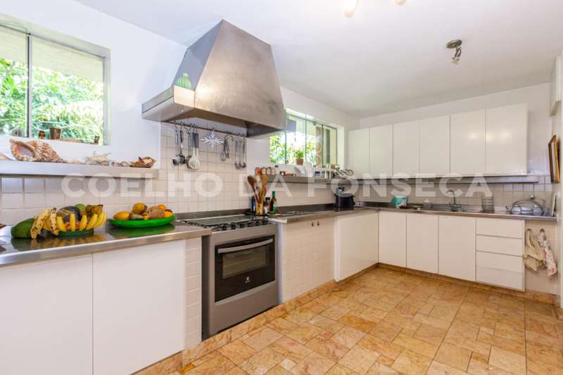 Casa com cinco suítes, dois salões, sala de jantar, área de SPA, área de empregados, sauna, jacuzzi, três fontes, 983m² área útil e 2.000m² área de terreno. Jardim, salão de festas integrado à piscina, armários nas suítes, banheiros reformados, rua tranquila, vista para o jardim e piscina. Sala ampla com piso em tábuas largas integrado a um amplo terraço com vista para o verde do jardim. Mármore no piso do salão de festa. Casa em um só piso.