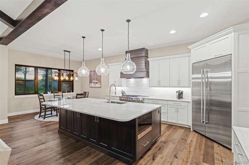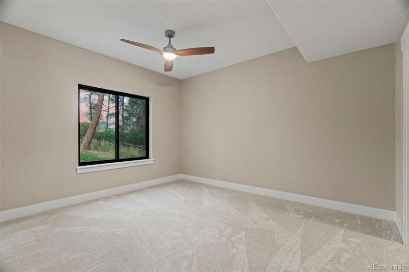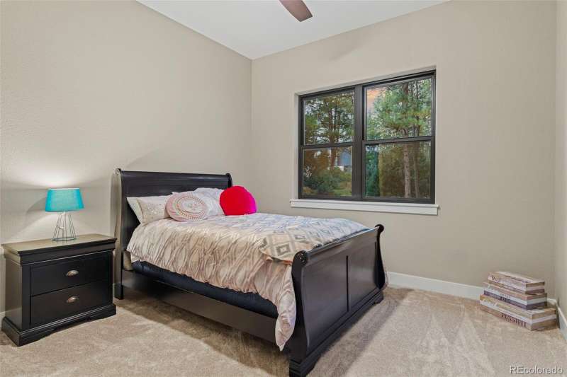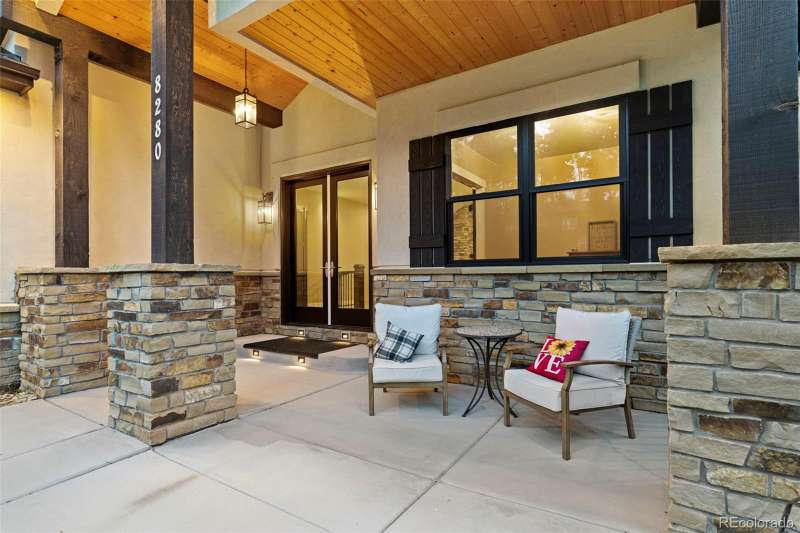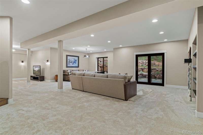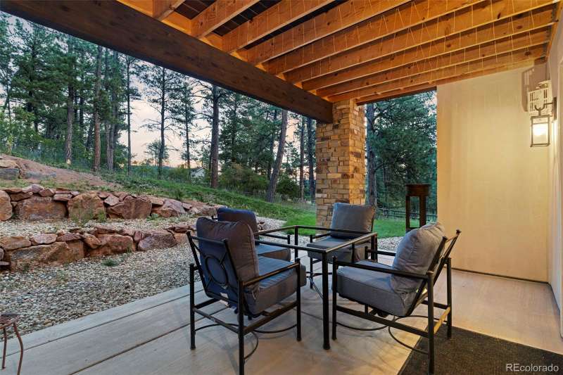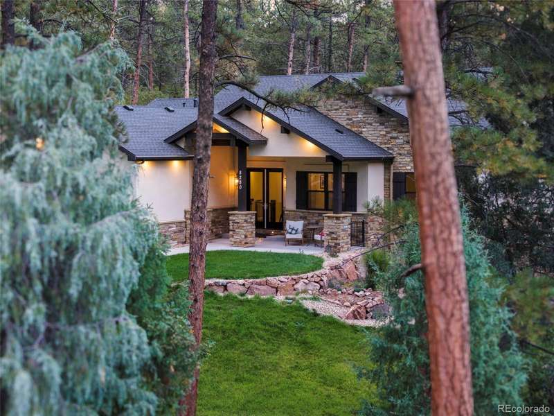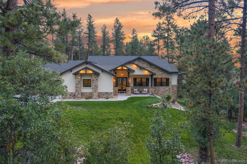 Huge Price Improvement! Offered at $1,499,900! Welcome to one of the most exquisite custom homes in Perry Park, where rolling hills, towering pines, and striking red rock formations create a breathtaking backdrop for this nearly new 5-bedroom, 4-bathroom ranch-style retreat with a main-floor study and over 4,000 finished square feet. Built just two years ago, this home blends timeless craftsmanship with modern luxury. The exterior impresses with tall timber columns, a plank ceiling front porch, professional lighting, and mature trees offering natural privacy. Step inside through double front doors to a bright, open layout featuring hardwood floors, soaring 14' vaulted ceilings with custom beams, and panoramic views of the serene surroundings. The chef's kitchen is a showstopper with 42? warm ivory cabinetry, a massive island topped with Brazilian quartzite, handcrafted walnut hood, professional 6-burner gas cooktop with dual ovens, built-in refrigerator, walk-in pantry, and a large dining area. The great room showcases a stacked-stone gas fireplace, floating shelves, and double sliders leading to a covered deck-perfect for entertaining. The private primary suite offers deck access, a spa-inspired 5-piece bath with heated floors, freestanding tub, dual-head shower, and a 10' x 14' walk-in closet connected to the laundry room and custom mudroom. Two main-floor guest bedrooms share a stylish ¾ bath, while the finished walkout basement adds a massive rec/theater/game room with a second fireplace, two additional bedrooms, and a full ¾ bath. The oversized 3.5-car garage includes 220V/50 Amp EV charging and ample storage. Experience main-floor living, thoughtful design, and luxury craftsmanship-all in one of Douglas County's most sought-after communities.