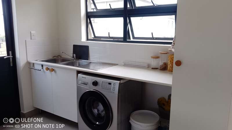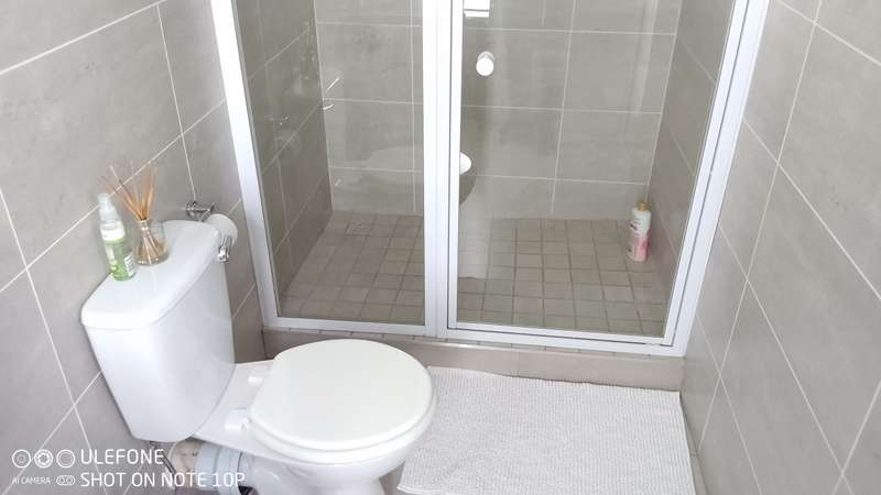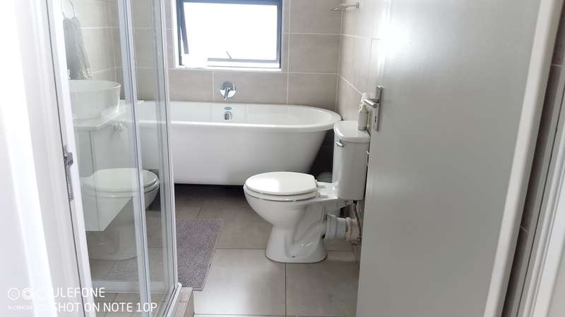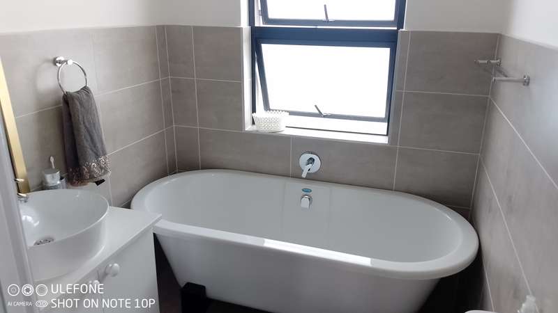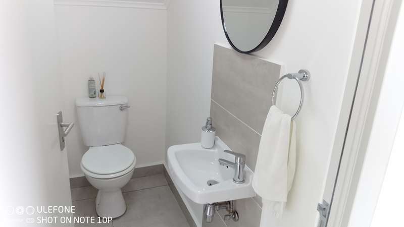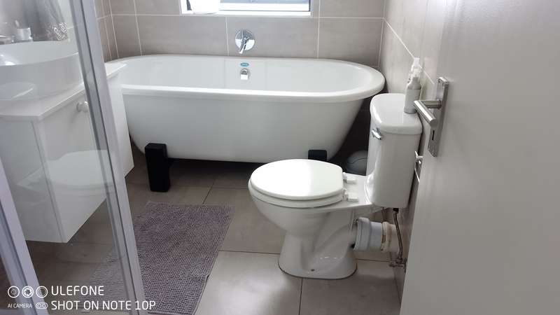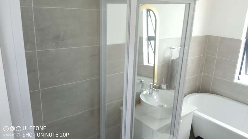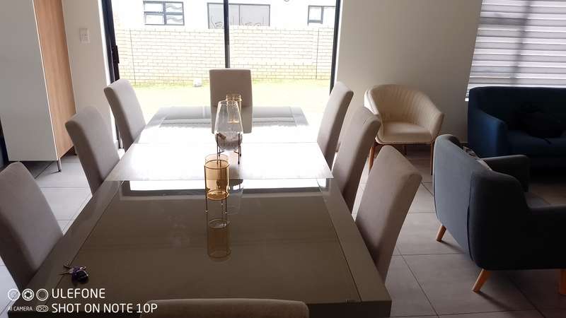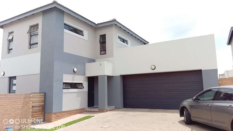 This double-storey home in THATCHFIELD RIDGE offers a spacious and well-appointed layout. The front features a paved driveway leading to a double automated garage with additional covered parking. Upon entering, you find a tiled dining and living area. The kitchen is large, with cherry wood cupboards, granite countertops, and a generous pantry that leads to a garden backyard. Skylights brighten the space, and there’s a small breakfast nook and a study area adjacent to the kitchen. Upstairs, the home has three tiled bedrooms. The main bedroom includes built-in cupboards and an en-suite bathroom with a bath, shower, double basin, and toilet. The second and third bedrooms also have built-in cupboards and share a full bathroom with a bath, shower, toilet, and basin.