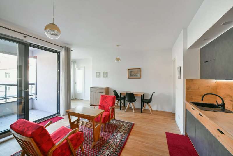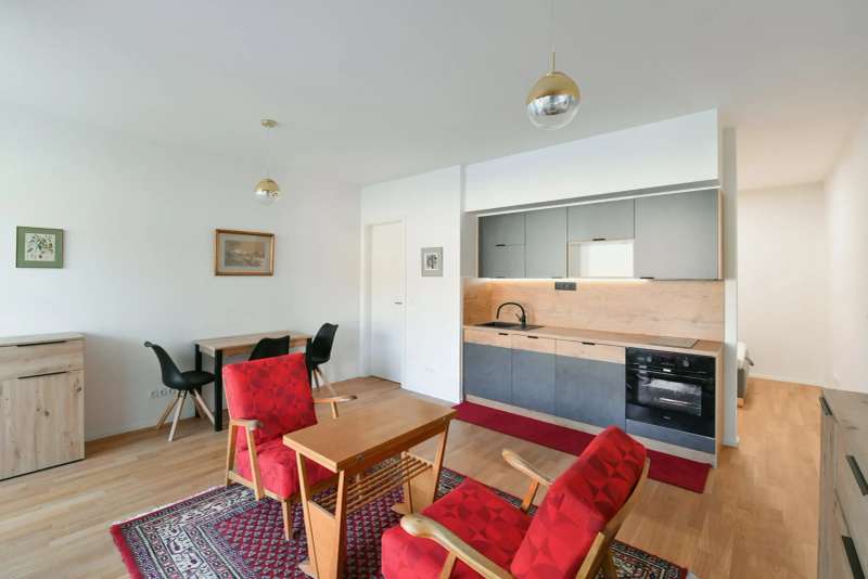 All units in the project are thoughtfully designed down to the last detail, including top-standard equipment and furnishings. For example, quality wooden floors, large-format tiles and cladding, lacquered doors 2.1m high, French windows, underfloor heating, Laufen sanitary ware, and external blinds for most apartments.