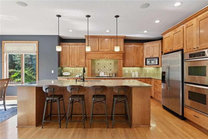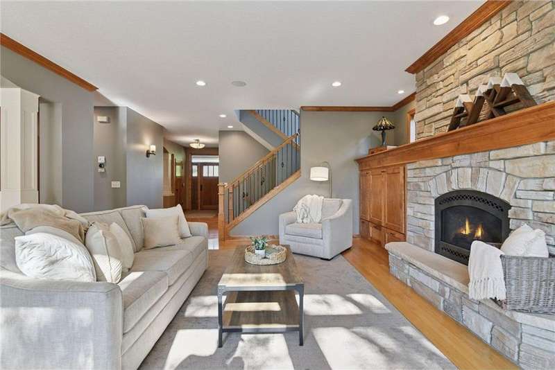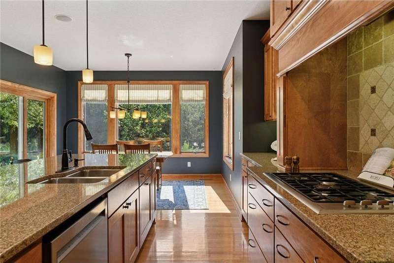 Look no further than this sprawling two-story offering in Bellavista. This custom home exceeds expectations with quality craftsmanship and thoughtful design by Kerber Homes. It neighbors the Chaska Town Course on nearly a half-acre lot with remarkable landscaping, fragrant gardens and towering trees. A spacious foyer invites you inside with five bedrooms and four bathrooms across 4,440 finished square feet. Gleaming hardwood floors carry into the family room with an inlay of plush carpeting. This space entertains with a floor-to-ceiling gas fireplace and incredible natural light. Impress any chef with a kitchen that boasts custom Maple cabinetry, stainless steel appliances with a double oven, a walk-in pantry and an enormous center island with granite countertops. The dining room walks out to a maintenance-free deck and a lower patio for further enjoyment. The main level is completed by a home office, front flex room, half bathroom and mudroom access to a tandem four-stall garage. There is a heated workshop with double doors that offer ultimate convenience to the backyard. The upper level presents two full bathrooms and four bedrooms, including the primary suite. This incredible retreat offers dual vanity sinks, heated tile floors and a separate shower and jetted tub. Head to the lower level to find more recreation space with another gas fireplace, a built-in playhouse and game area and a fifth bedroom with a ¾ bathroom with heated floors. Other notable features include abundant storage, a central vac system, all newer mechanicals and only a one-year-old roof. This is a dream home and property you don't want to miss!