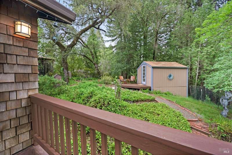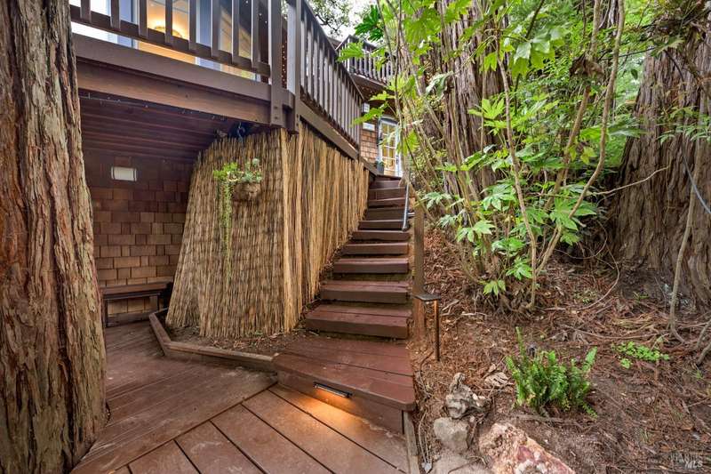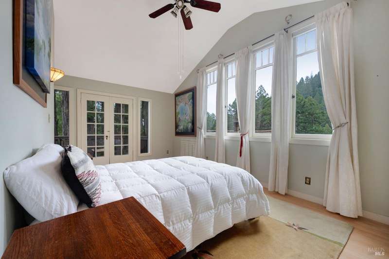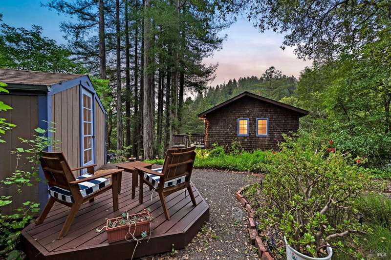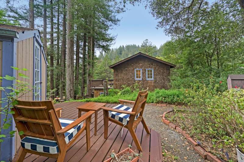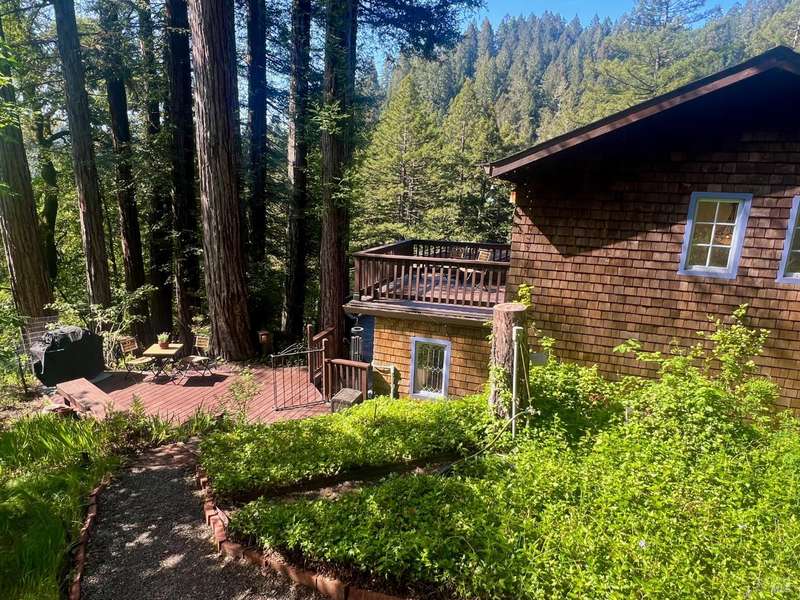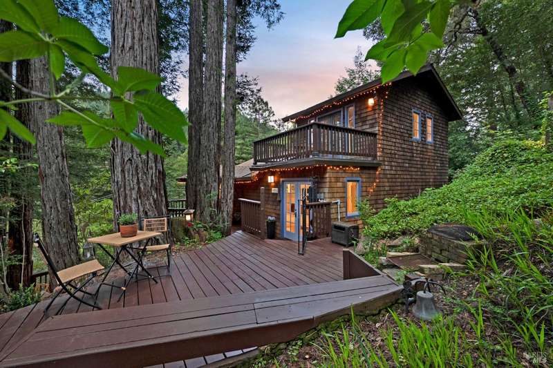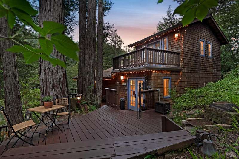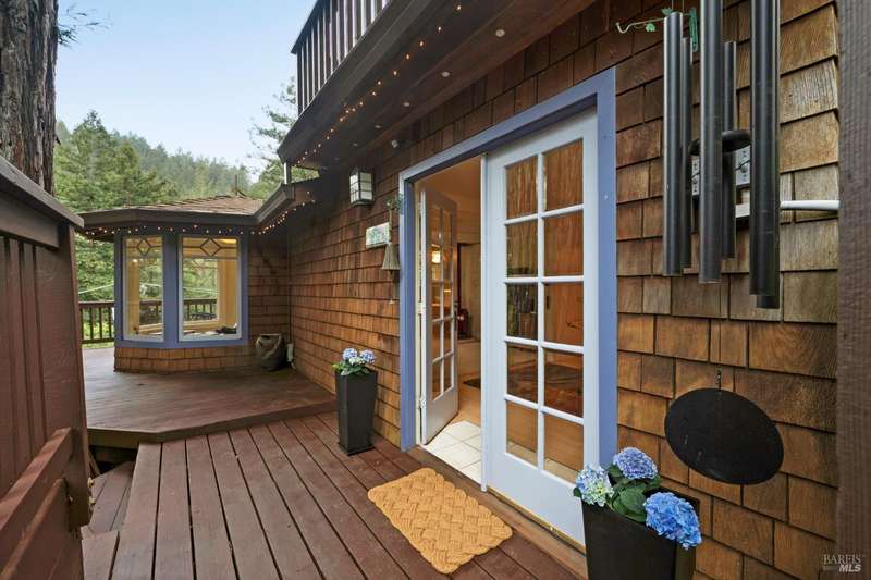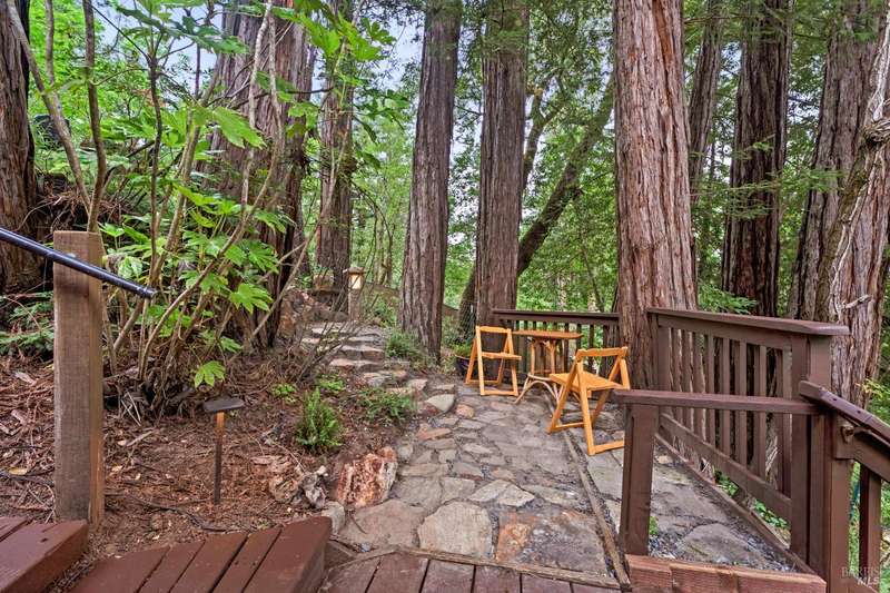 Paradiso del Cielo (Sky Haven) offers a charming vintage home with sun, views and privacy. This heartwarming home is a true sanctuary. Perched high on a hill, the panoramic views of forest ridges and of your own redwood grove will steal your breath away. It's the perfect place to unwind and reconnect with nature. The upper level boasts a magnificent primary bedroom with vaulted ceilings, expansive windows, white oak floors, and a private sun deck for your own personal escape. The kitchen is perfect for culinary creativity. Your guests can retreat to the private lower-level suite, complete with a cozy sleeping cove and an outdoor shower. Enjoy al fresco dining and moments of zen in the detached meditation room of this private oasis. The outdoor spaces are as captivating as the interior. It's much more than a home, it's a lifestyle!