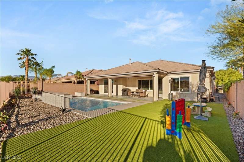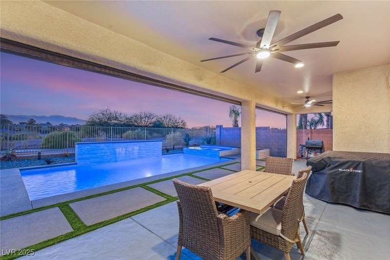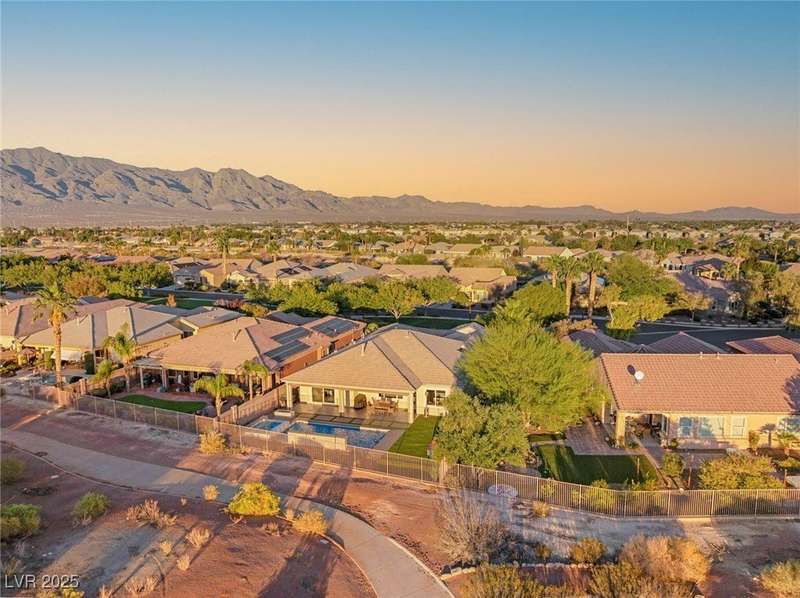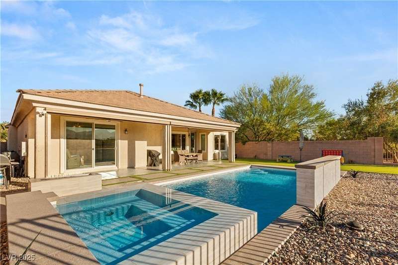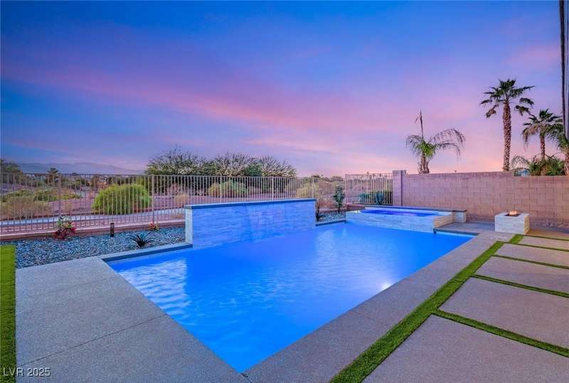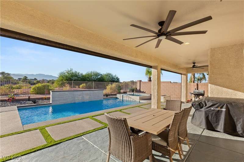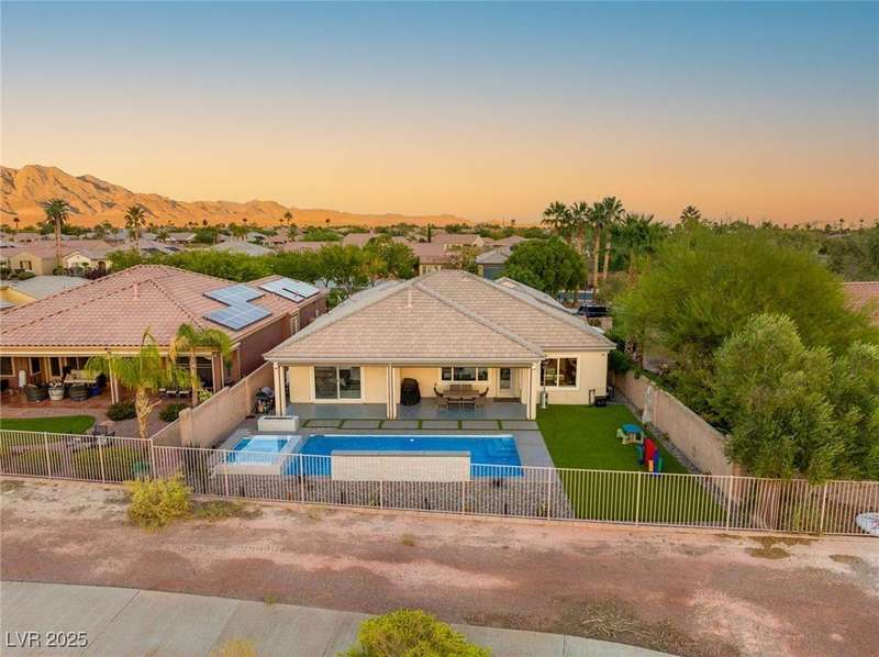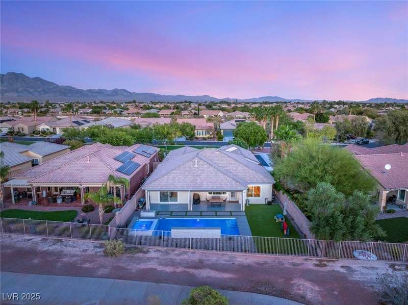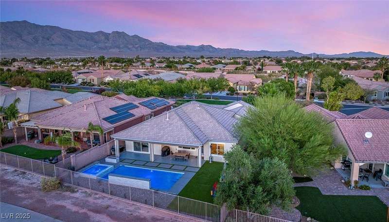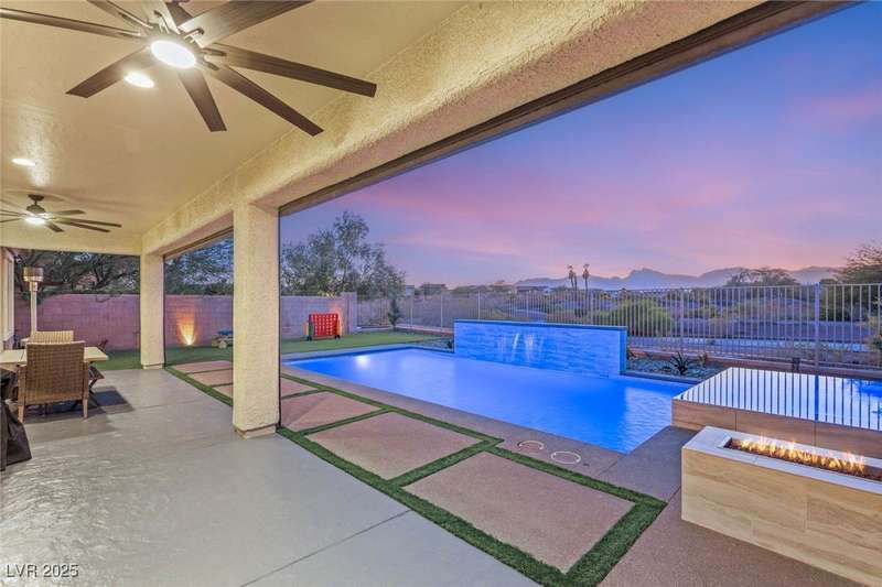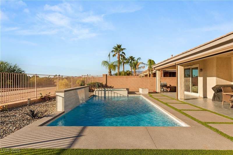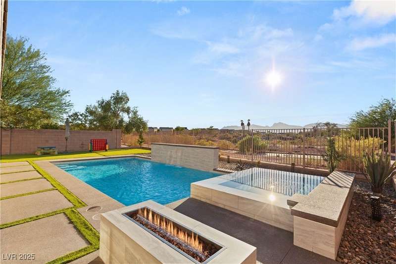 Rare opportunity to own a fully upgraded single-story home with pool and spa in a guard-gated community. Enter through a charming gated courtyard surrounded by desert landscaping and step into an open modern floor plan with 10-ft ceilings and Santa Fe textured walls. The great room showcases a designer adobe fireplace, built-in bar with dual wine fridges, and expansive dining area with views of the resort-style backyard. The chef’s kitchen features a large island, walk-in pantry, double ovens, and plenty of cabinet space. The spacious primary suite includes patio access, a spa-like bath with soaking tub, glass shower, and oversized walk-in closet. Enjoy total privacy in the backyard oasis with lap pool, infinity spa, waterfall wall, and fire pit—set against mountain views and no rear neighbors. Additional highlights include a flex room, Tonal gym setup in the cooled garage, epoxy flooring, Hunter Douglas shades, and a full Aqua Kleen water system.