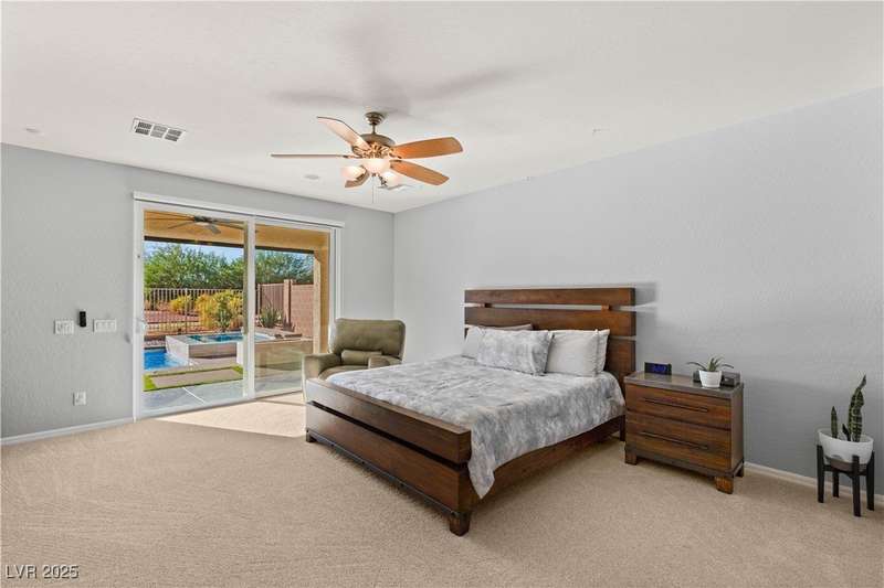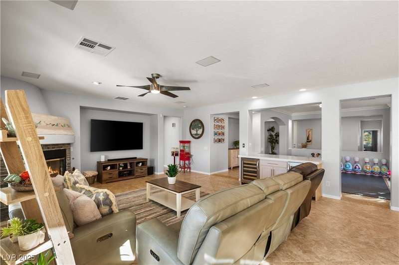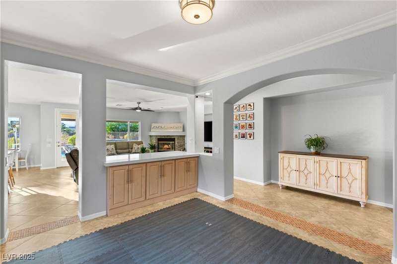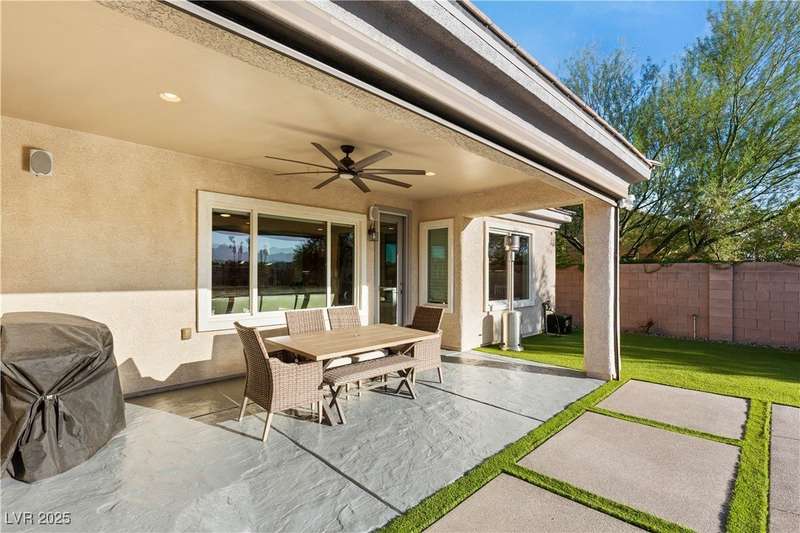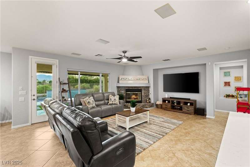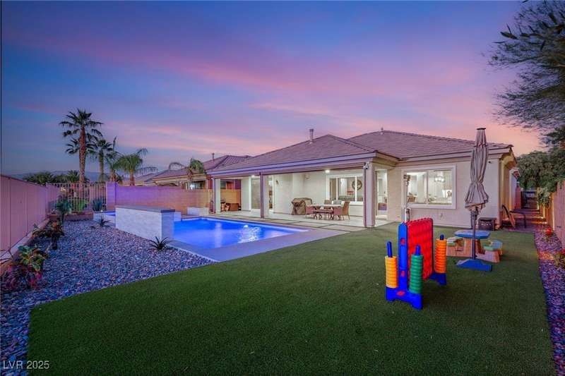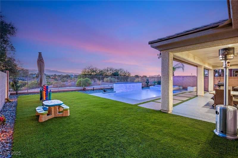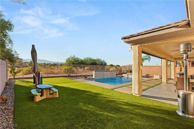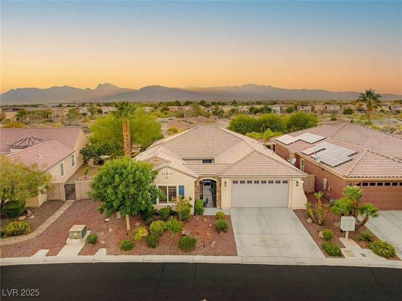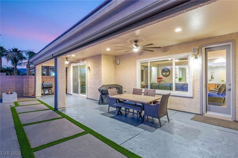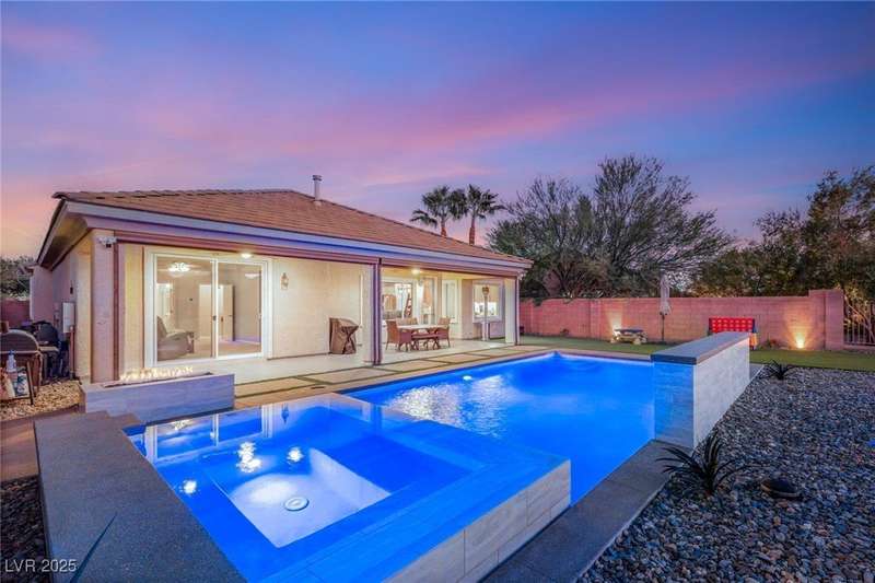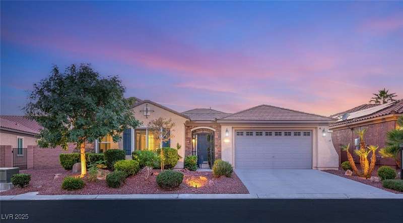 Rare opportunity to own a fully upgraded single-story home with pool and spa in a guard-gated community. Enter through a charming gated courtyard surrounded by desert landscaping and step into an open modern floor plan with 10-ft ceilings and Santa Fe textured walls. The great room showcases a designer adobe fireplace, built-in bar with dual wine fridges, and expansive dining area with views of the resort-style backyard. The chef’s kitchen features a large island, walk-in pantry, double ovens, and plenty of cabinet space. The spacious primary suite includes patio access, a spa-like bath with soaking tub, glass shower, and oversized walk-in closet. Enjoy total privacy in the backyard oasis with lap pool, infinity spa, waterfall wall, and fire pit—set against mountain views and no rear neighbors. Additional highlights include a flex room, Tonal gym setup in the cooled garage, epoxy flooring, Hunter Douglas shades, and a full Aqua Kleen water system.