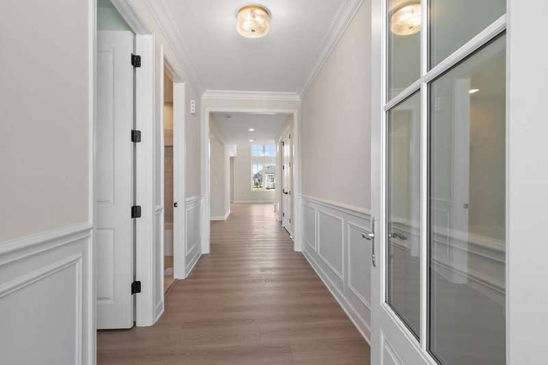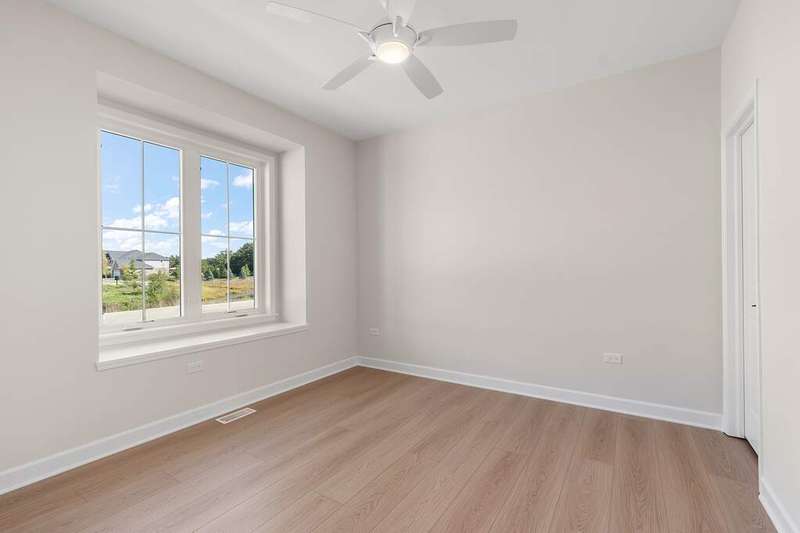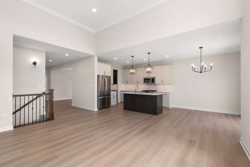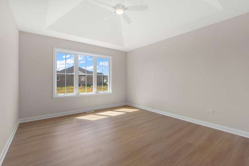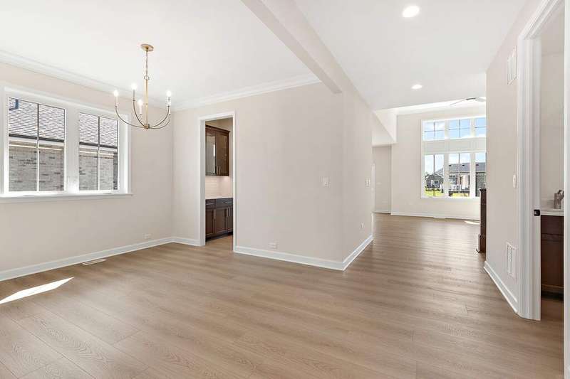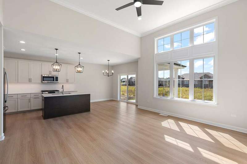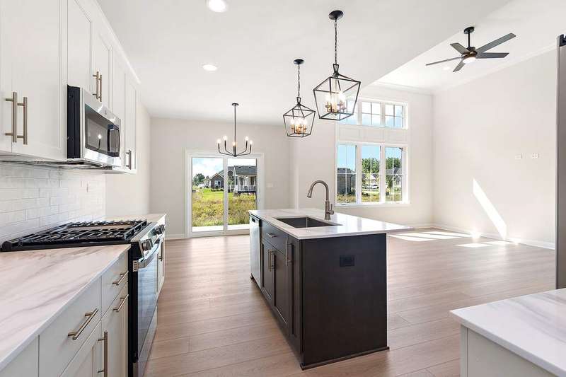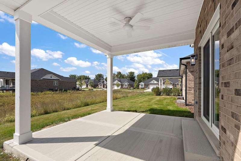 Welcome to your perfect retreat, an exquisite ranch villa nestled in a tranquil setting with picturesque views of a peaceful retention pond. This thoughtfully designed home features a sophisticated exterior, blending classic brick with durable LP SmartSide siding, premium Pella 250 series windows, and a spacious 12 x 12 covered patio ideal for outdoor relaxation. A beautifully designed interior will greet you as you enter through the grand 8' door with a secure 3-point locking system. The kitchen is a true masterpiece, featuring 42" off white cabinets, gleaming quartz countertops, a tiled backsplash, under-cabinet lighting, and a generous walk-in pantry for all your culinary needs. Adjacent to the kitchen, the family room welcomes you with soaring vaulted ceilings and refined crown molding. At the same time, the adaptable layout includes a charming dining room with crown molding and a butler pantry for those special gatherings. The luxurious primary suite is a personal retreat, offering a tray ceiling, comfort-height double vanity, a stunning 6' curbless seated shower, and a large walk-in closet with abundant storage space. Additional highlights include Hallmark vinyl-plank flooring in the main areas, 8' doors, crown molding, and wainscoting throughout the foyer for a grand touch, as well as an open basement staircase with rough-in plumbing ready for customization. Additional features include casing around windows, cased openings, and a laundry sink in the cabinet. Ideally located near shopping and major expressways, this villa offers both elegance and everyday convenience. Different floor plans and locations are available.