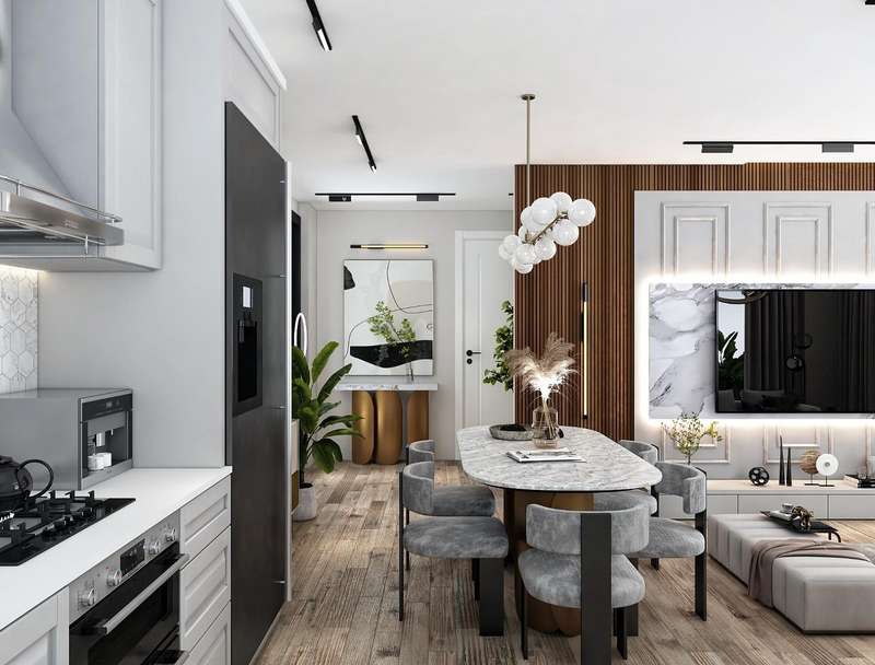The apartments for sale are equipped with air conditioning, a built-in kitchen set, an entryway cabinet, kitchen cabinets, a video intercom, a central satellite system, and a steel entrance door.