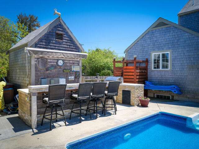 Centrally Located Nantucket Retreat with Backyard Oasis. Discover the perfect blend of custom and comfort in this newly renovated Nantucket home, ideally located with close proximity to Miacomet Golf Club, Surfside Beach and Town. Thoughtfully designed and currently configured as a five-bedroom, three-bath residence, this property offers exceptional versatility and a seamless indoor-outdoor lifestyle. Step inside to an open-concept first floor featuring a custom chef s kitchen with high-end appliances, flowing effortlessly into the bright living and dining areas ideal for entertaining. Two spacious bedrooms on this level share a beautifully updated full bath with a stall shower. Upstairs, the private primary suite offers a serene escape with a cozy sitting area and a custom-designed bathroom featuring a double vanity and oversized walk-in shower. The finished lower level expands the living space with a galley kitchen, TV/sitting area, two additional bedrooms, and a full bath perfect