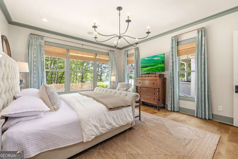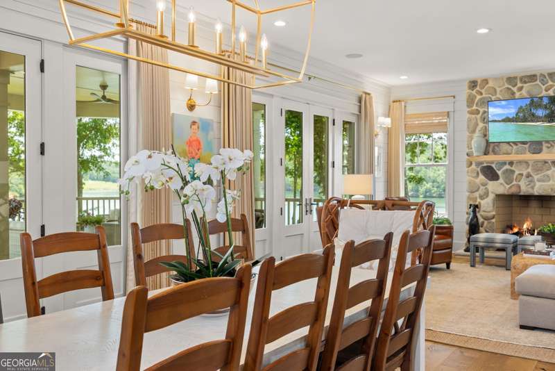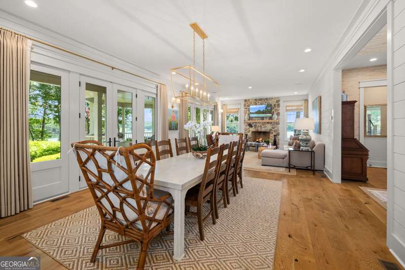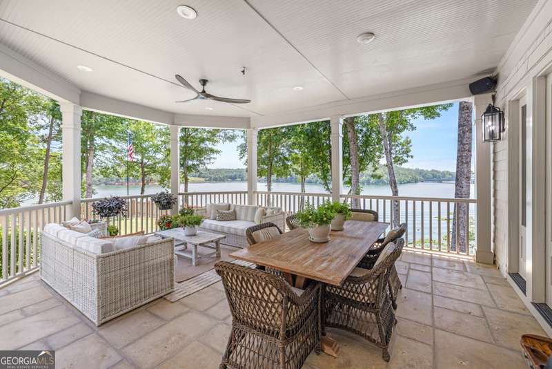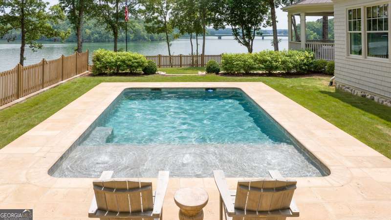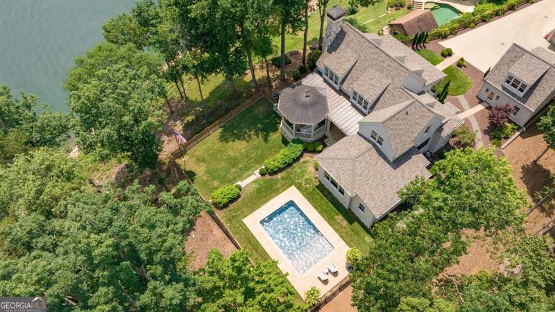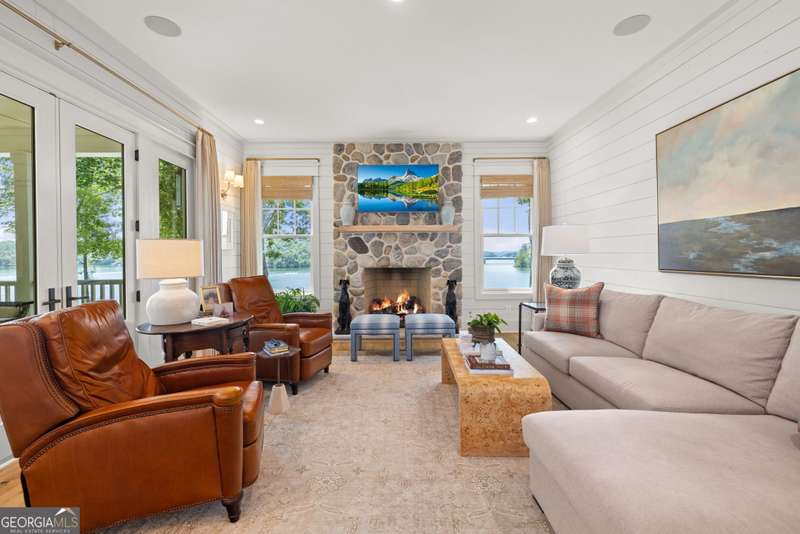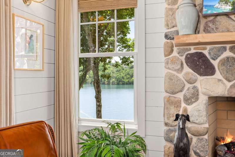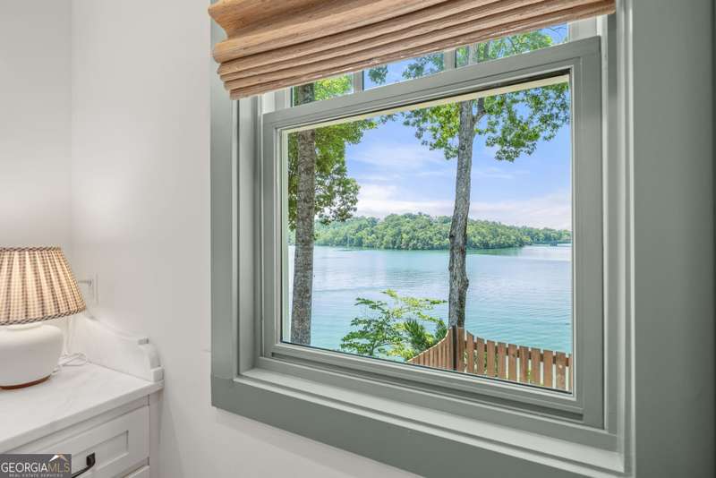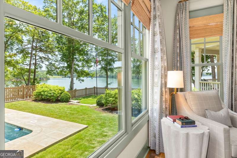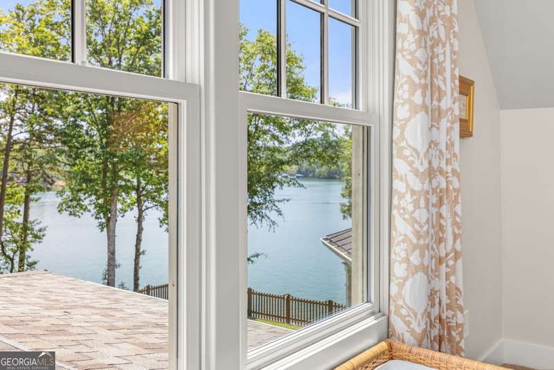 Southern coastal charm meets Lake Lanier luxury in this exceptional custom-designed estate, perfectly positioned on a private point lot surrounded by water and breathtaking lake views. Tucked away behind private gates and down a long, secluded driveway, this stunning home offers the ultimate in resort-style living, just minutes from the Chattahoochee Country Club and its private marina. Designed by renowned architect Stephen Fuller, this four-bedroom, four and a half bath residence blends timeless architecture with modern luxury. The home features a hardy shake and river rock exterior, beautifully landscaped shoreline with river rock detailing, and year round views from nearly every room. A heated pool, level fenced backyard, covered back porch, and two detached two-car garages complete the outdoor oasis. Inside, the open-concept layout is filled with natural light and framed by walls of glass, maximizing the lake views. The two-story foyer opens into a vaulted great room with a stone fireplace and an elegant dining space. The gourmet kitchen is a chef's dream, with quartzite countertops, a large island, custom cabinetry, stainless steel appliances including a six-burner gas range, and a spacious prep pantry that doubles as a bar and entertaining space. The main-level primary suite is a serene retreat with views of the pool and lake, and a spa-inspired bath featuring a soaking tub, dual vanities, custom shower, and two walk-in closets. A second main-level bedroom and full bath offer flexibility for guests or a home office. Upstairs, a central gathering area leads to two generous en suite bedrooms with custom closets. Additional highlights include a welcoming office area off the kitchen, a large laundry room, and an unfinished daylight terrace level with approximately 2168 square feet ready to be customized. Modern conveniences abound, with a whole-house generator, natural gas for cooking, fireplaces, heating, and pool, plus an irrigation system, professional landscaping, and outdoor lighting. This home is a rare opportunity to enjoy the best of lakefront living, thoughtfully designed for both everyday comfort and exceptional entertaining.