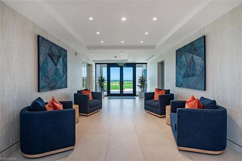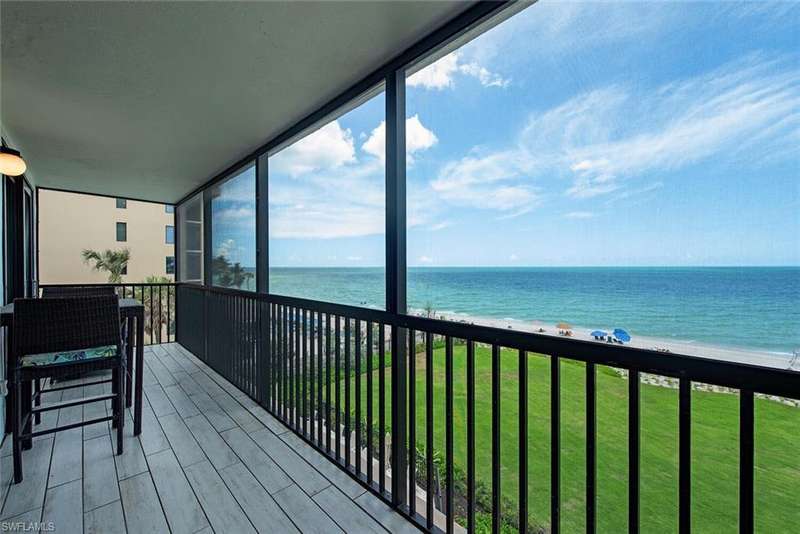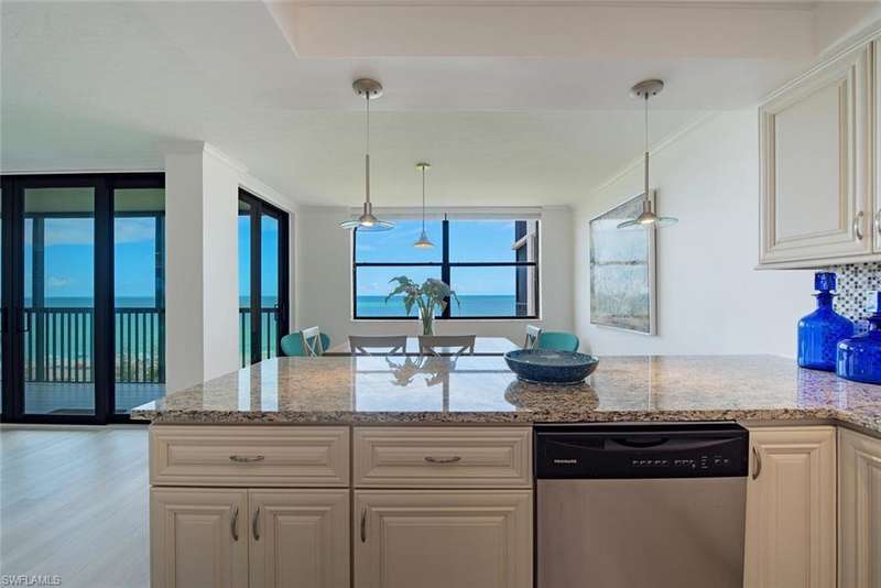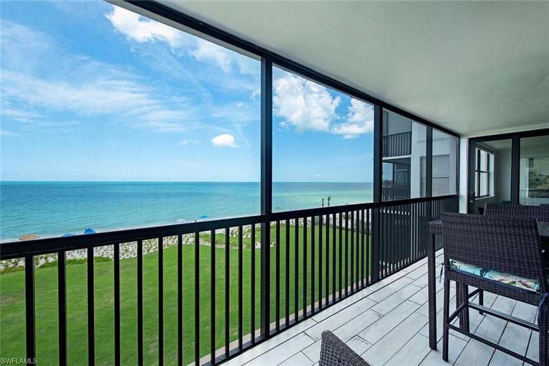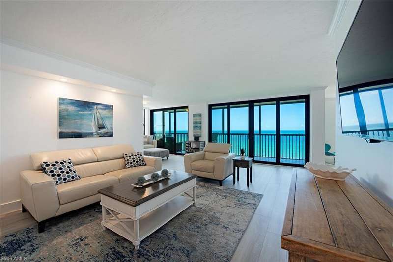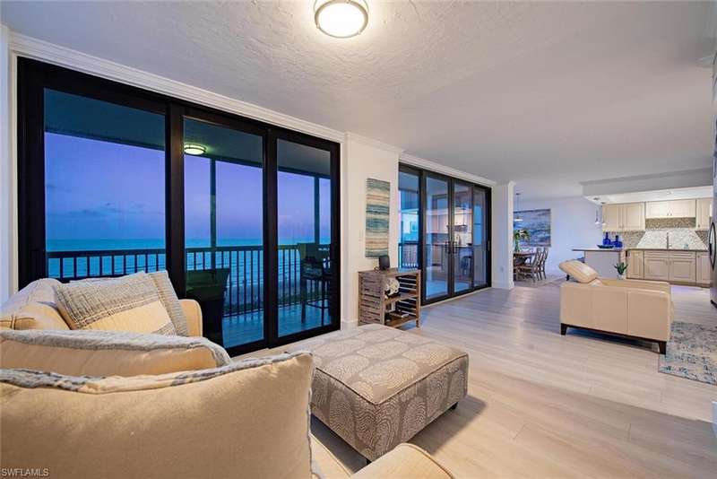 Renovated 4th floor beachfront condo offering spectacular sunset views of the beach and Gulf at Seawatch of Vanderbilt Beach. This turn-key furnished unit features a wide-open floor plan with a spacious living area, two bedrooms, two full en-suite bathrooms and an open den that could easily be enclosed if desired. Highlights include new wide plank wood-look luxury vinyl floor throughout, an open kitchen with a large peninsula, numerous windows and sliders that surround the space to soak in the stunning views and a wide lanai perfect for watching sunsets and enjoying the coastal breezes. The primary suite features a large walk-in-closet and a modern en-suite bathroom with a dual vanity and a glass enclosed shower. The interior of the unit has been well maintained, was just recently repainted and has a full-size washer dryer in the unit. Seawatch is an intimate beachfront building with 26 units offering direct beach access, an expansive grassy lawn, a sparkling pool and sundeck, new