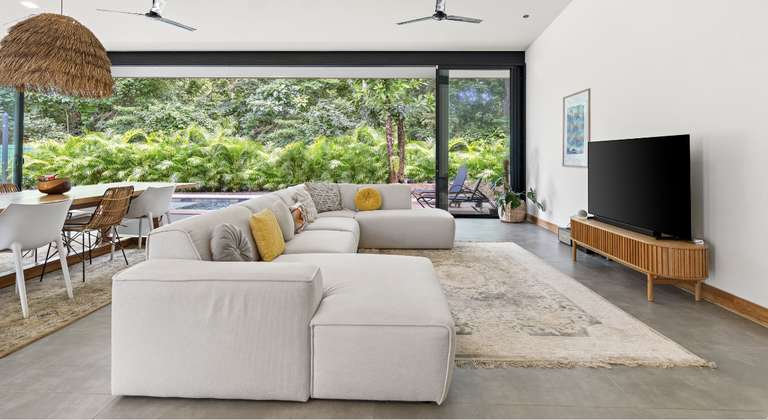 The villa features a spacious open-concept living area with a seamless integration of indoor and outdoor spaces. Accordion-style sliding glass doors span the entire back facade, opening onto the pool and terrace, creating an ideal space for entertaining or relaxing. Additional amenities include: