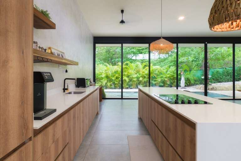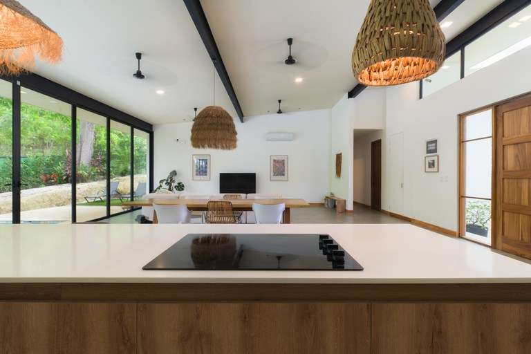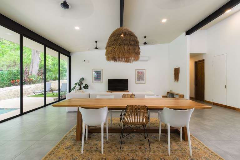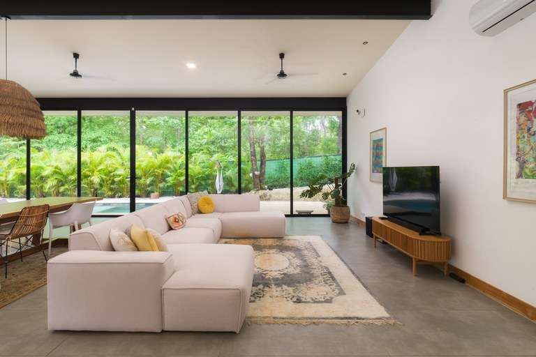 Set on an 817 m2 lot, the villa spans 340 m2 of living space, offering generous interiors and a seamless indoor-outdoor flow. The open-concept layout connects the living and dining areas to the outdoors through accordion-style sliding glass doors, leading to a sunlit terrace and an inviting beach-entry pool—perfect for lounging, entertaining, or safe play for children. Every detail of this home has been crafted for both comfort and ease of living, from the modern finishes to the private electric gate and convenient parking with direct access to the community's main road.