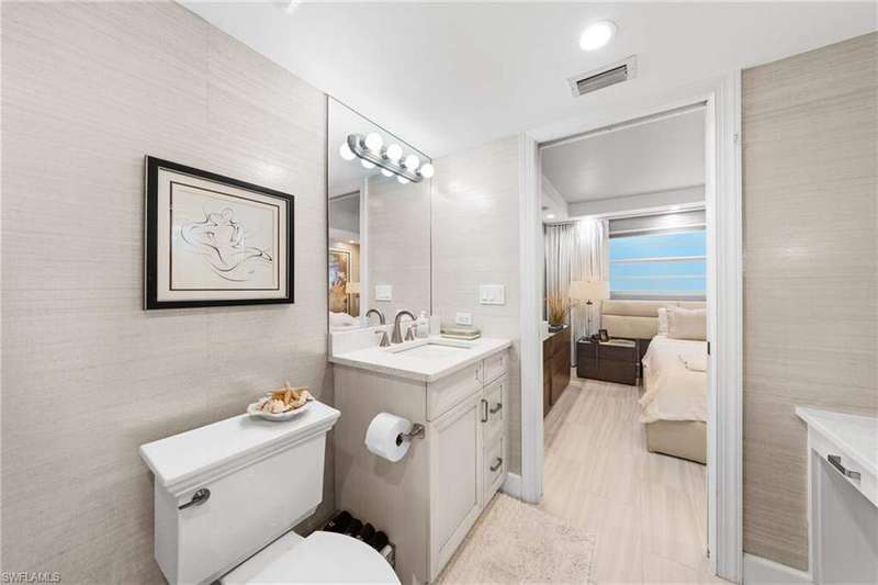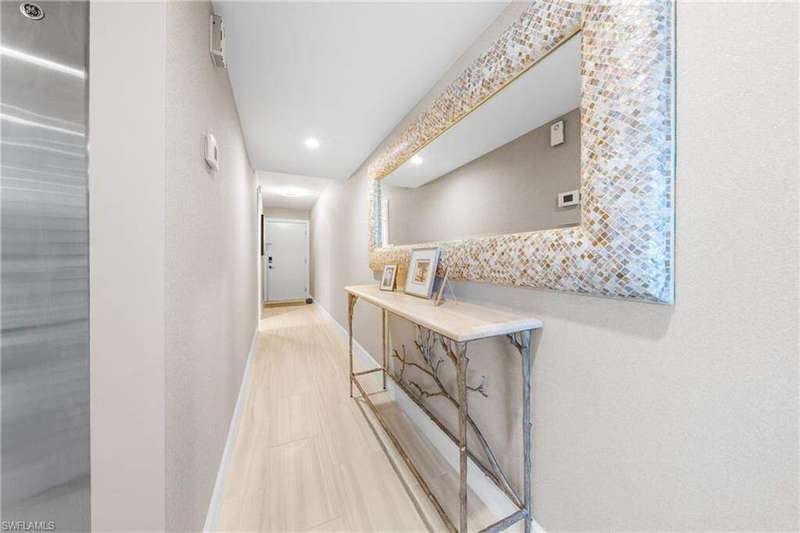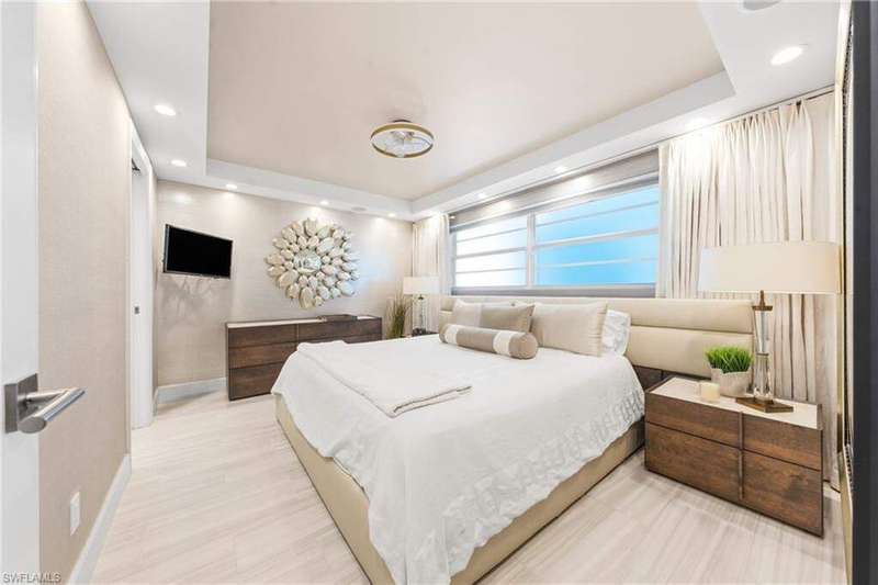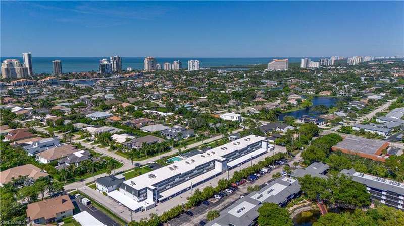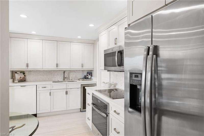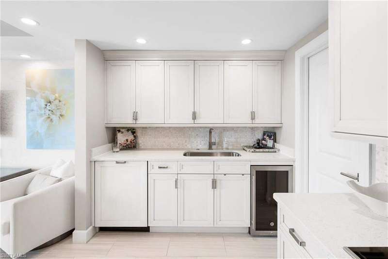 Your Naples retreat awaits! Welcome to this stunning turnkey 1 bedroom, 1 bath condo in the heart of highly-desirable Park Shore. Completely renovated down to the studs by Stock Development and professionally furnished by Clive Daniel, this residence offers a luxurious, move-in-ready lifestyle west of US-41. You are just moments away from the private Park Shore beach, Venetian Village, Waterside Shops,and a short drive to Vanderbilt Beach, Mercato and downtown Naples' trendy boutique shopping and dining scene. Designed with chic sophistication by award-winning designer, Wilfredo Emanuel, every detail exudes quality and timeless style. Step inside to a bright living area with impact-resistant windows overlooking the Harborside Terrace grounds and Naples beachfront skyline. The gourmet kitchen features stainless steel appliances, soft-close cabinetry, a wine fridge, and quartz countertops and opens to the elegant living area. The beautifully appointed bedroom has custom bedding and window treatments, silk wallpaper and features a generously sized walk-in closet and a beautifully appointed bathroom with custom vanity, glam counter, and shower/tub combination. Additional features include Sonos sound system, tray ceilings, dimmable, recessed lighting, neutral tile flooring throughout, in residence laundry, newly installed digital, remote thermostat and hot water heater, and a deeded carport with extra storage. The elevator is conveniently located right outside your door for effortless access. Harborside Terrace offers a community pool, community room, and a friendly atmosphere for seasonal and full-time residents alike. Experience the perfect blend of location, design, and access to Naples' finest beaches, dining, shopping, and destinations.
