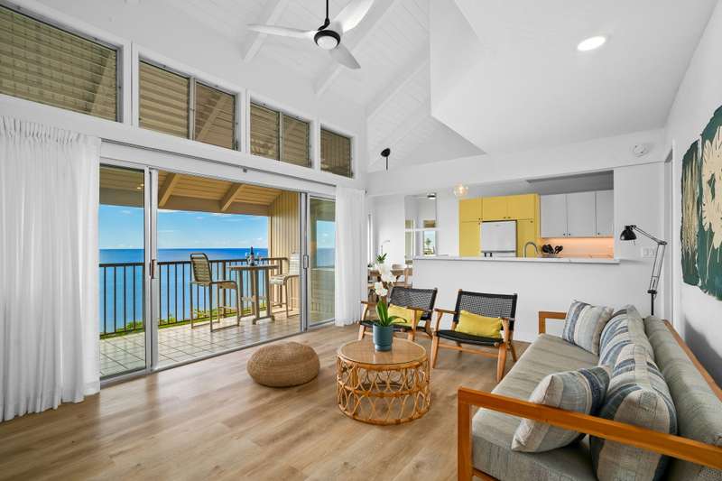 Completely remodeled in 2025, with every detail thoughtfully updated - - fesh white interiors and new flooring give the space a clean, modern feel, while the soaring open-beam ceilings add a sense of volume and light. The living, dining, and kitchen areas flow naturally together and open onto a covered lanai — the perfect spot for sunset cocktails, whale watching, or simply soaking in the ocean breezes.