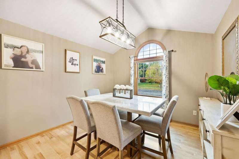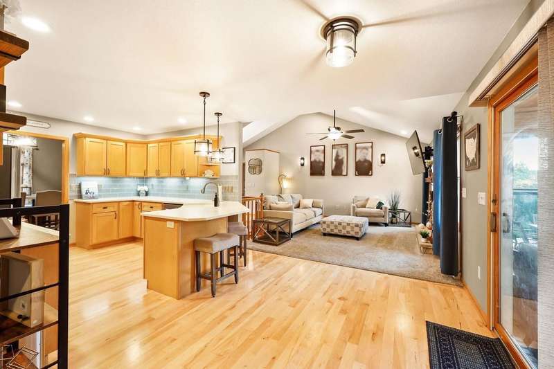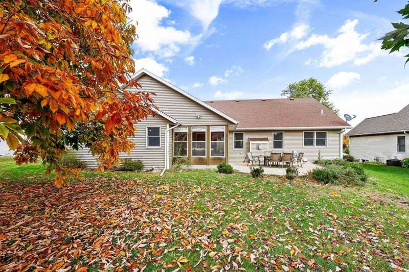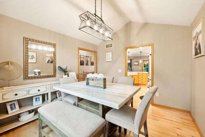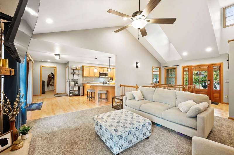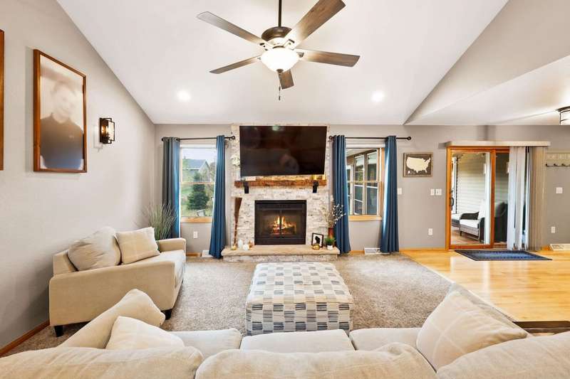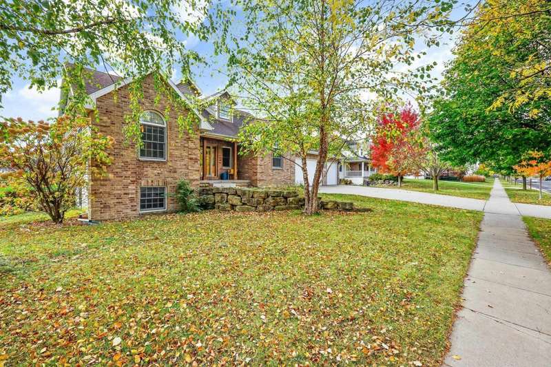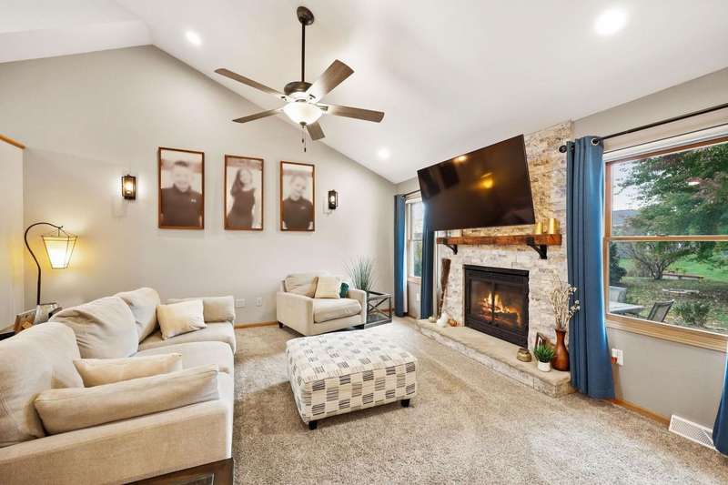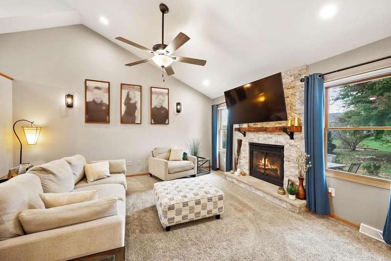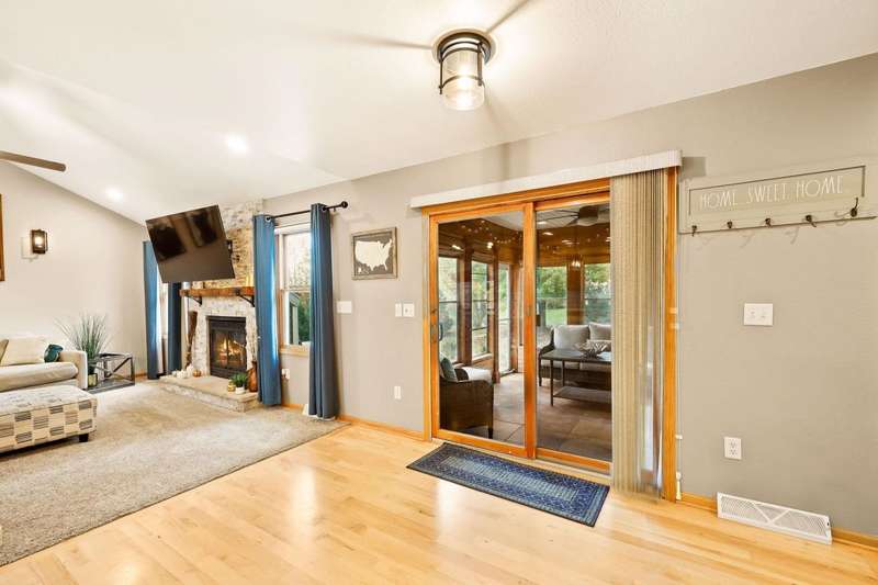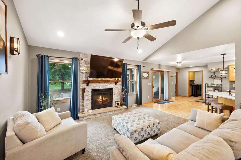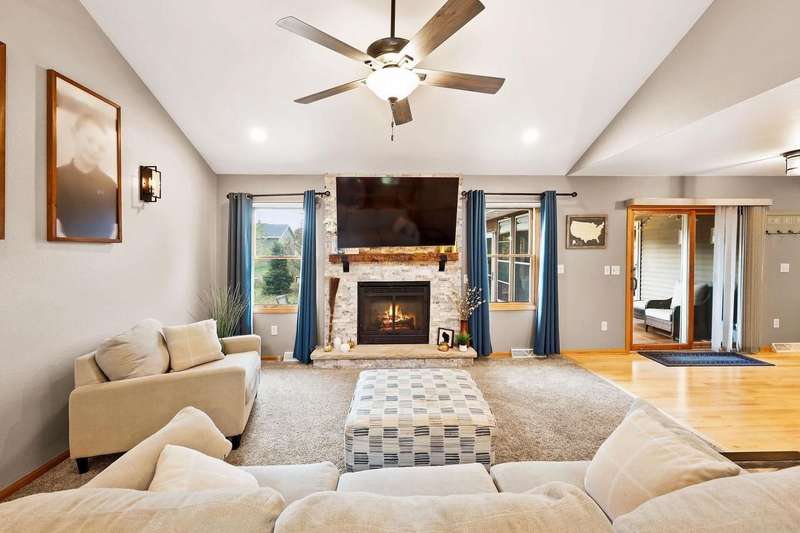 Step inside this beautifully updated 4 bedroom, 3 bath home in the heart of Cambridge! Features include vaulted ceilings, hardwood floors, 3 season sunroom and a cozy gas fireplace. The spacious primary suite offers a walk in closet, plenty of windows, access to the 3 season sunroom and a roomy jetted tub with separate shower. Then, the lower level includes a built in wet bar, full bath, a huge 4th bedroom and tons of storage space! Enjoy the back patio with a large yard - room for everyone to have fun, 3 car garage, and walking distance to the elementary school!