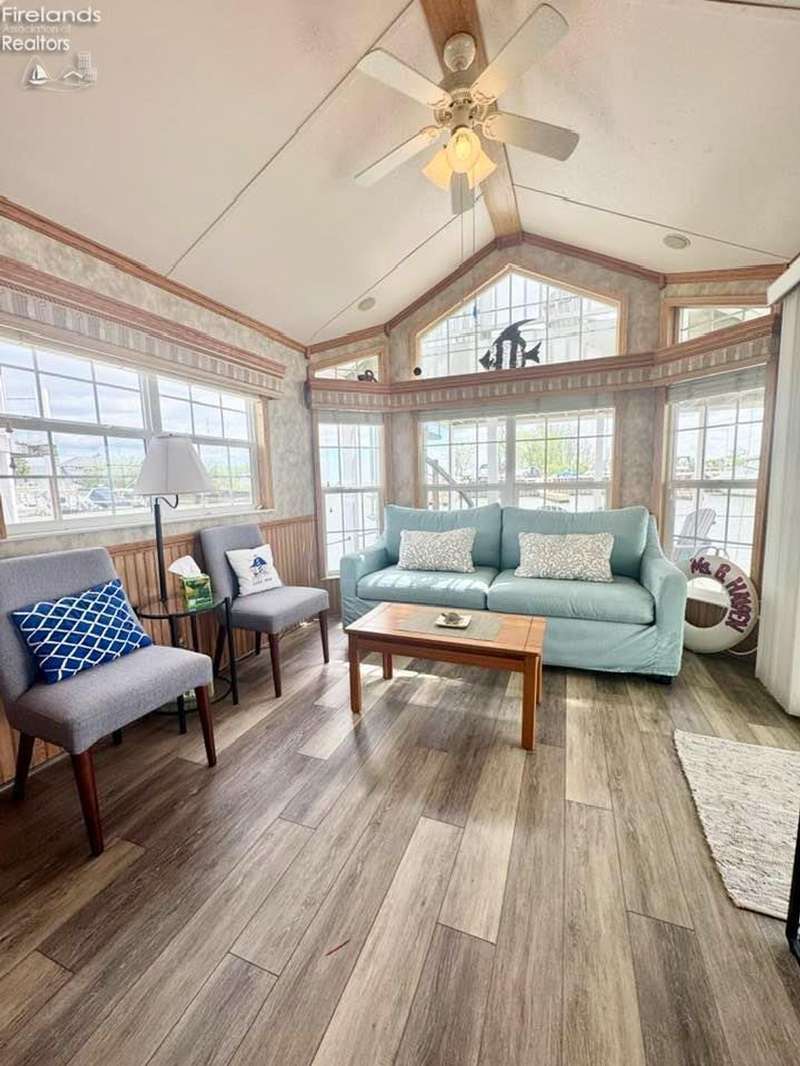 WATERFRONT, DOCKAGE, DIRECT LAKE ACCESS... ALL WITHOUT BEING ONE MILLION $!!LIFE ON THE WATER -- IS THE HAPPY PLACE ... What about living on the water with 50ft dock, at the door! The perfect place to entertain and relax with marina and lakeviews on the two decks! Private gated community offering easy living. Pool and clubhouse access. First floor provides open concept living with electric fireplace, patio door to deck, and views of the water. Eat-in kitchen with corian counters, appliances stay. First floor bathroom. Bedroom on first has a closet. Current owner added the second floor with two bedrooms (loft style) with patio door leading to the amazing deck. The ideal living scenario -- dockage, pool, waterfront -- all at an affordable price! No weekly rental allowed. Seasonal usage. Don't miss out on this fantastic find!