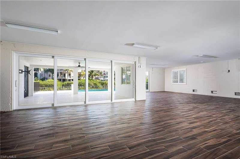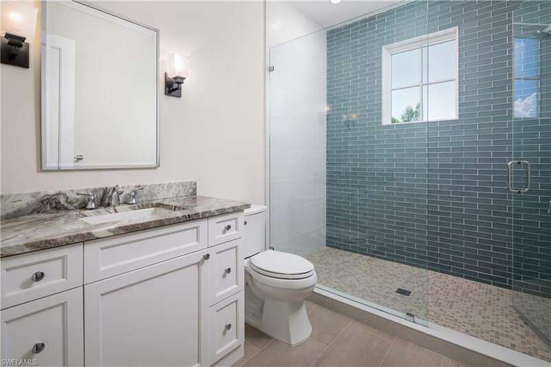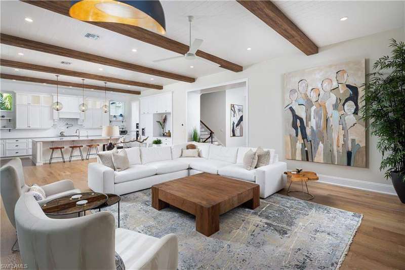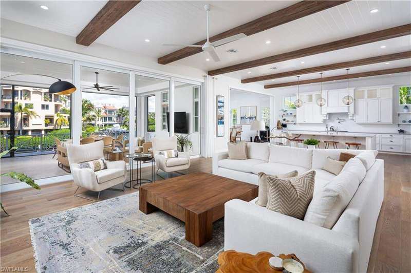 Luxury 2018-built coastal contemporary home in the exclusive double-gated Southport on the Bay, within North Naples' premier "Barefoot Beach" community. A beach and boater's paradise, this estate offers deeded beach access just a short walk away and direct Gulf-access only 10 minutes from your private boat dock and lift (featuring a new panel and mechanics). Relax and entertain outdoors with a pool and spa surrounded by new travertine decking and plenty of lounging space, plus an upper-level screened lanai with summer kitchen -complete with a new gas grill and refrigerator-ideal for dining al fresco. Brimming with natural light, this home offers an open floor plan with 4 bedrooms plus den/office (all bedrooms with en suite baths), soaring 12 ft ceilings, wide-plank hardwood floors, and tongue-and-groove ceilings with custom wood beams. The chef's kitchen boasts Miele appliances, a spacious butler's pantry, and stunning custom cabinetry with granite and quartz counters. The primary suite is a private retreat, complete with French doors opening to an open-air balcony overlooking the bay, a wet bar with wine fridge, a large walk-in closet with custom built-ins, and a spa-like bath with dual vanities, soaking tub, and a spacious rainfall shower. Additional highlights include a brand-new tankless water heater, new audio/visual system and tower, PGT impact glass windows and sliders rated for 170 mph, over 400 sq ft of ground-floor flex space, private elevator, and freshly painted exterior. Optional membership to the exclusive "Club at Barefoot" provides access to tennis, two restaurants, beachside food and beverage service, and more. Conveniently located near fine dining, RSW Airport, Mercato, and Waterside Shops, and just 15 miles from the renowned Fifth Avenue in Naples, this home is a true gem in the heart of Barefoot Beach.
