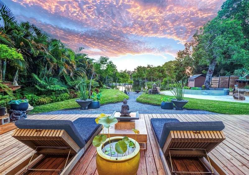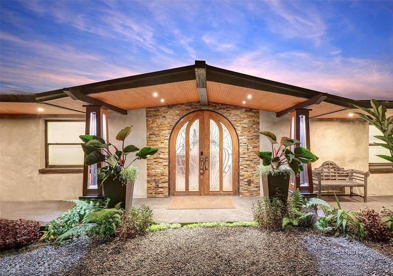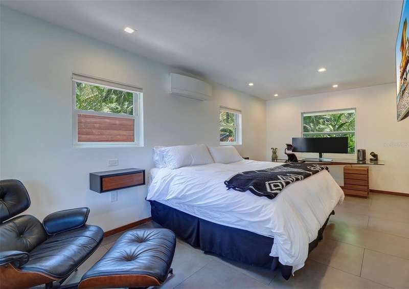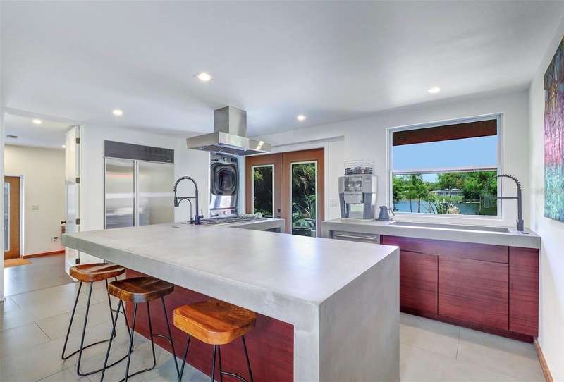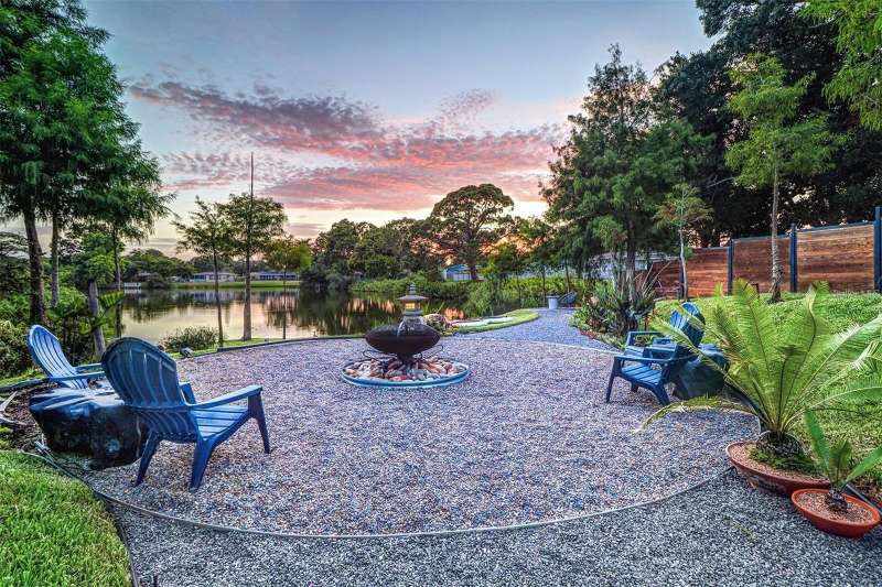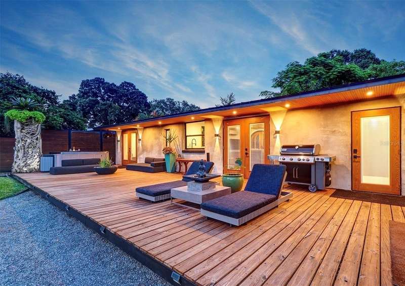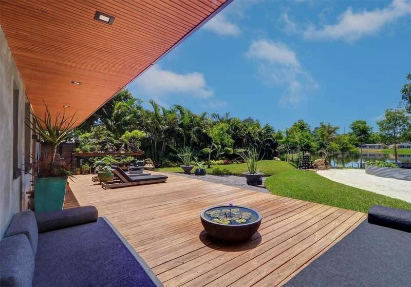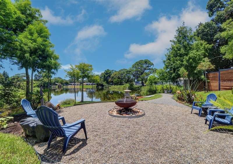 Tucked along the peaceful shores of a private lake, this masterfully renovated Mid-Century Modern residence, inspired by the timeless designs of Frank Lloyd Wright, effortlessly combines modern living with seamless indoor-outdoor connectivity. Defined by striking architectural lines and a large picture window that frames sweeping water views, the home invites an abundance of natural light, creating an atmosphere of serene elegance. Situated in a non-flood and non-evacuation zone, this property offers an unparalleled sense of privacy, ideal for paddle boarding or simply immersing yourself in the lush, picturesque surroundings. The chef’s kitchen is nothing short of extraordinary, featuring custom countertops, top-tier appliances, a built-in hibachi grill, and a prep sink—designed to inspire both the home cook and the culinary expert. French doors off the kitchen open to a spacious outdoor living area, perfect for al fresco dining or entertaining. The open-concept living spaces, with their bespoke finishes and impeccable attention to detail, epitomize refined craftsmanship, harmoniously combining form and function. Each of the home’s bedrooms offers a private entrance that leads directly to the lake, providing a peaceful retreat just steps from your door. Whether enjoying a morning coffee on your personal patio or relaxing in your lakeside sanctuary, these direct connections to the water enhance the home’s tranquil, restorative ambiance. The outdoor living space is designed for relaxation and entertainment, featuring a high-end above-ground spa, a conveniently placed outdoor grill for effortless year-round dining, and an elegant fire pit for cozy evenings by the water. Whether dining, soaking in the spa, or gathering around the fire, the lakeside setting provides the perfect backdrop for both peaceful reflection and lively gatherings. Updates, including a new metal roof, energy-efficient A/C, and a Kohler 20-watt generator offering up to 30 days of power backup, ensure that comfort and peace of mind are maintained year-round. Just minutes from vibrant downtown and the area’s pristine beaches, this home offers the rare opportunity to enjoy the perfect balance of secluded lakeside living with convenient access to all the cultural, dining, and recreational amenities. An extraordinary find for those seeking a lifestyle defined by luxury, privacy, and design.