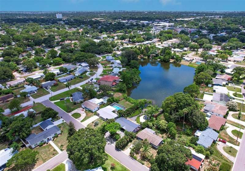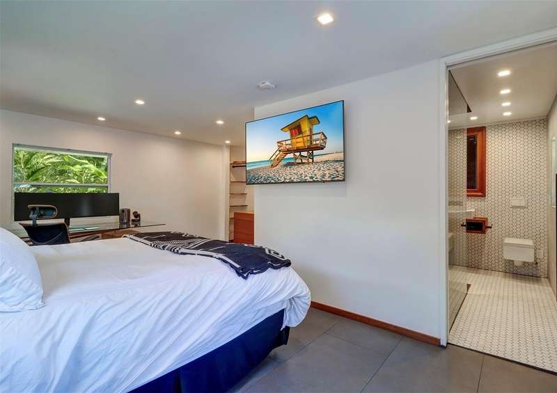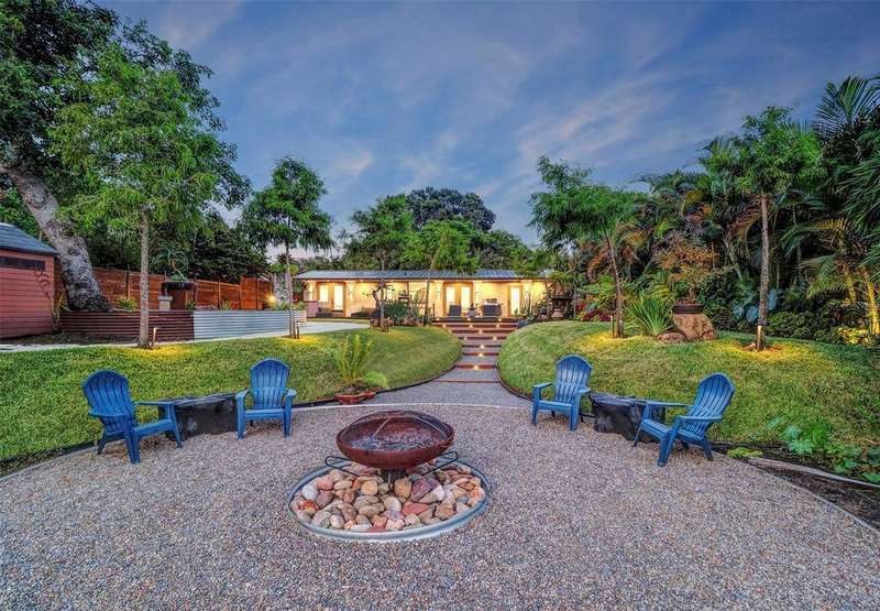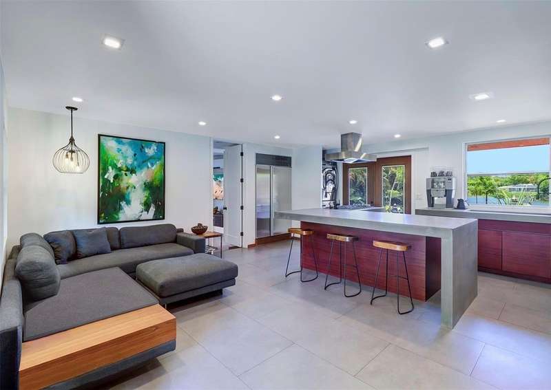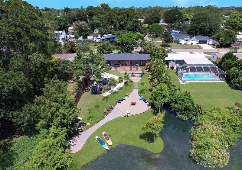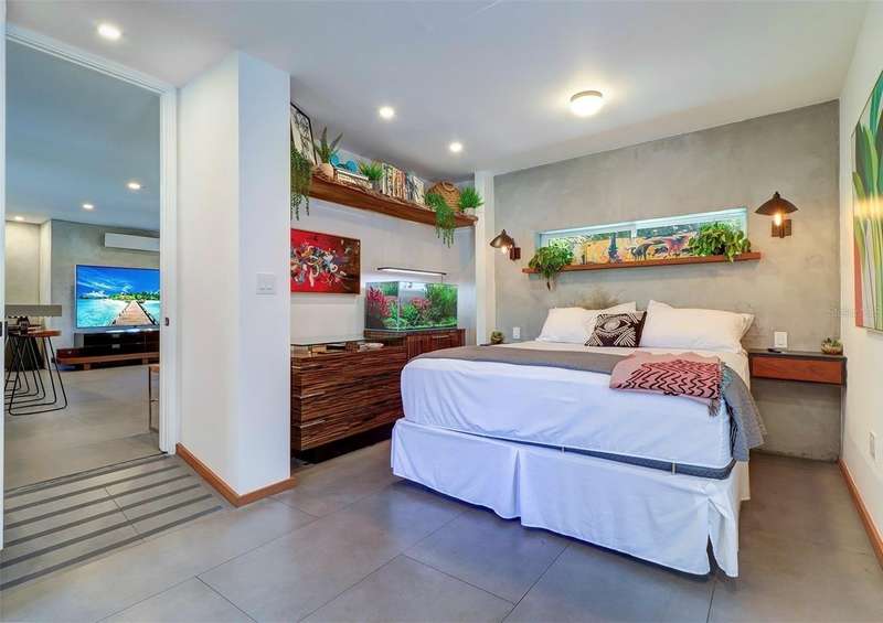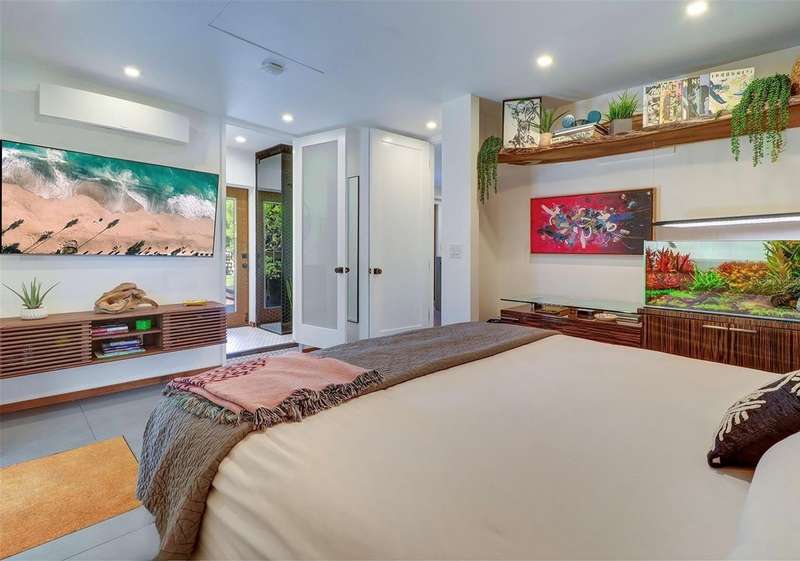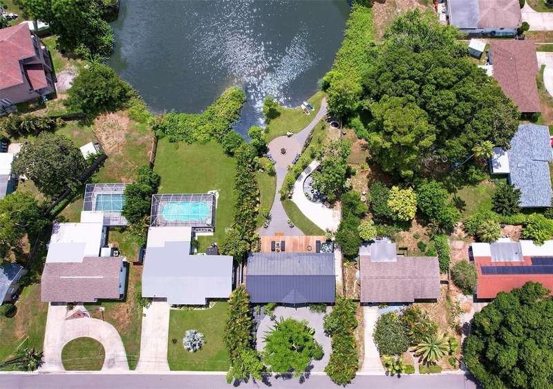 Tucked along the peaceful shores of a private lake, this masterfully renovated Mid-Century Modern residence, inspired by the timeless designs of Frank Lloyd Wright, effortlessly combines modern living with seamless indoor-outdoor connectivity. Defined by striking architectural lines and a large picture window that frames sweeping water views, the home invites an abundance of natural light, creating an atmosphere of serene elegance. Situated in a non-flood and non-evacuation zone, this property offers an unparalleled sense of privacy, ideal for paddle boarding or simply immersing yourself in the lush, picturesque surroundings. The chef’s kitchen is nothing short of extraordinary, featuring custom countertops, top-tier appliances, a built-in hibachi grill, and a prep sink—designed to inspire both the home cook and the culinary expert. French doors off the kitchen open to a spacious outdoor living area, perfect for al fresco dining or entertaining. The open-concept living spaces, with their bespoke finishes and impeccable attention to detail, epitomize refined craftsmanship, harmoniously combining form and function. Each of the home’s bedrooms offers a private entrance that leads directly to the lake, providing a peaceful retreat just steps from your door. Whether enjoying a morning coffee on your personal patio or relaxing in your lakeside sanctuary, these direct connections to the water enhance the home’s tranquil, restorative ambiance. The outdoor living space is designed for relaxation and entertainment, featuring a high-end above-ground spa, a conveniently placed outdoor grill for effortless year-round dining, and an elegant fire pit for cozy evenings by the water. Whether dining, soaking in the spa, or gathering around the fire, the lakeside setting provides the perfect backdrop for both peaceful reflection and lively gatherings. Updates, including a new metal roof, energy-efficient A/C, and a Kohler 20-watt generator offering up to 30 days of power backup, ensure that comfort and peace of mind are maintained year-round. Just minutes from vibrant downtown and the area’s pristine beaches, this home offers the rare opportunity to enjoy the perfect balance of secluded lakeside living with convenient access to all the cultural, dining, and recreational amenities. An extraordinary find for those seeking a lifestyle defined by luxury, privacy, and design.