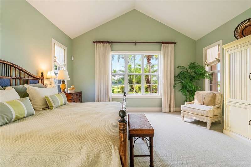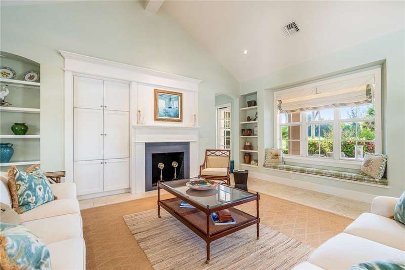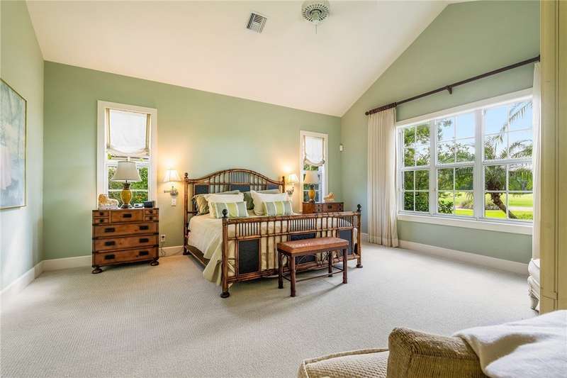 Designed by renowned architect Peter Moor, charming one of a kind 3br/3.5ba golf estate. Custom details include dramatic vaulted ceilings, fireplace, stone flooring, expansive primary suite with luxurious bath and dual walk-in closets. Open great room plan with built-ins, grand eat-in island kitchen. Covered lanai overlooks the large lap pool and lush yard, all situated on one of Orchid Island's best estate size lots with beautiful lake and golf course views. Garaging for 3 cars plus golf cart. Room sizes approximate.