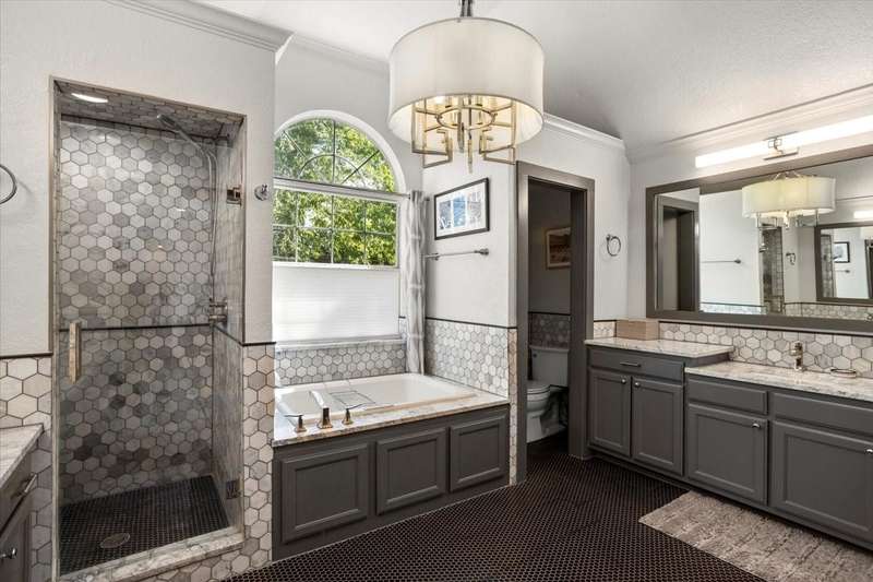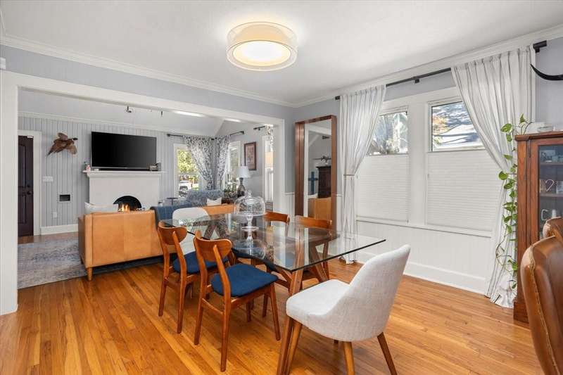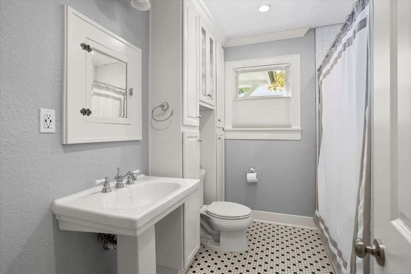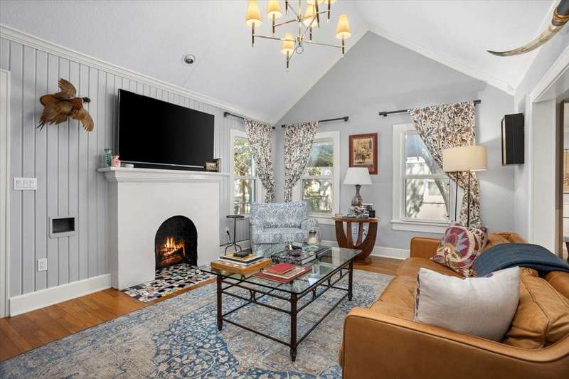 Charming Berkeley cottage featuring a welcoming front porch with iron railing. Step inside to a light-filled living room with vaulted ceilings, hardwood floors, and a decorative fireplace. The living, dining, and kitchen areas flow together, creating an open and comfortable layout.The kitchen includes granite countertops, a gas range, breakfast bar, and a built-in corner cupboard. It overlooks the backyard, offering a pleasant view and easy access for entertaining.The spacious primary suite features a large bathroom with a jetted tub, separate shower, double sinks, vanity, and heated floors. Two additional bedrooms share a hall bathroom.Recent updates include recessed lighting and a deck off the back of the home. The private backyard features low-maintenance turf and an eight-foot wood fence for privacy.This home combines classic Berkeley character with modern touches, offering comfortable living in a desirable location.