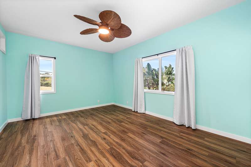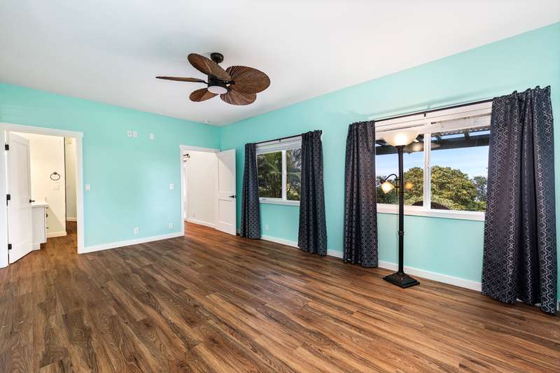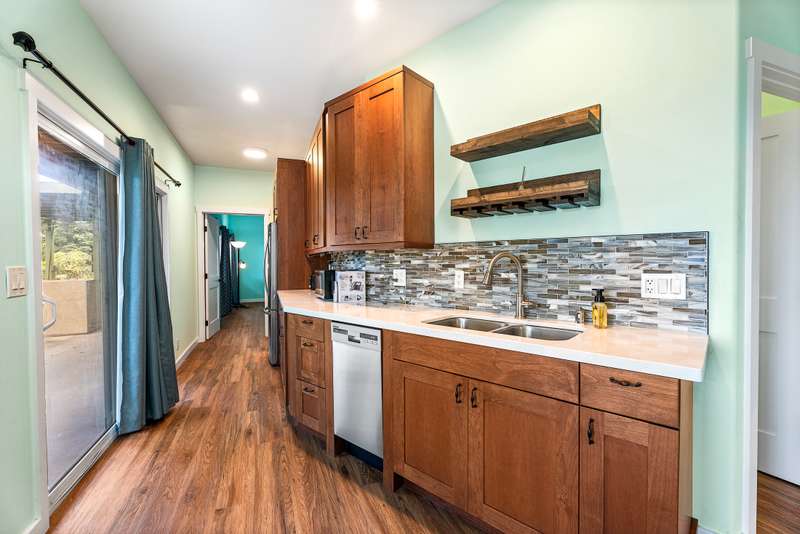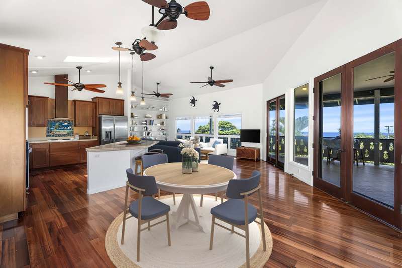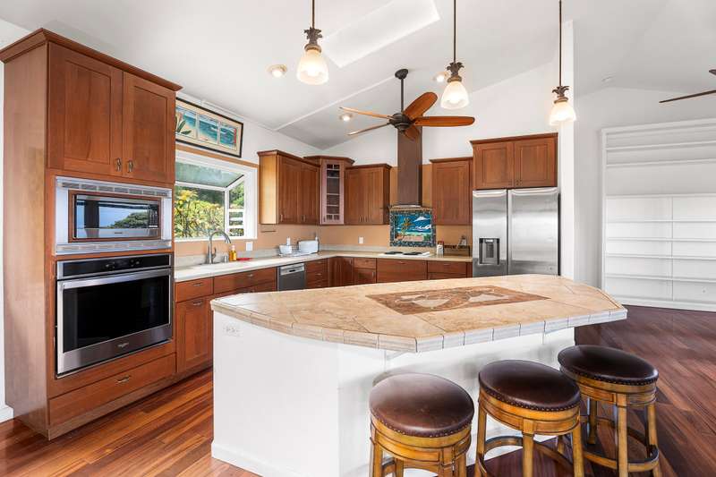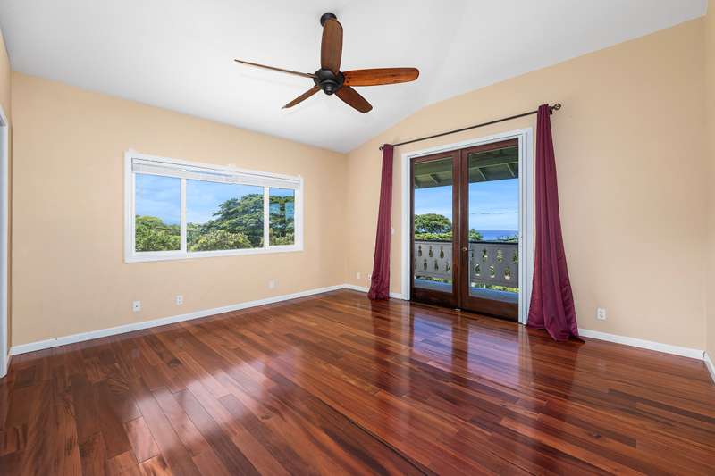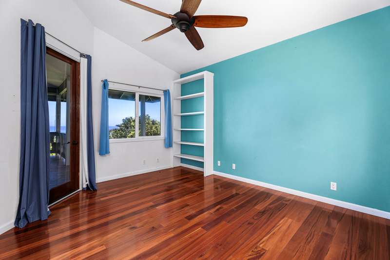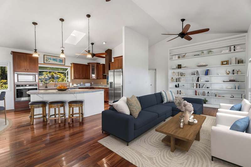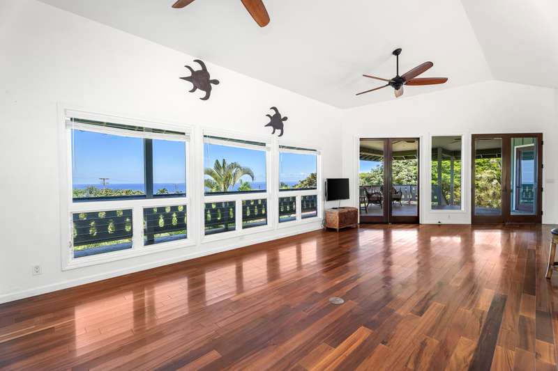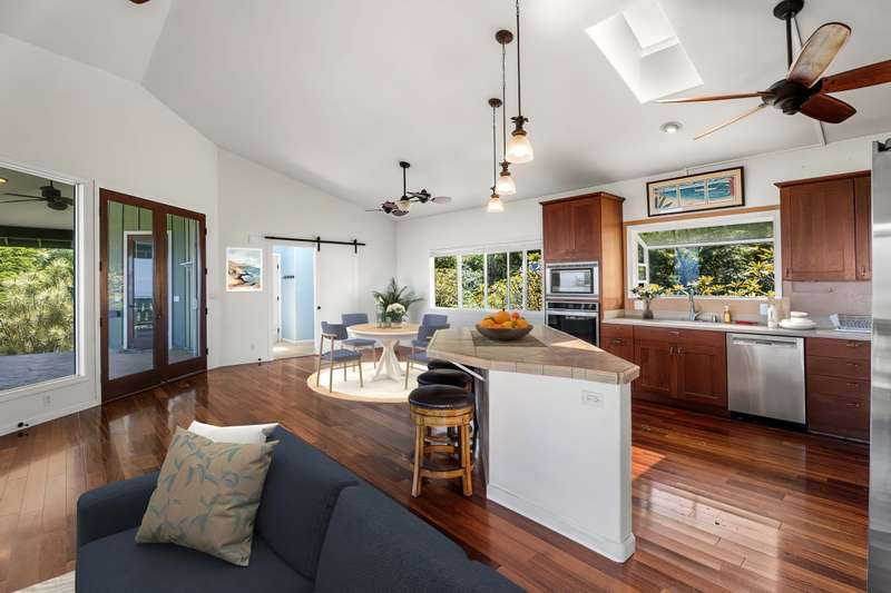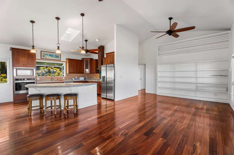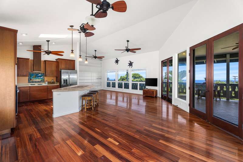 - Gorgeous Koa wood flooring and vaulted ceilings throughout the living room, kitchen, & bedrooms