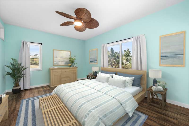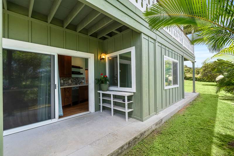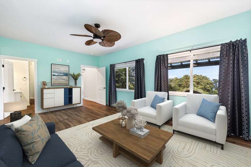 The upper level features two bedrooms, two full bathrooms, and a spacious great room with vaulted ceilings and stunning Koa wood flooring throughout. The open-concept design seamlessly connects the living area, dining space, and kitchen to a generous lanai—perfect for entertaining and embracing Hawai‘i’s signature indoor-outdoor lifestyle. Both bedrooms are located on opposite sides of the home and offer direct access to the lanai for added comfort and privacy.