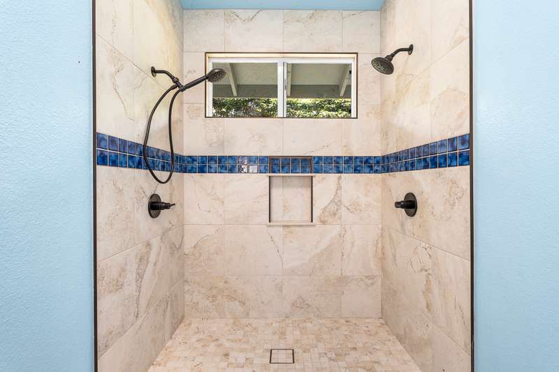 The lower-level 2-bedroom, 1-bath suite includes an upgraded wet bar with new quartz countertops and Alder cabinetry, its own private lanai, and an outdoor kitchen area—ideal for guests or extended family.