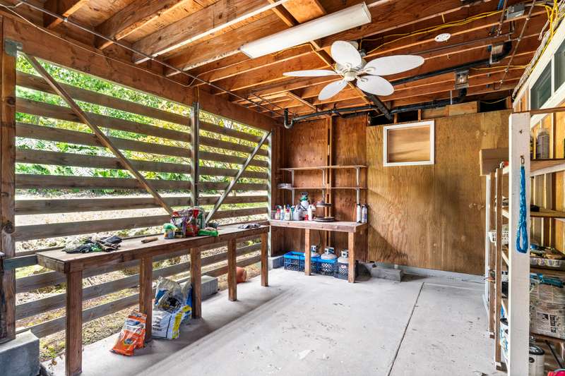Situated on a lush one-acre lot, the property features a variety of mature, fruit-bearing trees and plants, including mango, banana, macadamia nut, guava, lychee, avocado, and more.. An oversized two-car garage with an adjacent workshop and additional storage areas provides ample room for hobbies, tools, or potential expansion.