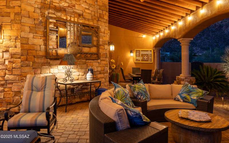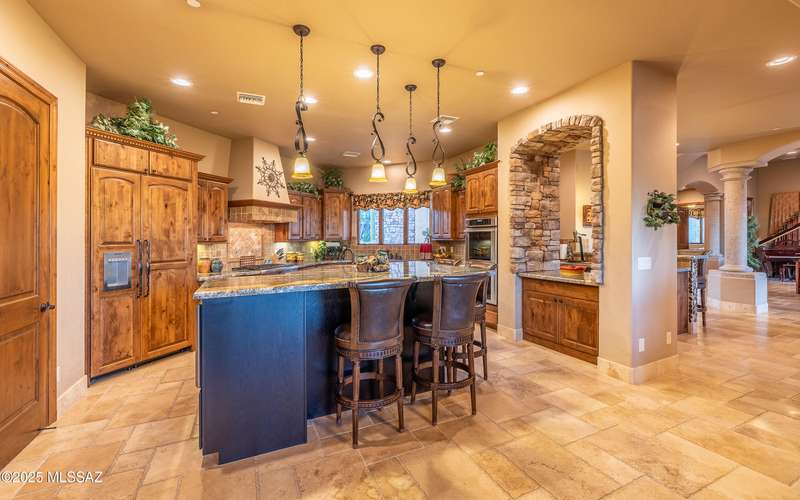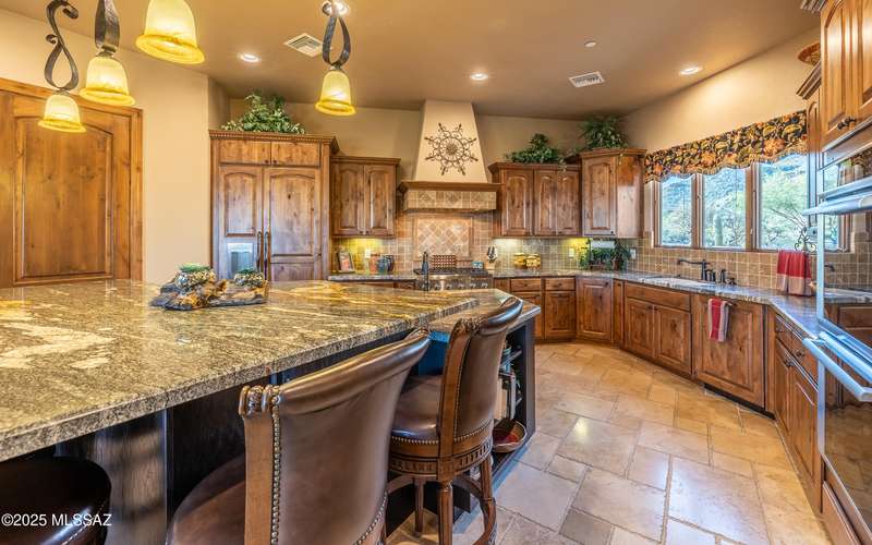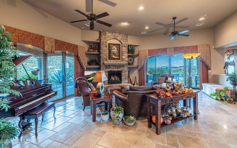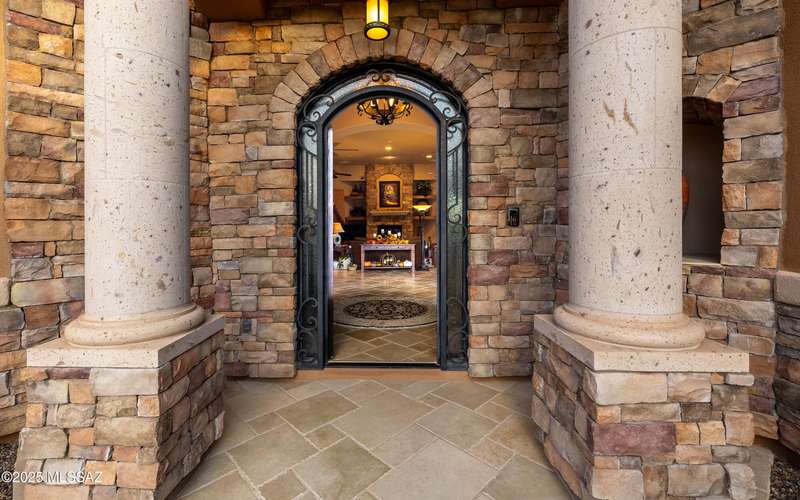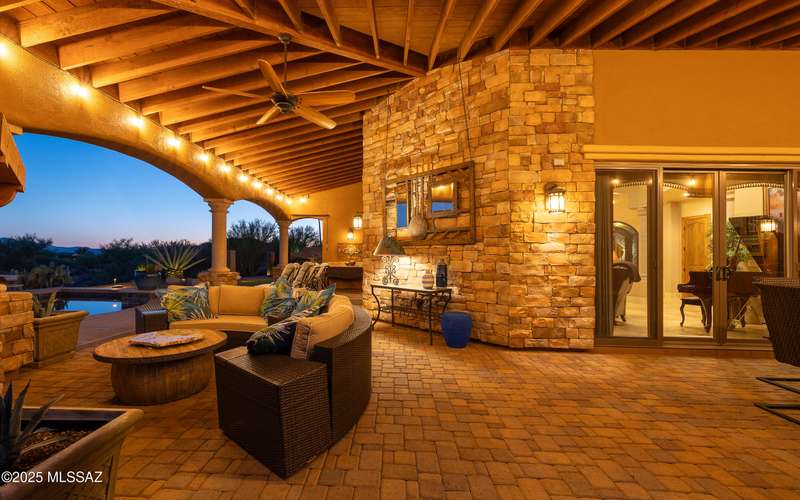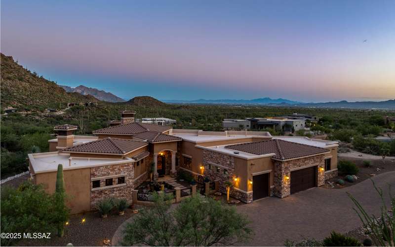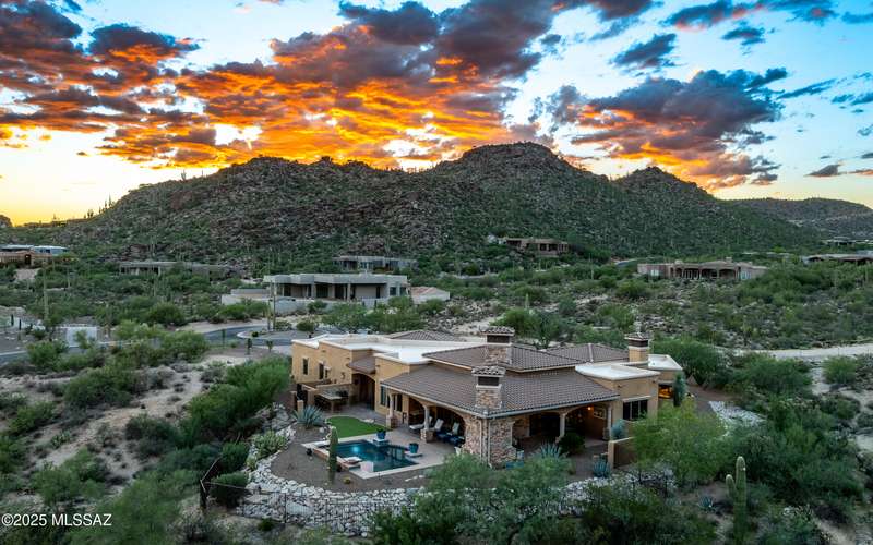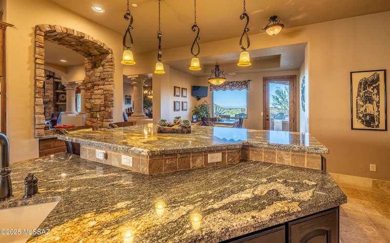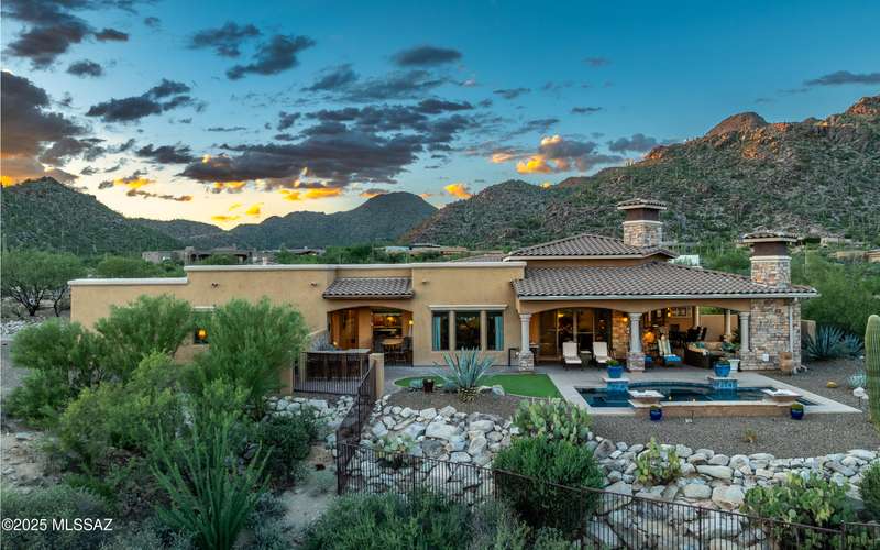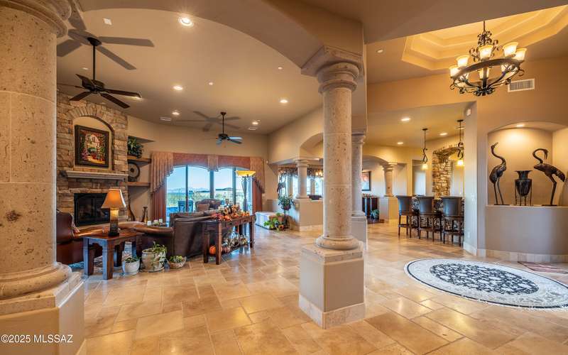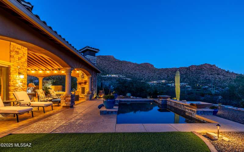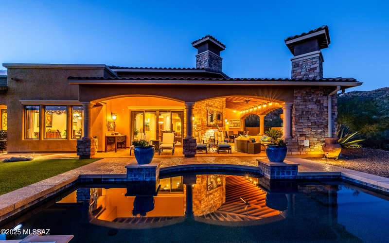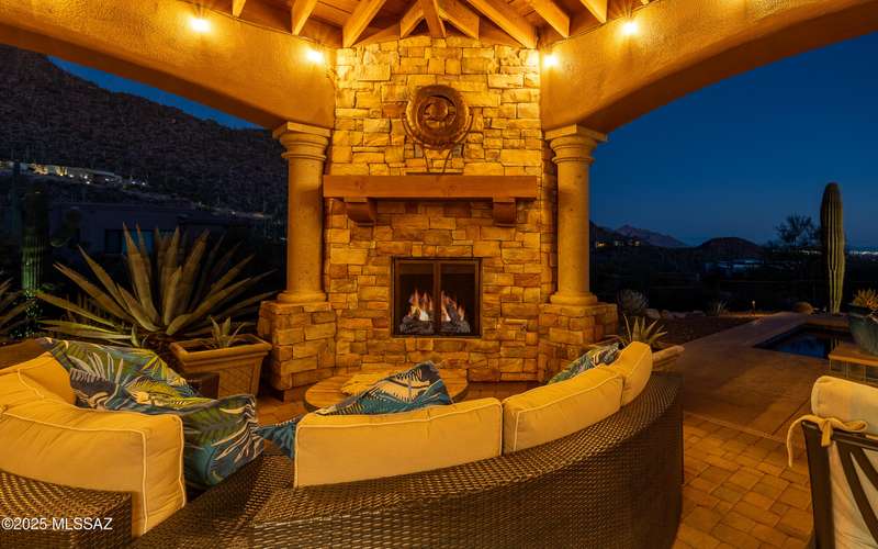 Extraordinary custom Canyon Pass home- exquisite craftsmanship that offers comfortable luxury living. Grand great room concept living - each window highlights a beautiful view. This residence is surrounded by the beauty of the Tortolita & Catalina Mountains, mesmerizing city lights, sunset glows and beautiful morning sunrises. Sprawling porch/patio sitting areas - relax in the glow of the majestic under porch fireplace, enjoy the relaxing pool, host a BBQ, hypnotize yourself in the city lights. Single story - no steps. Fabulous garage - great for car collectors. 3 beautiful fireplaces - great room, primary bedroom, under porch. If you love cooking you'll love this gourmet kitchen - and the adjoining entertainers bar has old world charm. All bedrooms are oversized w/private baths.