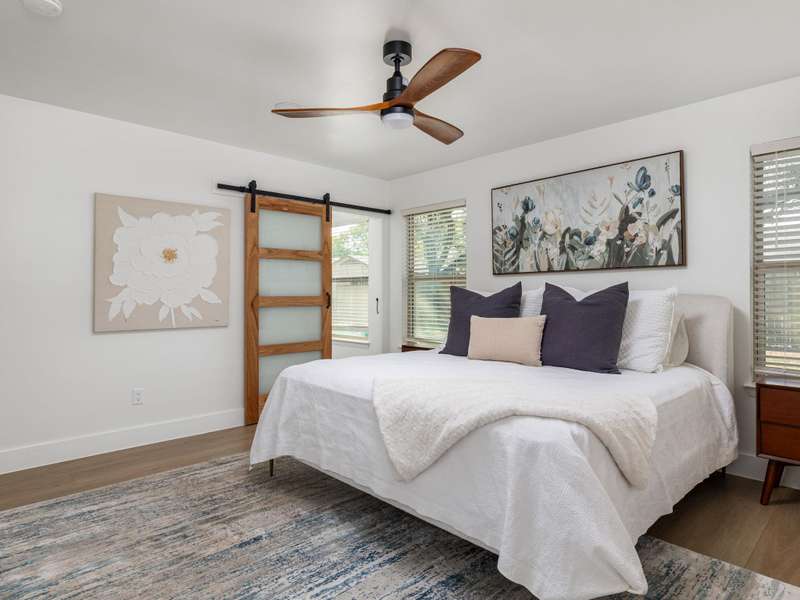 The spacious primary suite includes dual closets, a sliding barn door, and a spa inspired bathroom with double vanities and a walk in rainfall shower. Each room highlights elevated details, from recessed lighting and tall baseboards to a clean, neutral palette.