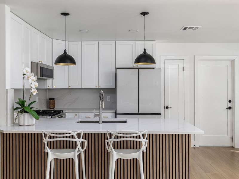Step inside to tall ceilings, exposed wood beams, and wide plank luxury vinyl flooring that gives the home a bright, modern feel. The light filled living room features a Venetian plaster fireplace and flows seamlessly into the updated kitchen with quartz countertops, a pot filler faucet, stainless steel farmhouse sink, pantry, and custom lighting.