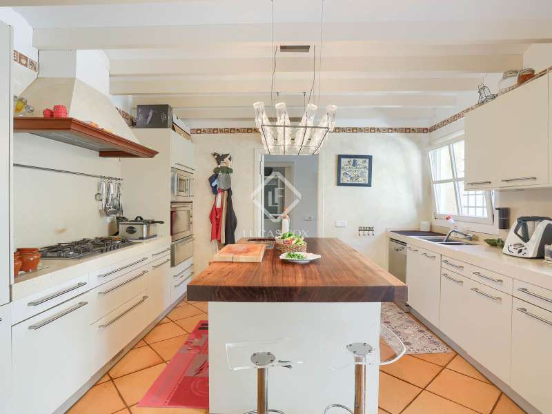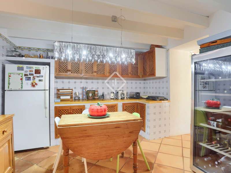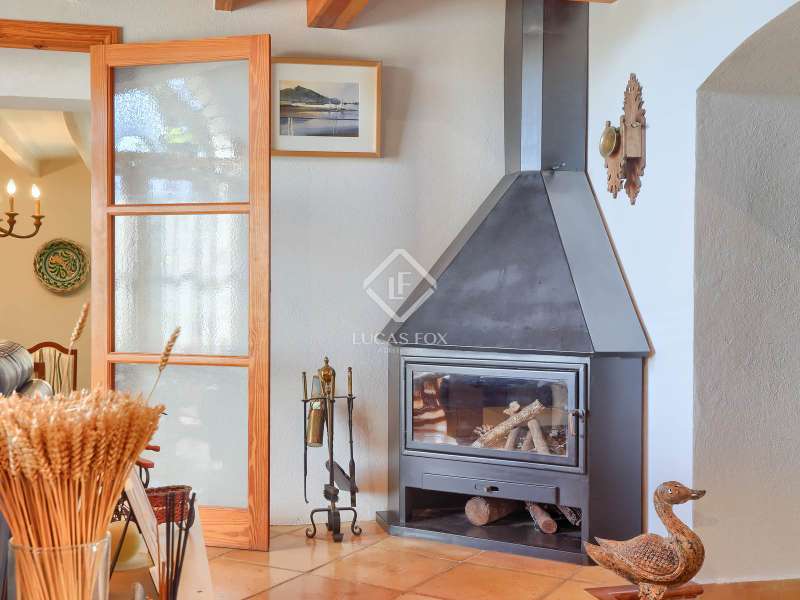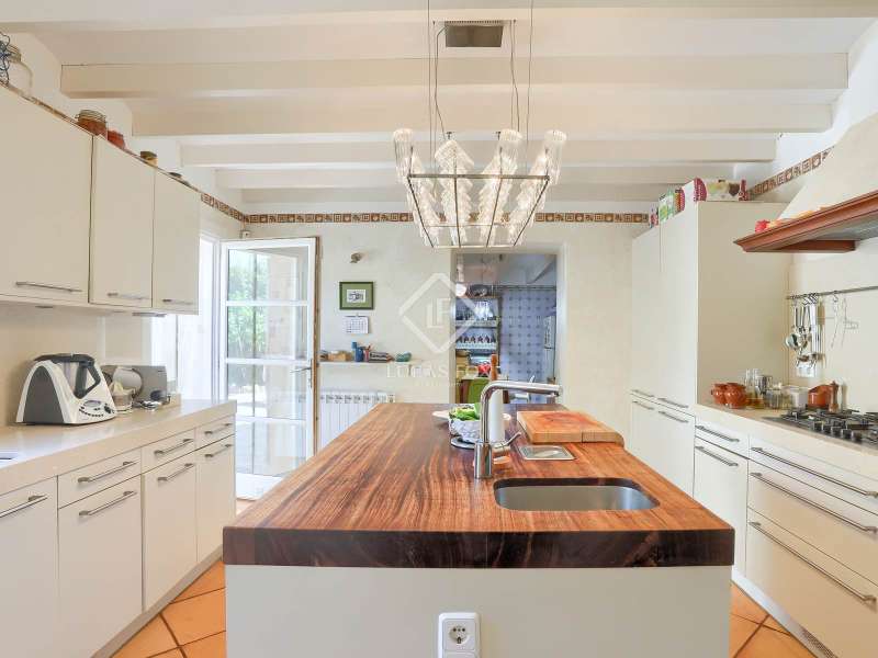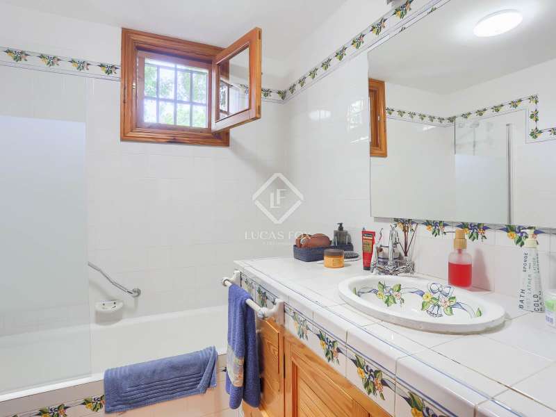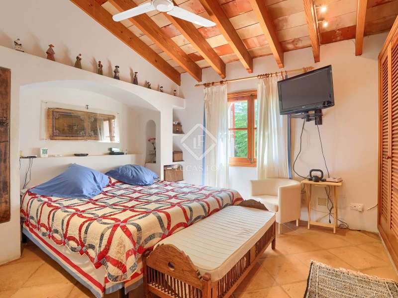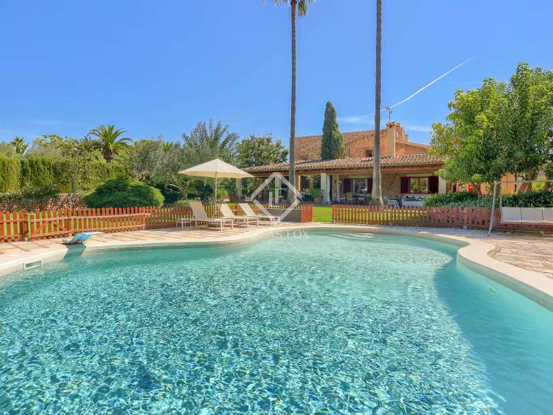 This beautiful finca is located in a prime area of Santa Maria, just minutes by bike from the village center and only a 15-minute drive from Palma. Combining rustic charm with modern comforts, the property offers a serene family-friendly lifestyle surrounded by nature. The main house features five bedrooms and four bathrooms, plus a maid's room with its own bathroom and a separate studio apartment with a kitchen and bathroom—ideal for guests or staff. On the ground floor, there is a cozy living room with a fireplace, a dining area, a fully equipped kitchen, and additional spaces designed for relaxation. One of the upstairs bedrooms boasts a large southwest-facing sun terrace with stunning panoramic views of the Tramuntana mountains. The home is equipped with oil-fired central heating, air conditioning in the warmest rooms, four fireplaces, and solar panels for energy efficiency. Outdoors, the property truly shines with beautifully landscaped gardens, an organic vegetable plot, a barbecue area, a traditional wood-fired oven, and a charming guest house with separate access and a pond. The pool area, framed by tall palm trees, includes a dedicated children's play area and is perfectly positioned beside covered terraces, creating an ideal outdoor living space for the warmer months. Additional features include automatic irrigation, mains electricity, a private well, two driveways, a garage for three cars, a storage room, and ongoing renovations in two areas to further modernize the property.
