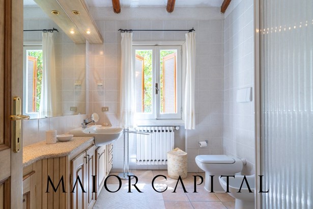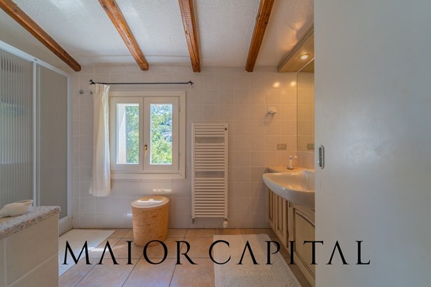 The villa has a garage and ample space for guests. It is spread over two floors, with a semi-basement floor housing five bedrooms with independent bathrooms, ensuring maximum comfort and privacy for all guests. The semi-basement floor is reached via an external staircase adorned with an archway of flowers, leading to a large courtyard that extends onto the property's grounds.