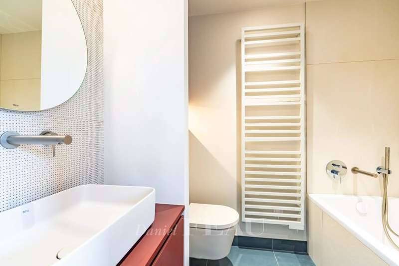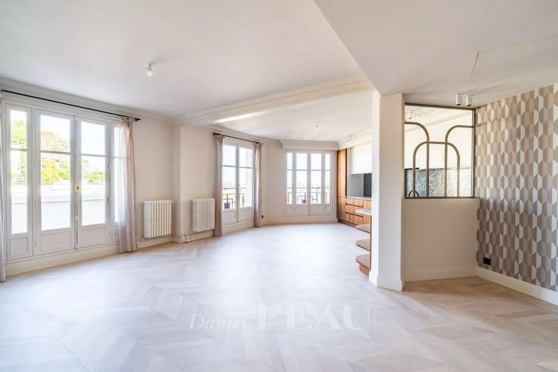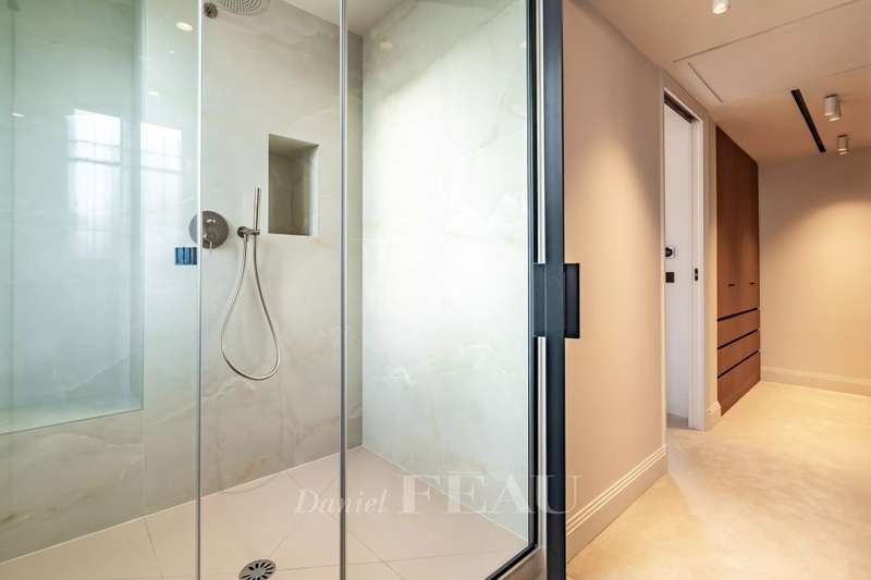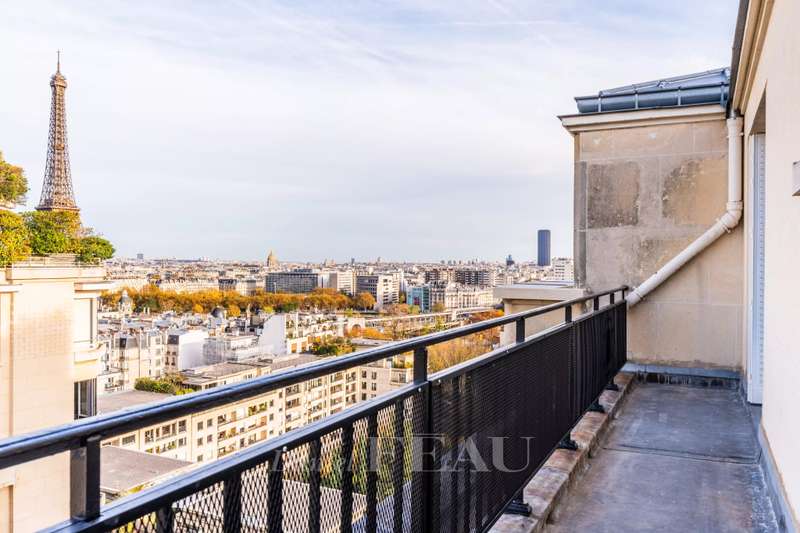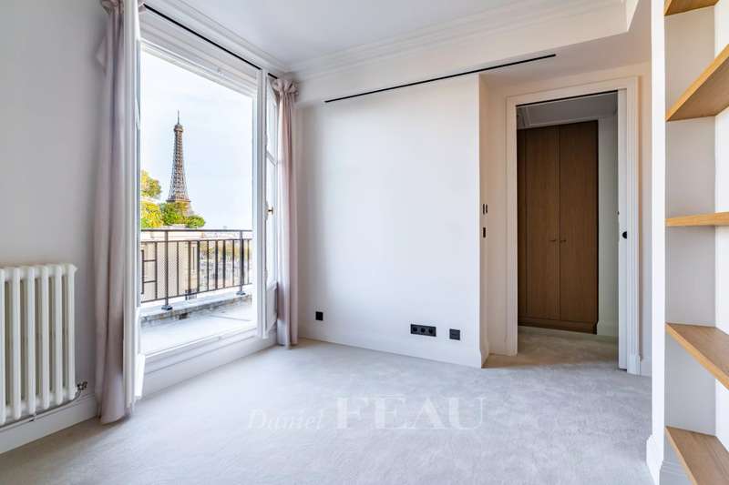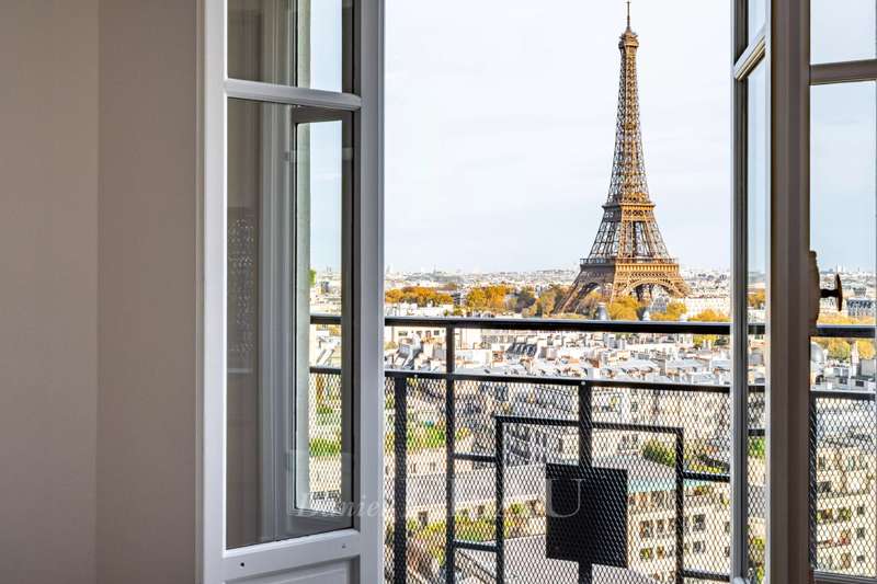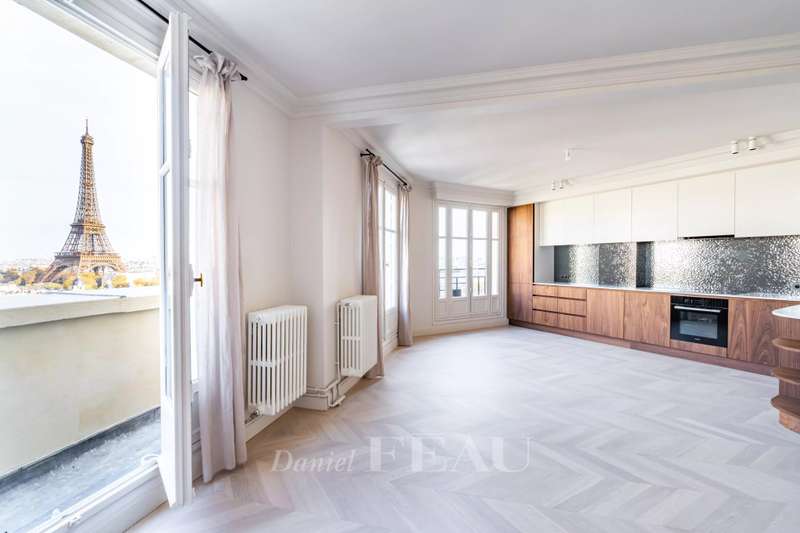 This exceptional apartment on the 7th and top floor of a luxurious Art Deco building with a lift commands a picture-postcard view of the Eiffel Tower. Renovated throughout and opening onto balconies, it includes a bright living/reception room with a fitted and equipped open-plan kitchen, a master suite with a dressing room; a shower room and a wc, two bedrooms (one with a bathroom and wc), and a separate wc. Air conditioning. A cellar may be acquired at extra cost. The co-ownership benefits from a conciergerie and a fitness room, as well as a guest bedroom available for rental.