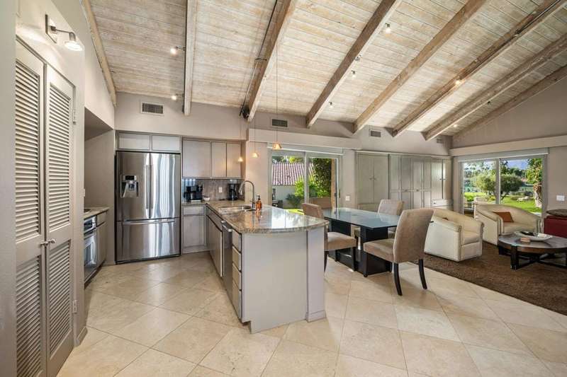 Welcome to this beautifully maintained, turnkey-furnished one-bedroom Tennis Villa, ideally located inside prestigious Mission Hills Country Club. Perfectly positioned to capture stunning mountain views, this charming residence offers a warm and inviting interior featuring soaring wood-beamed ceilings, custom flooring, upgraded lighting, and double-pane sliding glass doors that fill the space with natural light. The well-appointed kitchen includes granite countertops and stainless-steel appliances, overlooking a spacious Great Room with a decorative fireplace--ideal for relaxing or entertaining. The generous primary suite provides a peaceful retreat with a built-in desk/entertainment center and an updated en-suite bathroom boasting dual vanities and an oversized walk-in shower. Whether you're seeking a full-time residence, vacation getaway, or investment property, this villa delivers exceptional comfort and style. Mission Hills Country Club offers a variety of membership options for tennis and golf enthusiasts, with world-class amenities including three championship golf courses, 30 tennis courts (grass, clay, and hard), pickleball and croquet courts, a state-of-the-art fitness center, spa services, and a vibrant calendar of dining and social events--all within one of Rancho Mirage's most sought-after communities.