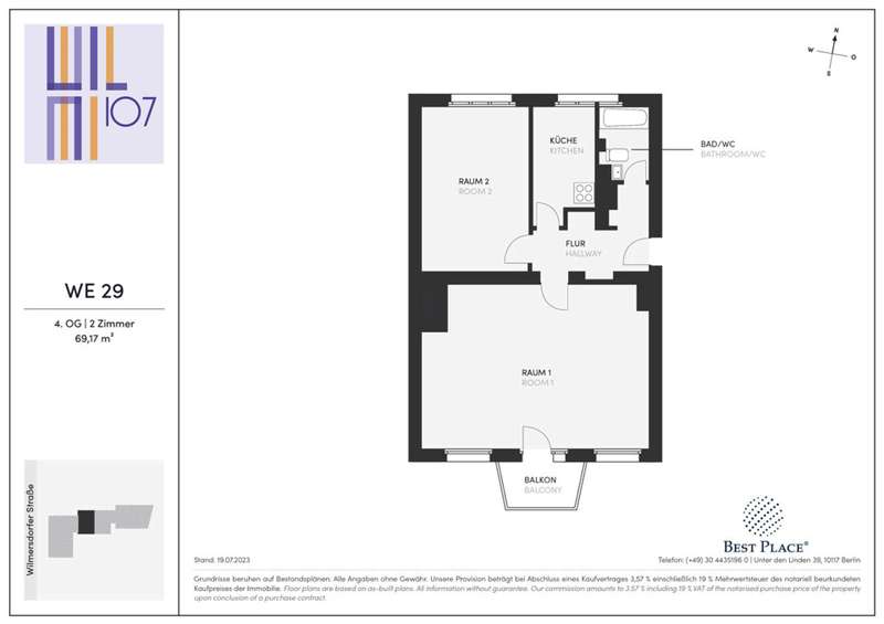 The modern building ensemble Wilmi 107 is located in the sought-after City West between Ku'damm and Kantstrasse. The 2- to 3-room apartments and commercial units are solidly rented and most have balconies or loggias and bathrooms with access to natural ventilation and light. Efficient floor plans, practical apartment sizes and elevator access make them lucrative investments. The offered apartment WE29 is located on the 4th floor. With two rooms and approx. 69,17 m², it has a particularly sought-after apartment size. A balcony guarantees relaxing hours in the fresh air and a bathroom with natural light and bathtub provides comfort in everyday life. The apartment is ideal for singles and couples of all ages and will also rent very well in the future.