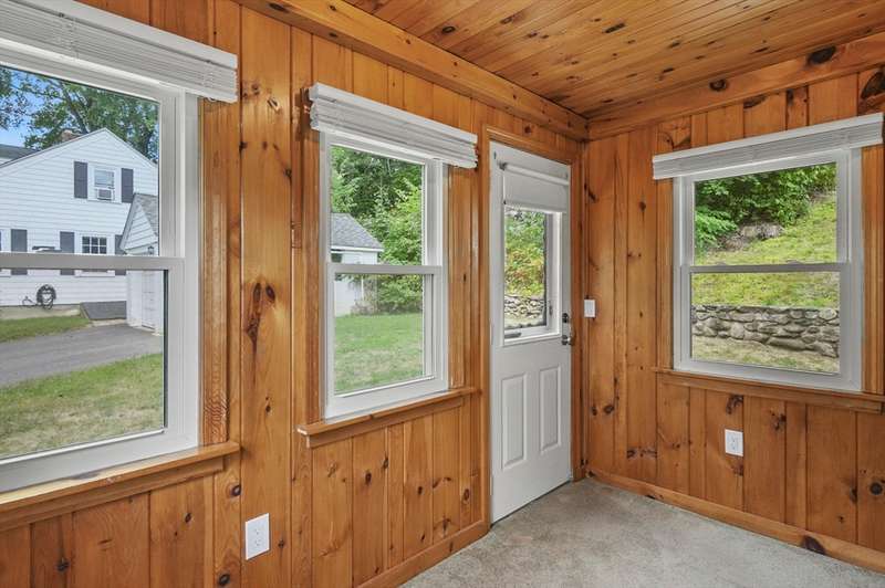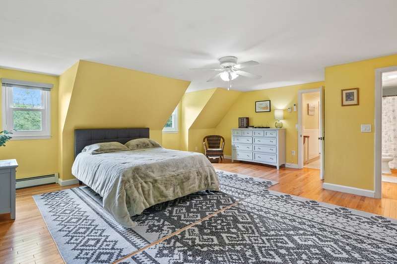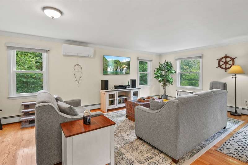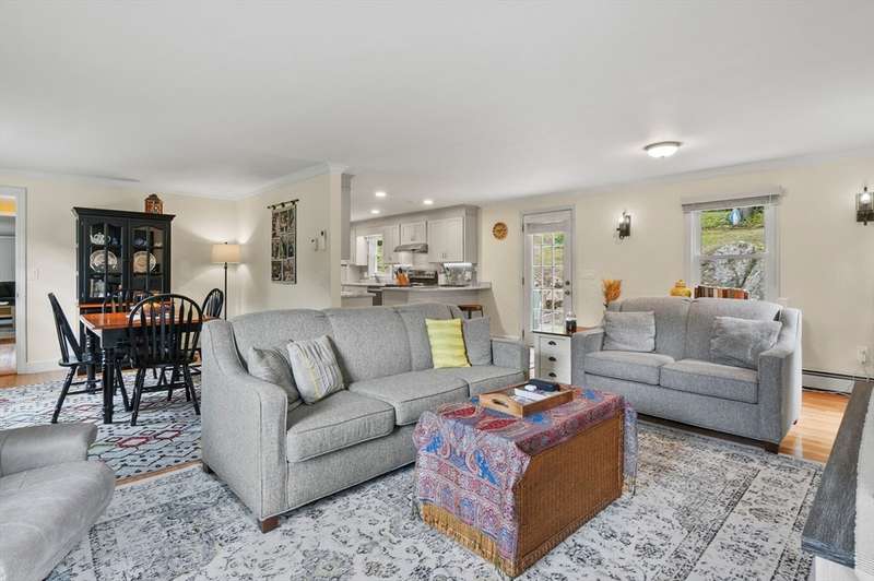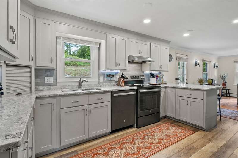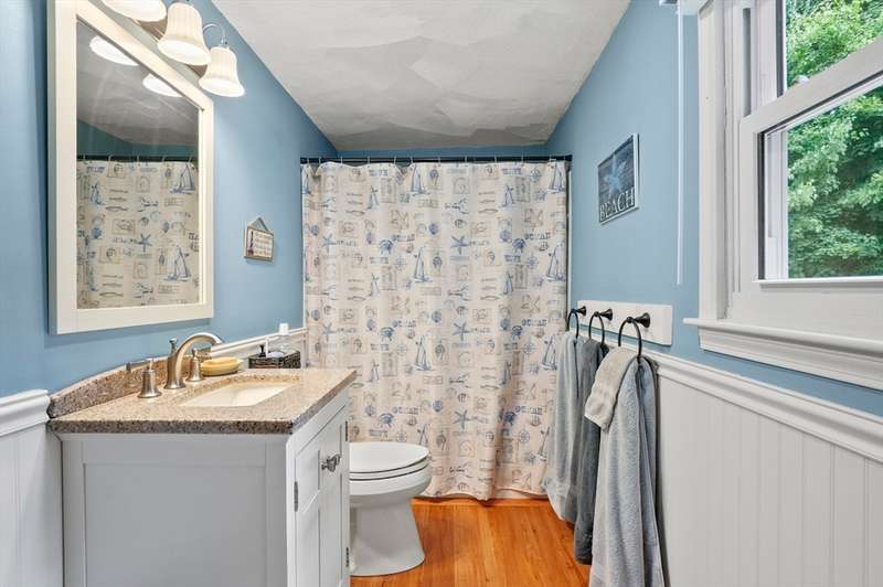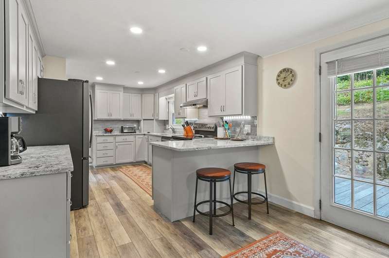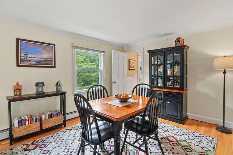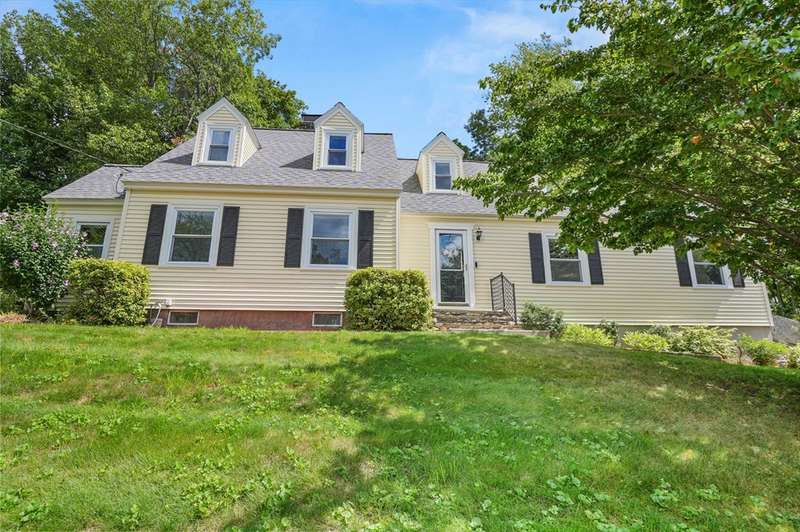 Welcome to this inviting 5 bedroom Cape offering comfort, style, and room to grow. Inside, hardwood floors flow through the dining room, cozy family room with deck access, and spacious living room with a warm fireplace. The kitchen is a true highlight with stainless steel appliances, breakfast bar, tile backsplash, and recessed lighting—perfect for everyday living and entertaining. A sunroom brings in natural light and opens to the backyard. Upstairs, the private primary suite features two closets and an ensuite bath, while three additional bedrooms offer flexibility for family, guests, or a home office. The partially finished basement adds bonus space, laundry hookups, storage, and garage access with a handy workbench. Enjoy outdoor living on the deck overlooking a large backyard with plenty of space to relax, play, or garden. An attached garage (with warm weather screen door) and plenty of parking! This property is great for multi generational living w/1st Floor Bedroom & Bath!