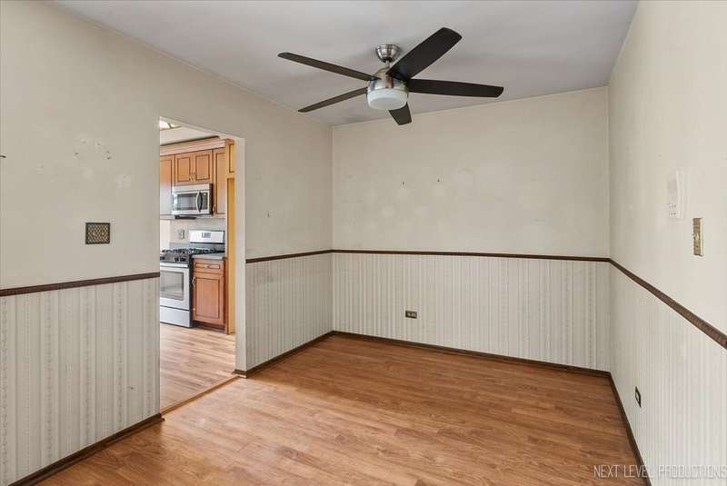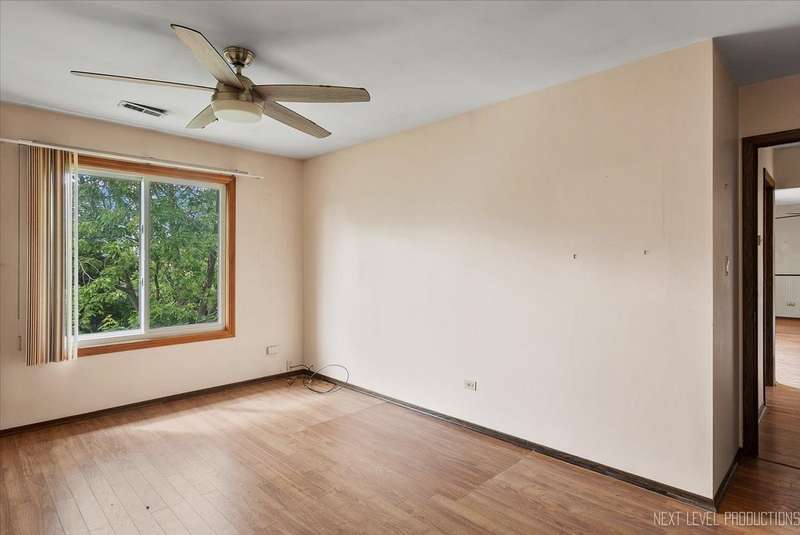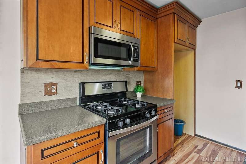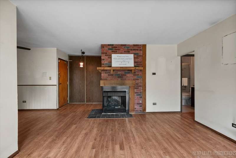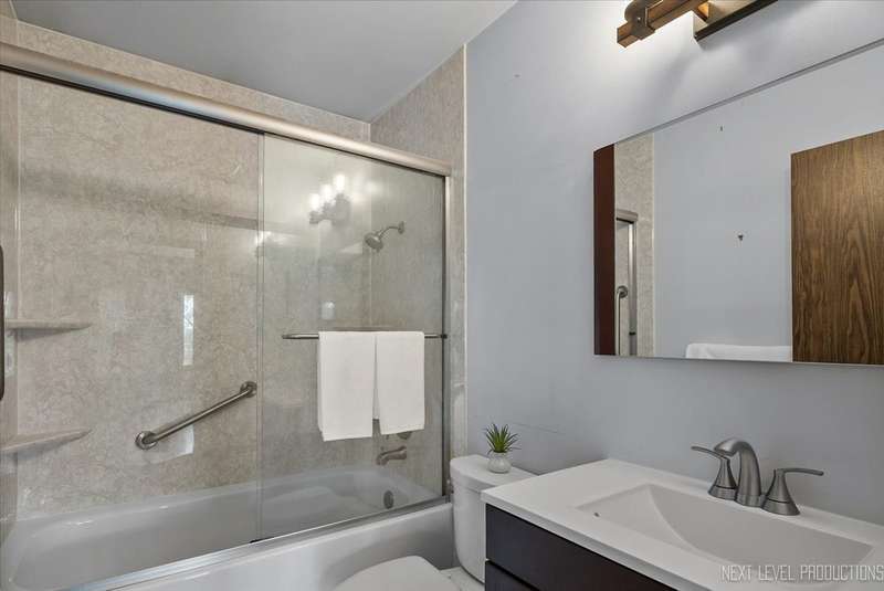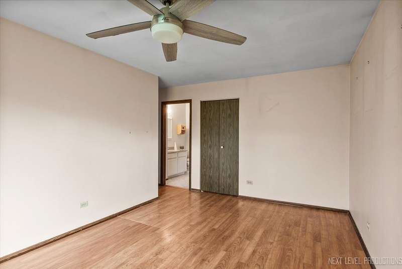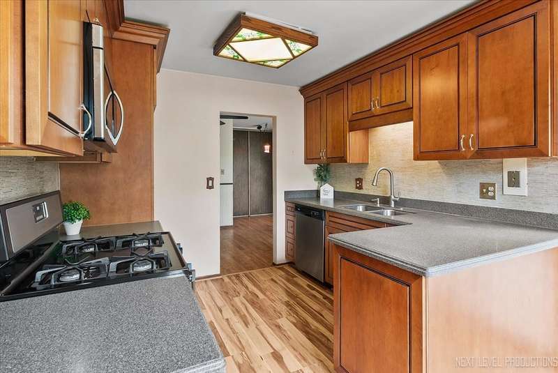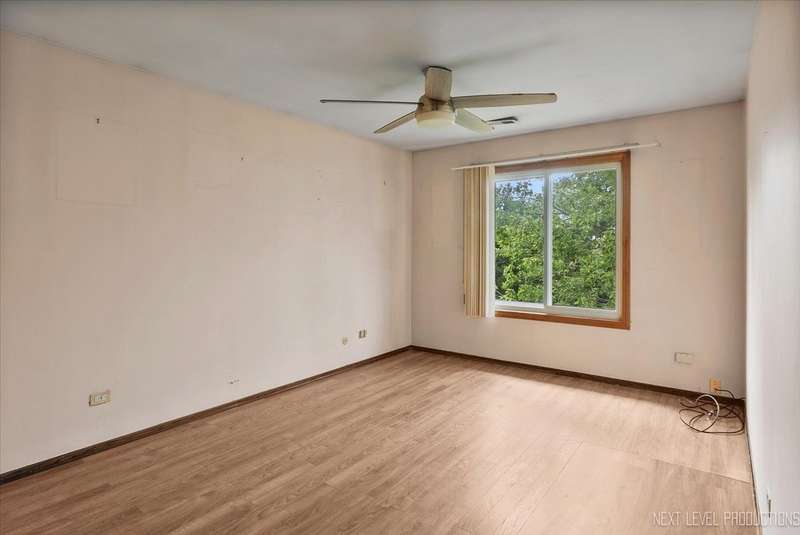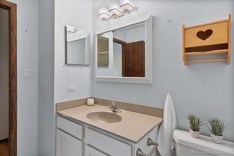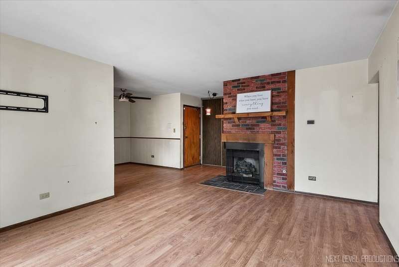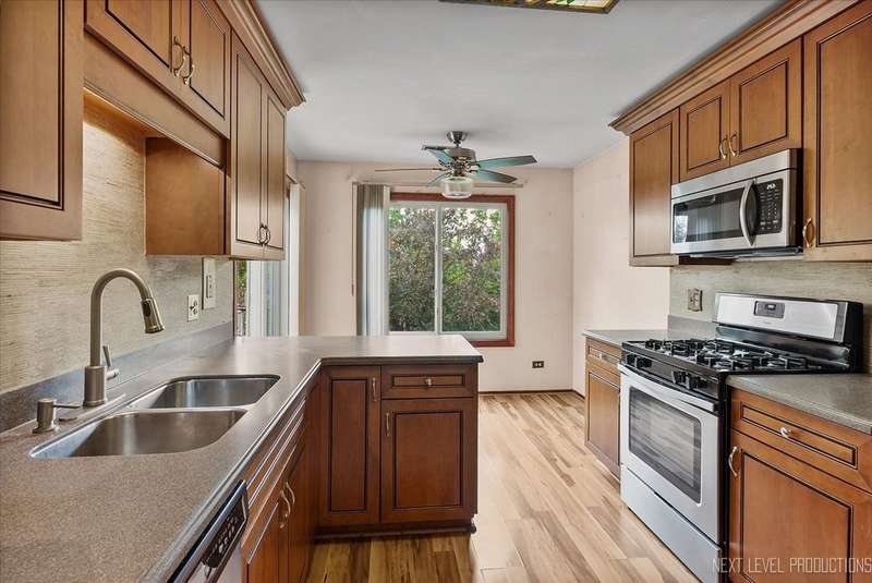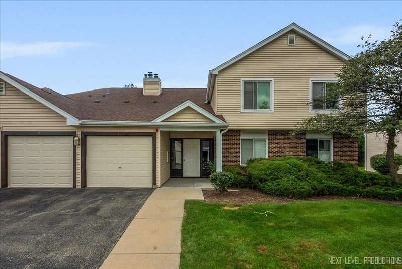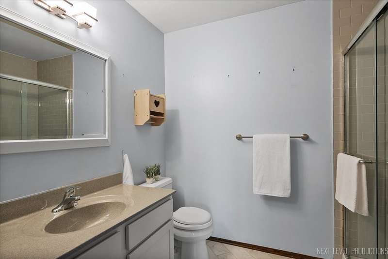 Welcome home to this 2-bedroom, 2-bath condo with no one above you! The bright and airy living room features newer sliding glass Andersen doors that fill the space with natural light, laminate floors, a ceiling fan with light, and a cozy gas log fireplace with gas starter. The dining room is conveniently located just off the kitchen-ideal for entertaining. The updated kitchen boasts stainless steel appliances, newer cabinets with crown molding, a neutral tile backsplash, and a sleek pull-out faucet. The adjoining eating area overlooks the backyard and opens to a composite balcony, perfect for relaxing while enjoying the mature landscaping. The spacious primary suite offers a large walk-in closet, ceiling fan with light, and a private renovated bath featuring a stylish gray-and-white diagonal tile design, vanity with white cabinets, newer lighting and mirror, and a step-in shower with glass doors and built-in towel bar. The second bedroom includes a generous closet and ceiling fan, with the updated guest bath just across the hall-complete with gray-and-white finishes, tile flooring, a shower/tub combo with a grab bar, and modern vanity with lighting. Additional conveniences include an in-unit laundry room with gas hook-up and white cabinetry for extra storage. All sliding glass doors and windows have been replaced with high-quality Andersen windows and sliding doors for peace of mind and energy efficiency. Other newer updates include the water heater, and garage door. Location is a dream-just over a mile to I-355, and minutes from shopping, dining, and everyday amenities.
