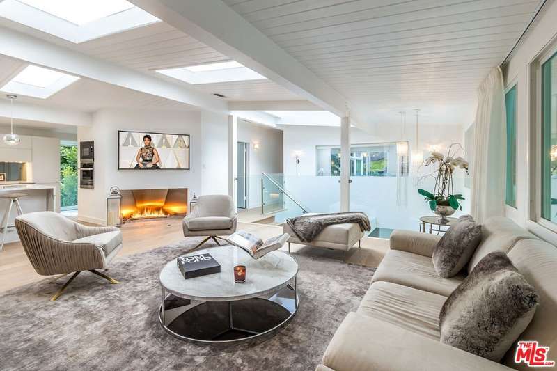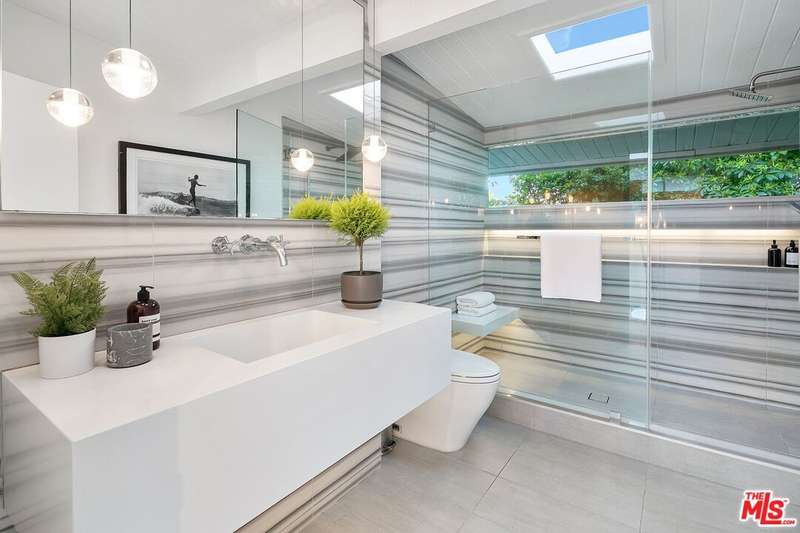 Very special Mid-Century Oasis, formerly leased to several A-List celebrities. Nestled in a small cul de sac just 2.5 minutes behind The Beverly Hills Hotel, close to Sunset Blvd. This home has great energy and feels larger due to open floor-plan with excellent indoor/ outdoor flow and tons of natural light! 9 sky-lights, plus 3 oversized fireplaces. Large sumptuous Primary Suite w/ luxuriously appointed bath, plus 2nd bedroom both feature walls of glass which open out to a dramatic 50 ft. Cascading Waterfall, pond, lush yard & Fire Pit, with trails leading to hilltop Yoga area. Updated newer Kitchen w/ porcelain counters, custom cabinetry, & top of the line MIELE appliances. Spacious, light-filled living & dining area set atop the trees. Downstairs features a private 3rd bedroom w/ separate gated entrance, perfect for guests, teenager, office or live-in. Media Den with Bar and fantastic sunken "conversation pit", around a fireplace, perfect for movie nights or conversations. Step right out into the heated pool and BBQ area . Private and Tranquil with only 2 homes on street and ample parking rarely found in the hills. Private, walled and gated entry, ready to move in! An absolute gem!